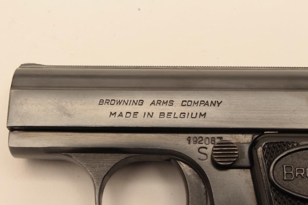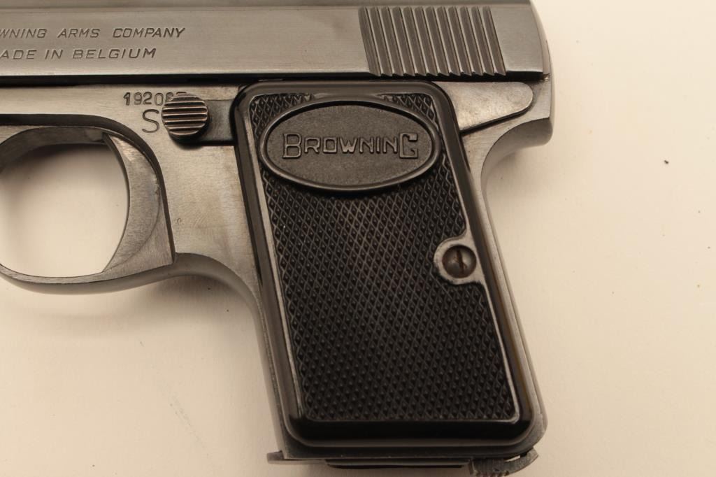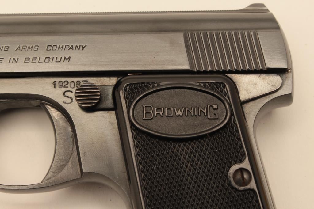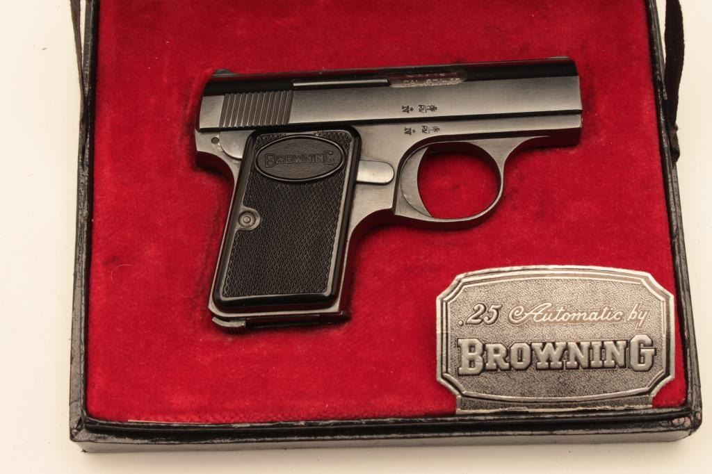 Browning .25 caliber pocket Belgium made in box, S/N 192087. Fine to excellent condition. 98%-99%. Very slight possible use and minor storage. (C&R/PPT) Est.: $250-$500