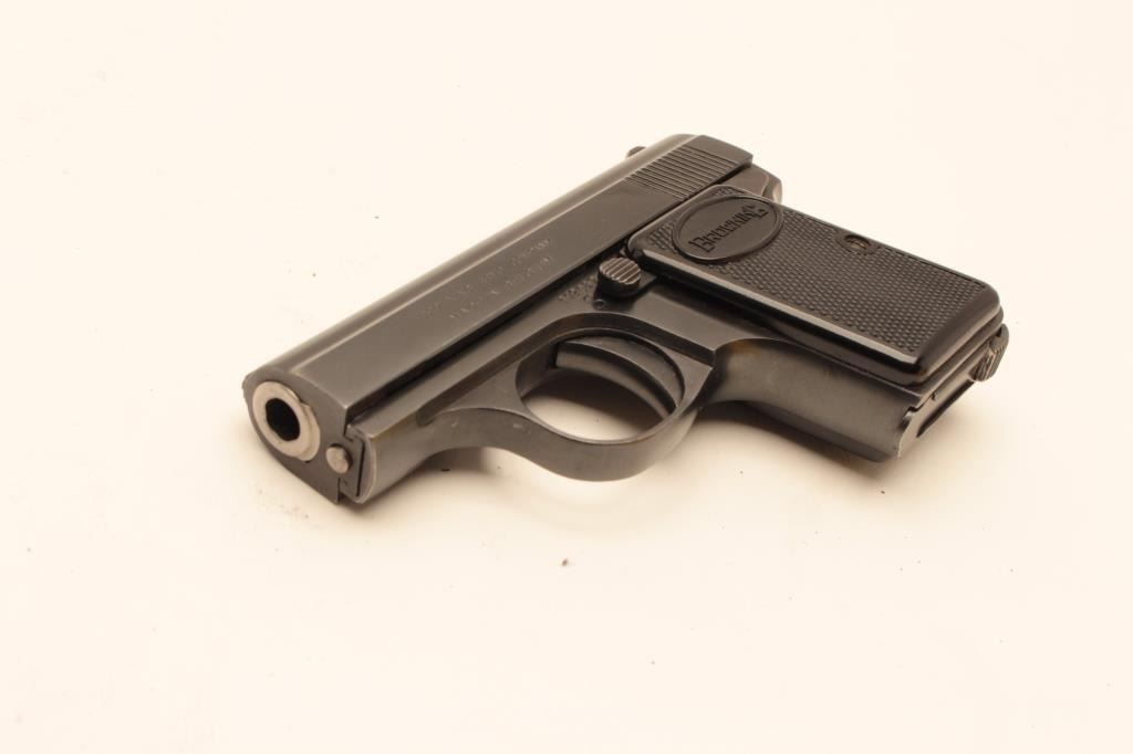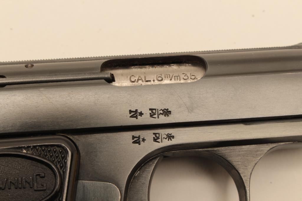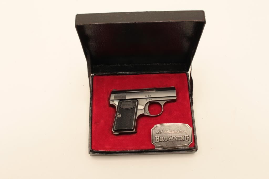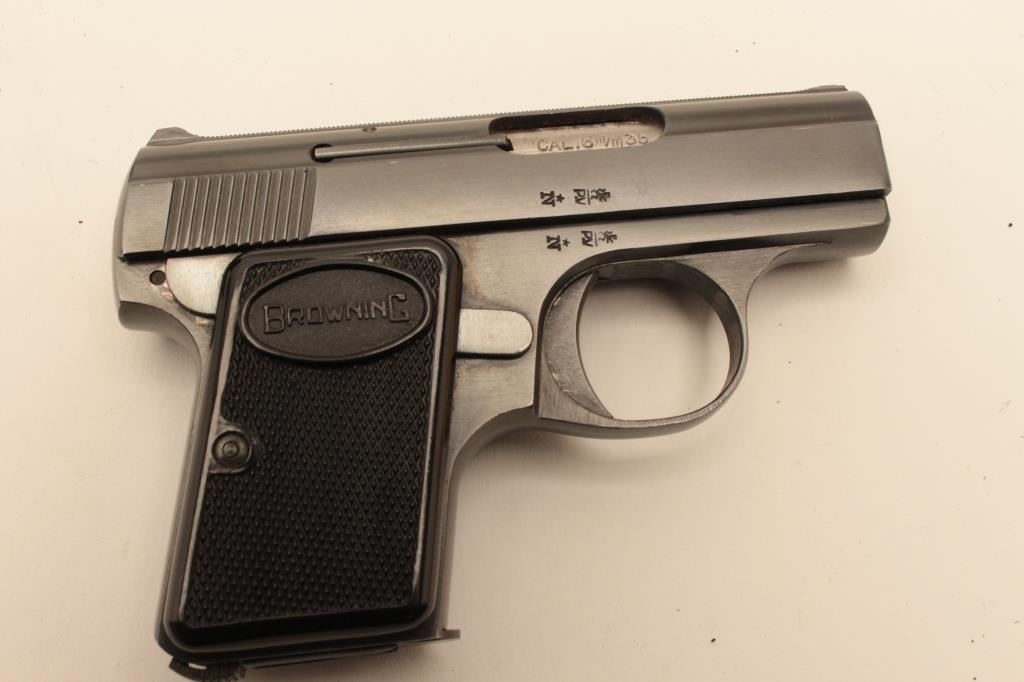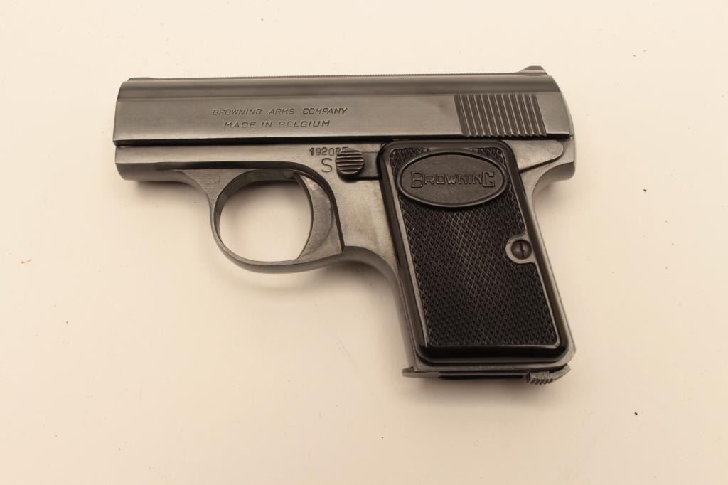 Browning .25 caliber pocket Belgium made in box, S/N 192087. Fine to excellent condition. 98%-99%. Very slight possible use and minor storage. (C&R/PPT) Est.: $250-$500