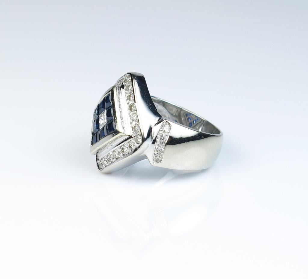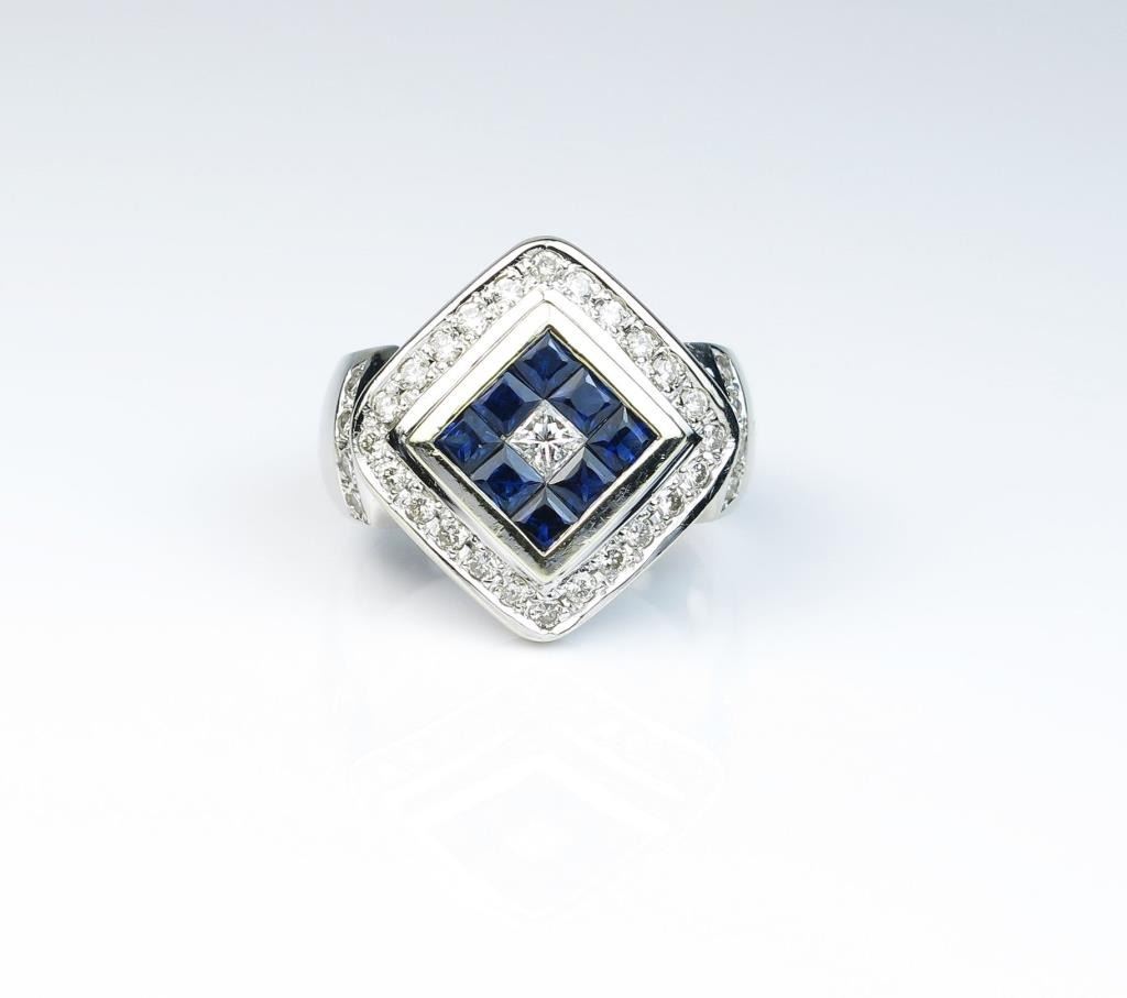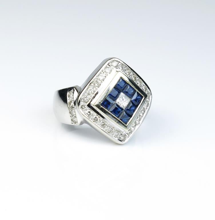 Fine Blue Sapphire and Diamond ring with striking design featuring a princess cut Diamond center surrounded by 8 fine princess cut Sapphires framed by 32 round cut Diamonds with F-G colors and VS clarity total Lot Title combined gem weight approx. 1.50 carats set in 14 karat white gold. Retail $2,500-$3,500 Estimate $1,200-$1,800