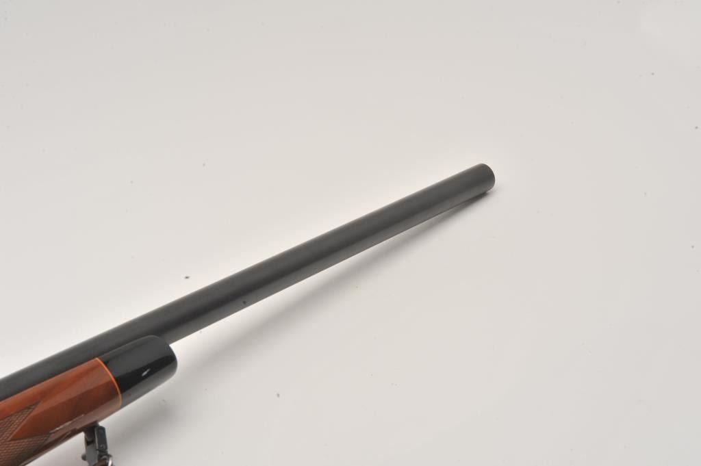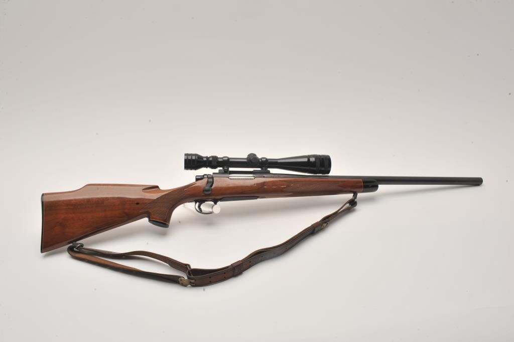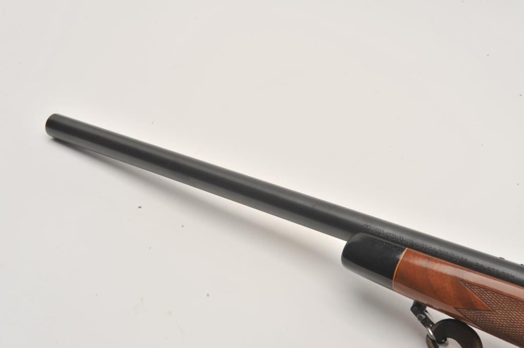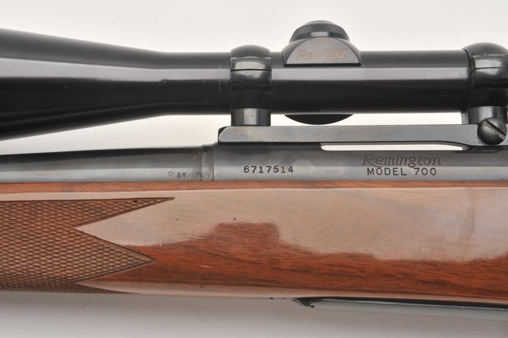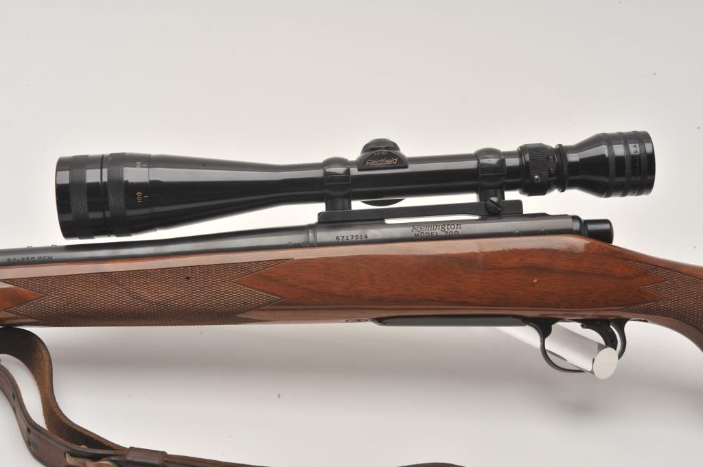 Remington 700 .22-250 cal, #6717514, 24" heavy barrel, blued finish, wooden stock with jeweled bolt and leather sling. Rifle is in fine to excellent condition overall, showing nearly all it's original finish. Stock is Lot Title fine overall, with minimal handling marks, bore is bright, action is crisp. Mounted with a Redfield 6x-18x scope. (Modern /PPT) Est. $500-1000
