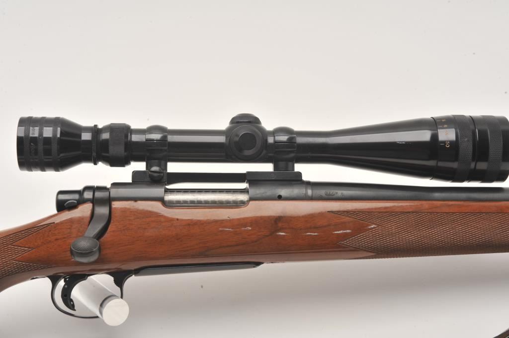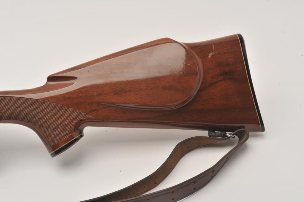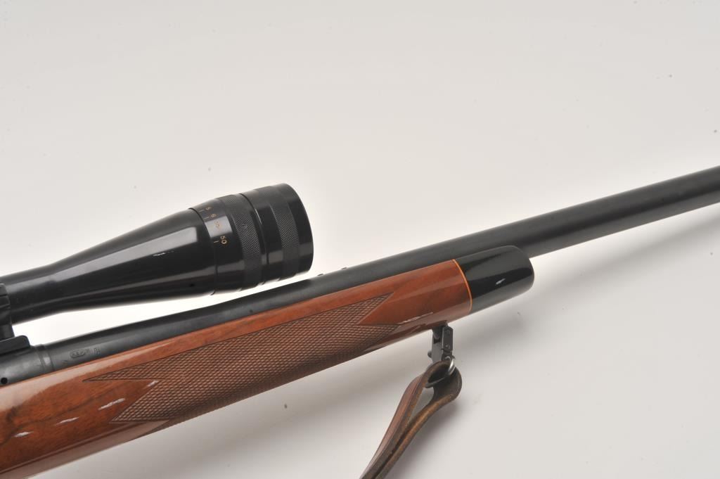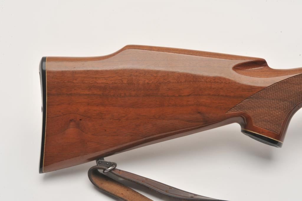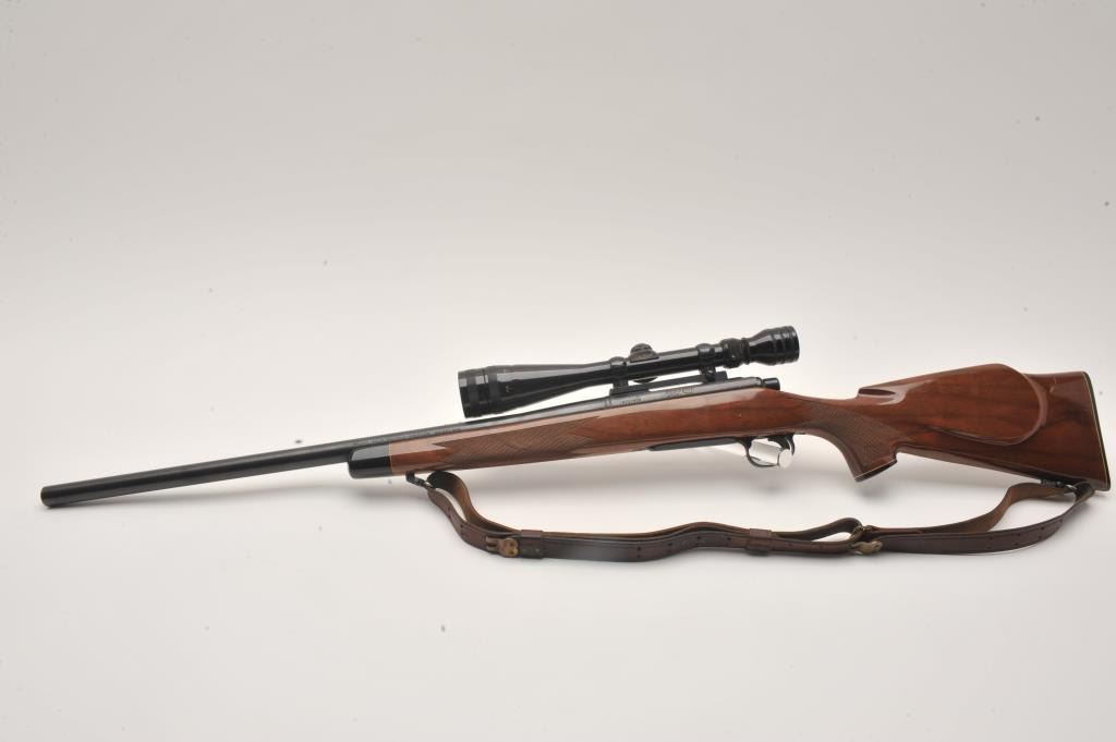 Remington 700 .22-250 cal, #6717514, 24" heavy barrel, blued finish, wooden stock with jeweled bolt and leather sling. Rifle is in fine to excellent condition overall, showing nearly all it's original finish. Stock is Lot Title fine overall, with minimal handling marks, bore is bright, action is crisp. Mounted with a Redfield 6x-18x scope. (Modern /PPT) Est. $500-1000