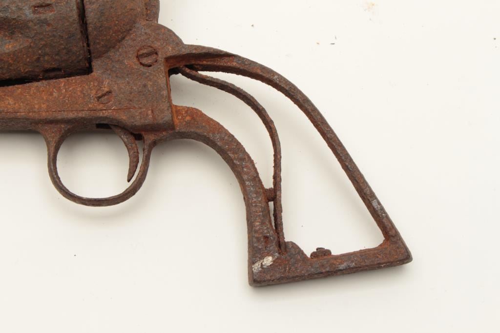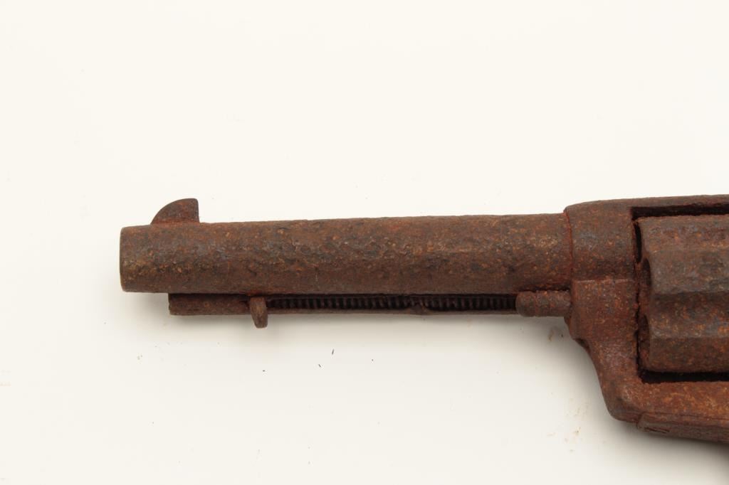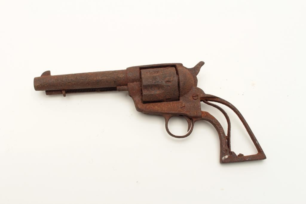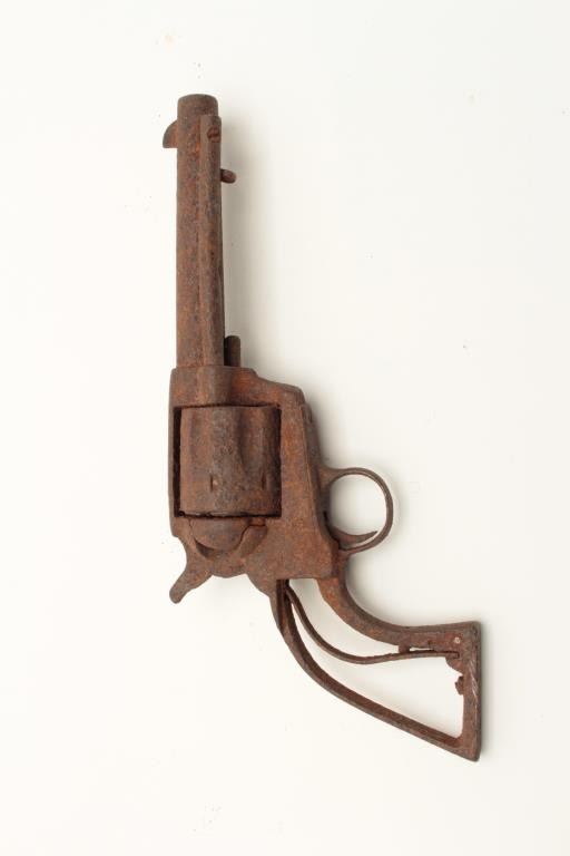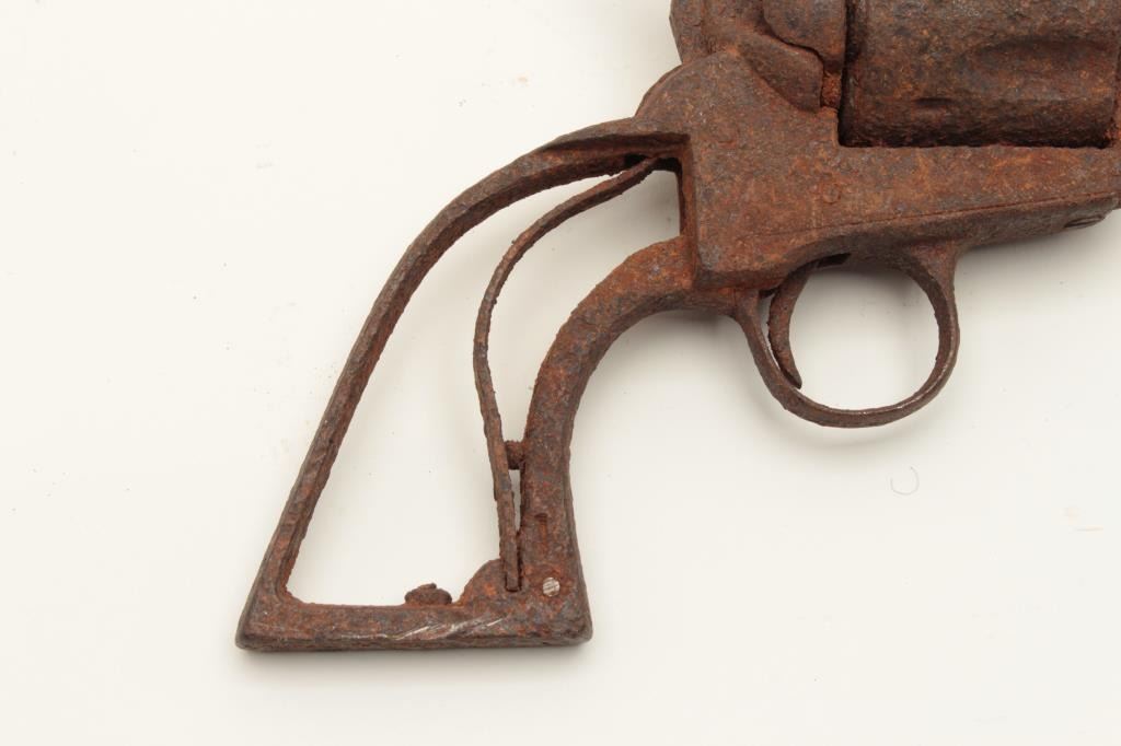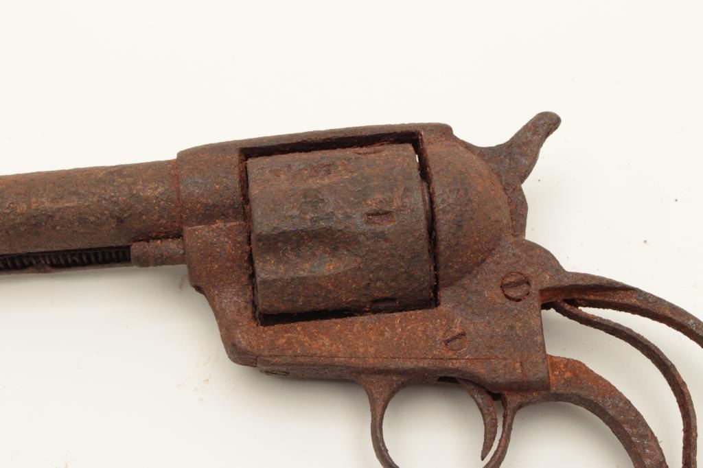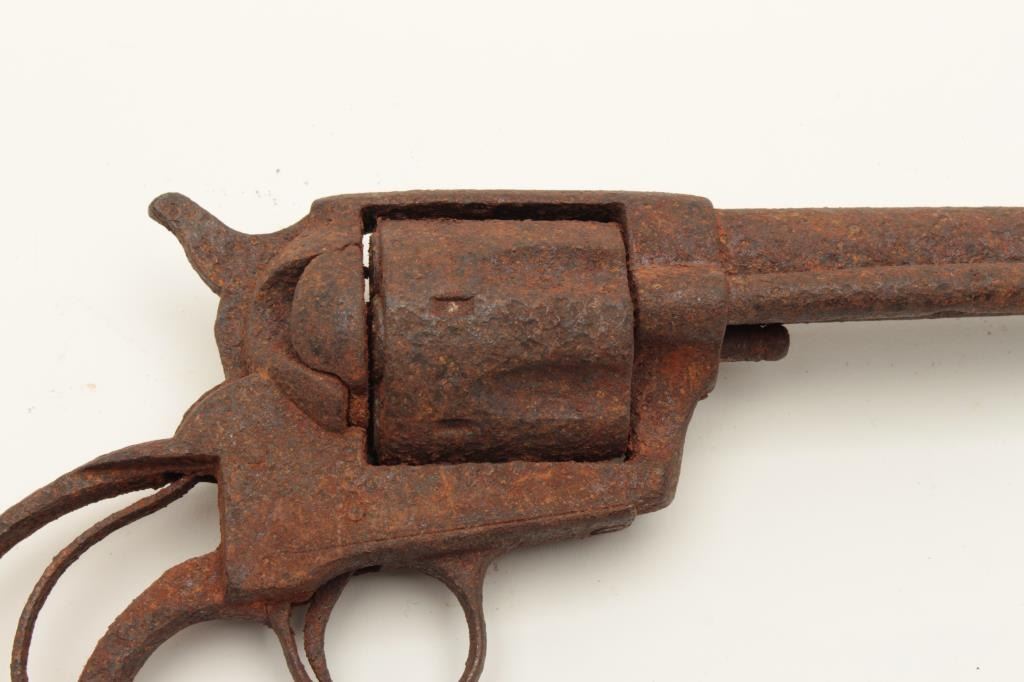 Rusty relic copy of a Colt SAA revolver, no grips, cylinder chambers show fired cartridge shell casings remaining! From the collection of John O. Beckwith. Est.: $300-$600.