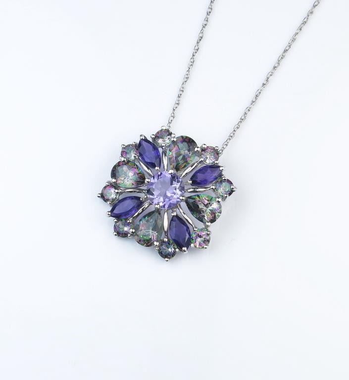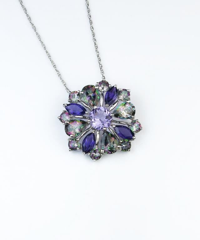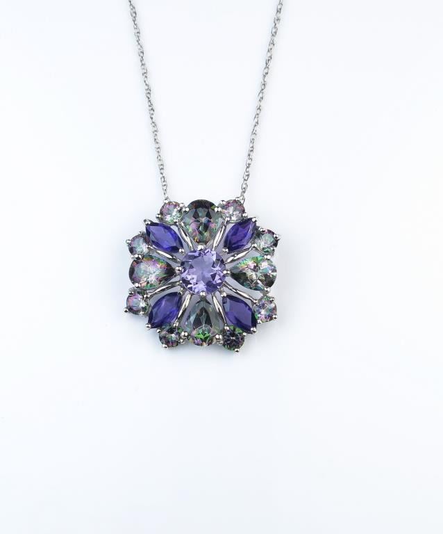 Beautiful flower design pendant featuring over 4.00 carats of Amethyst and Mystic Topaz combination in 10 karat white gold setting. Estimates $800-$1,200