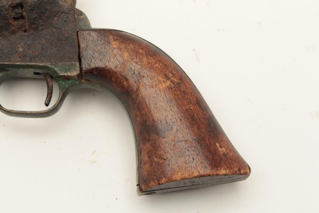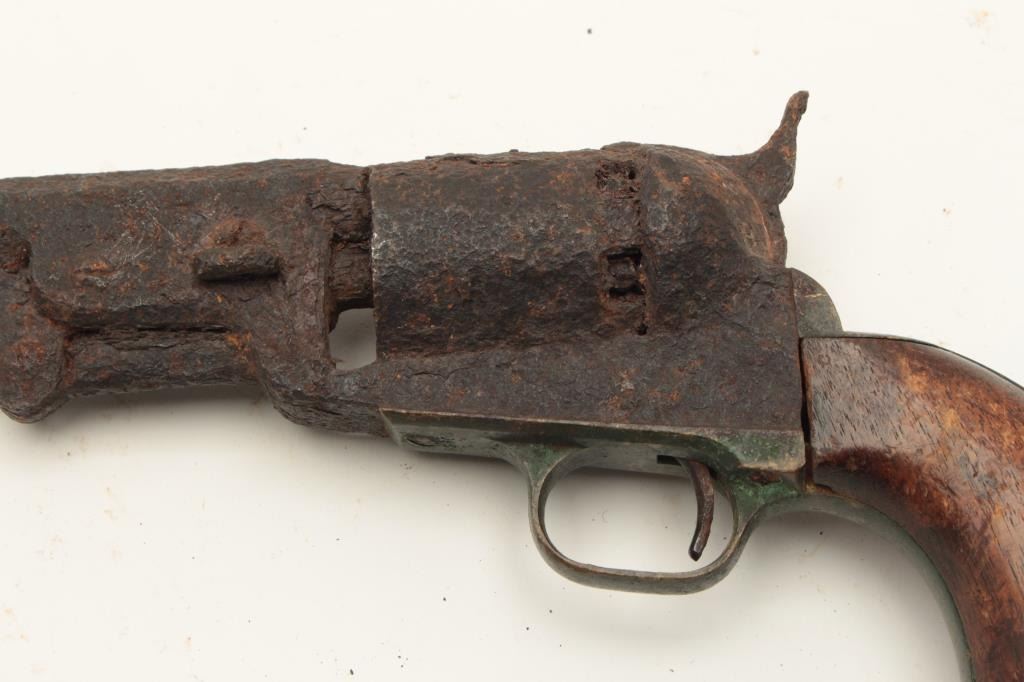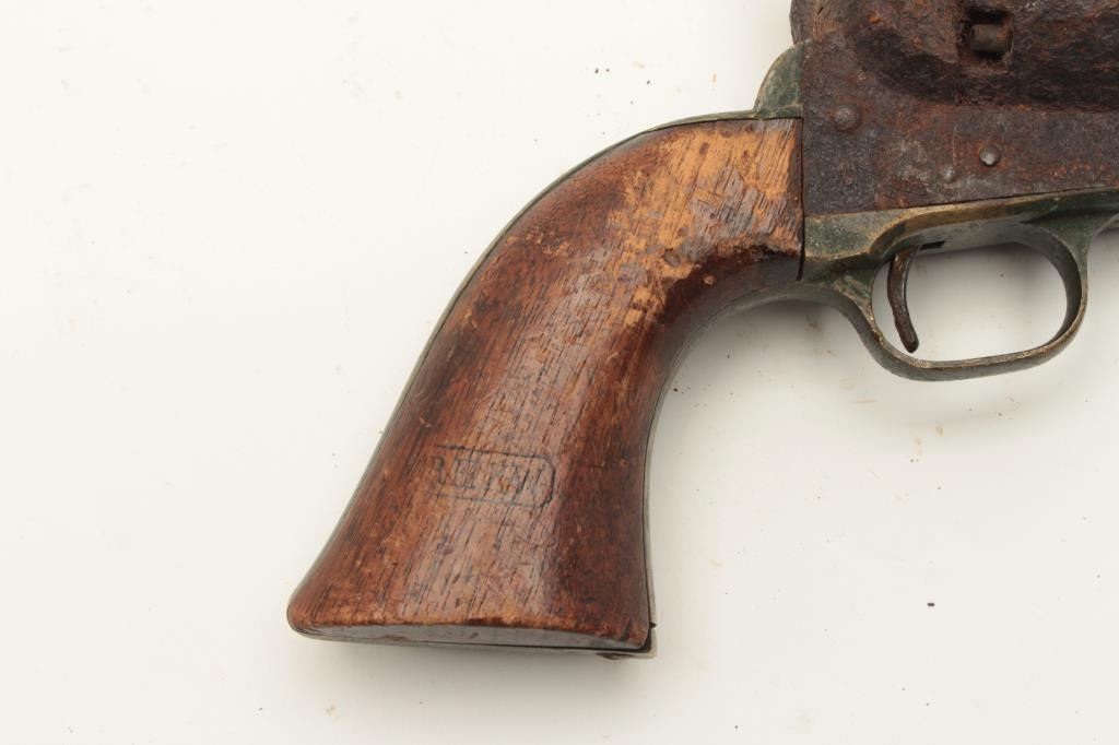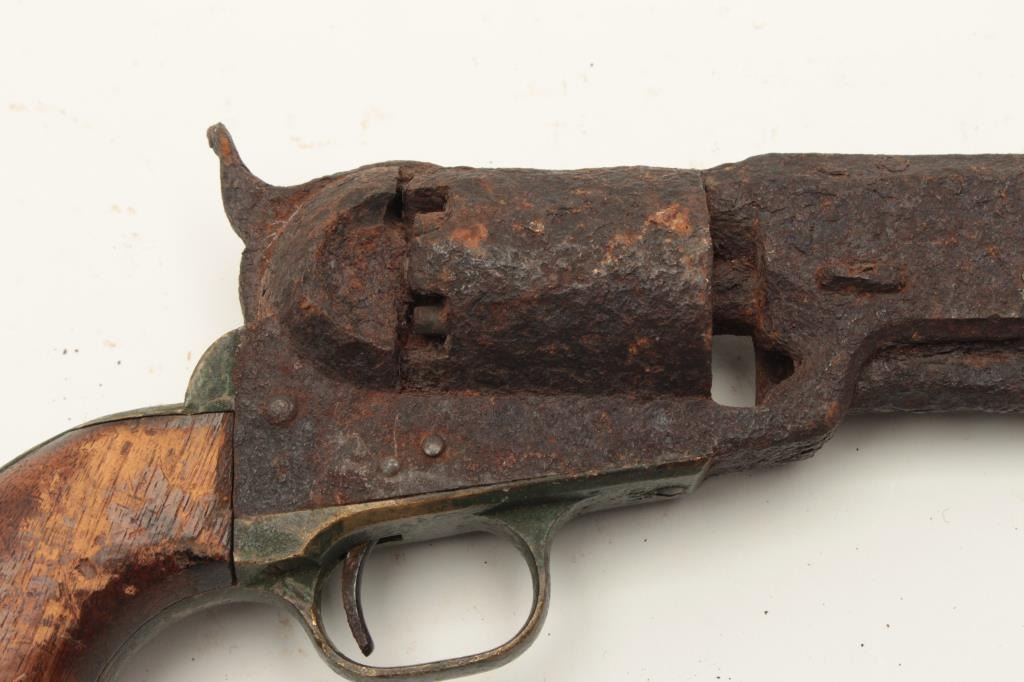 Rusty relic Colt Model 1851 Navy percussion revolver, S/N 62965, heavily rusted overall with fairly complete wood grips that still show remnants of inspector cartouches. From the collection of John O. Beckwith. Lot Title Est.: $300-$600.