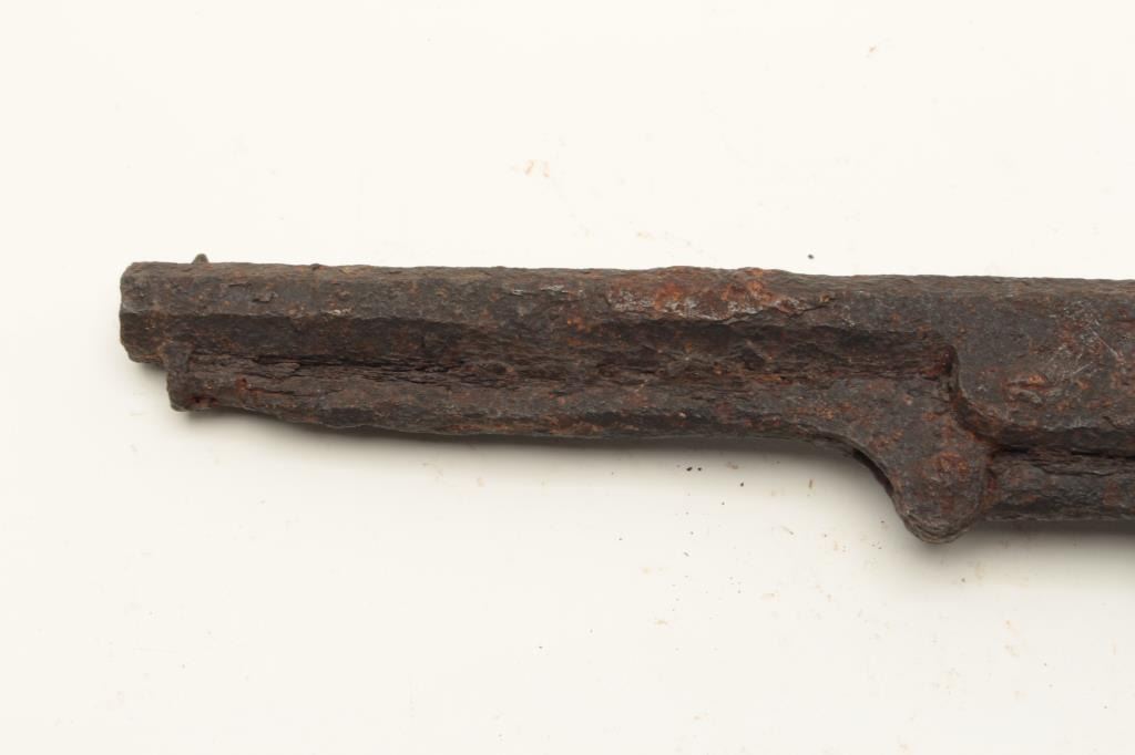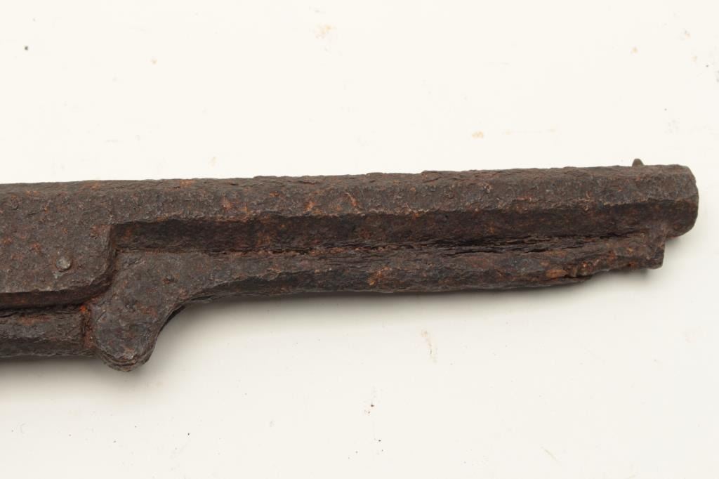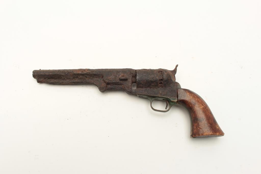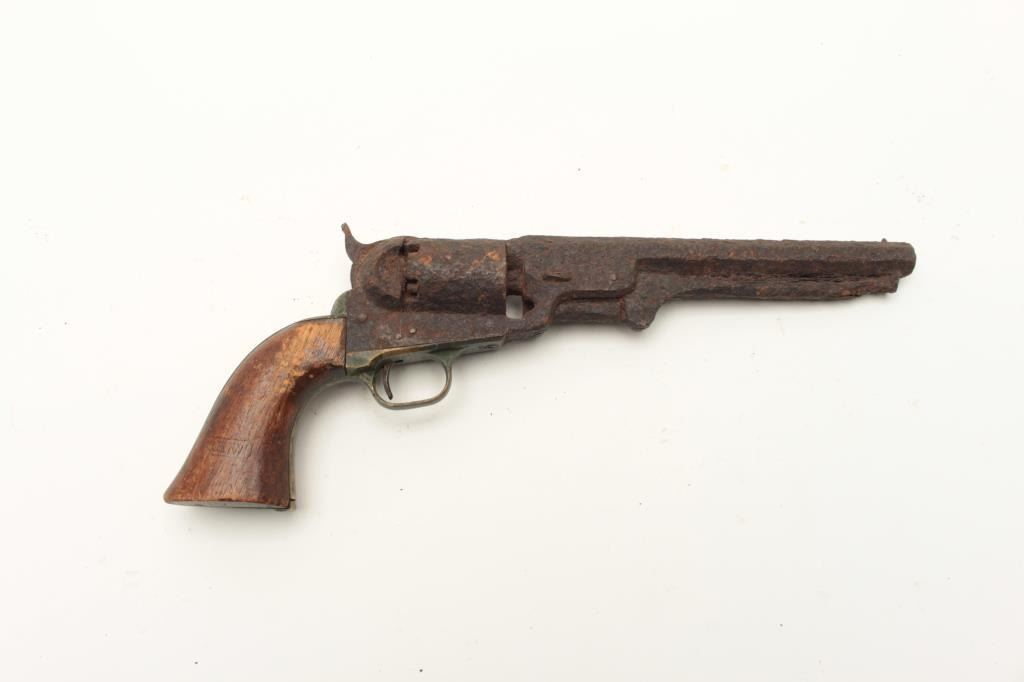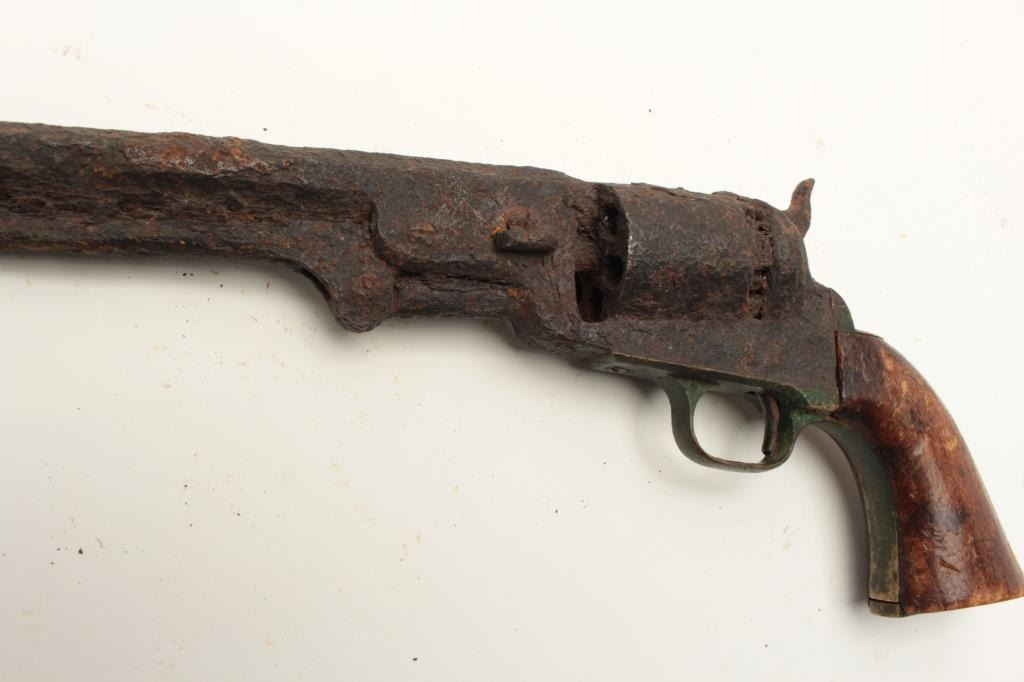 Rusty relic Colt Model 1851 Navy percussion revolver, S/N 62965, heavily rusted overall with fairly complete wood grips that still show remnants of inspector cartouches. From the collection of John O. Beckwith. Lot Title Est.: $300-$600.