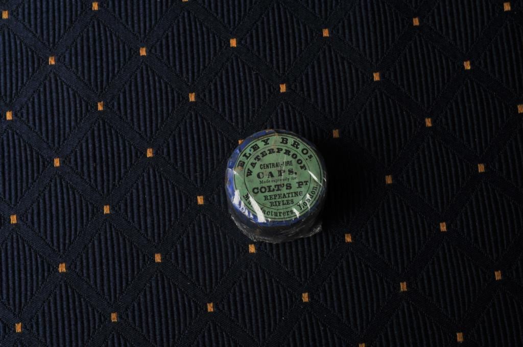 Eley cap tin with label reading “Made Expressly for Colt’s PT Repeating Rifles”. Unopened and near excellent with minor tatters and fading along with slight aging. Est.: $600-$1200