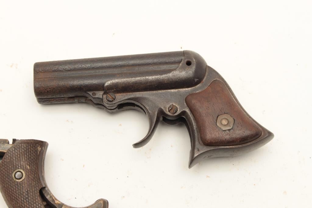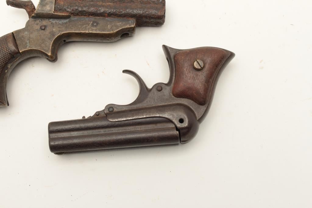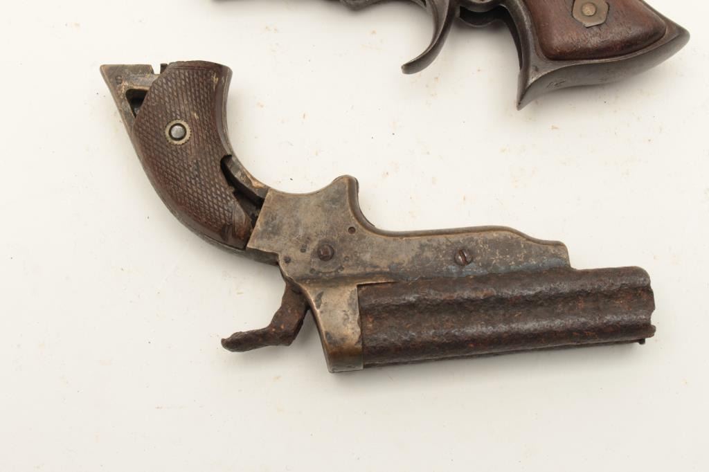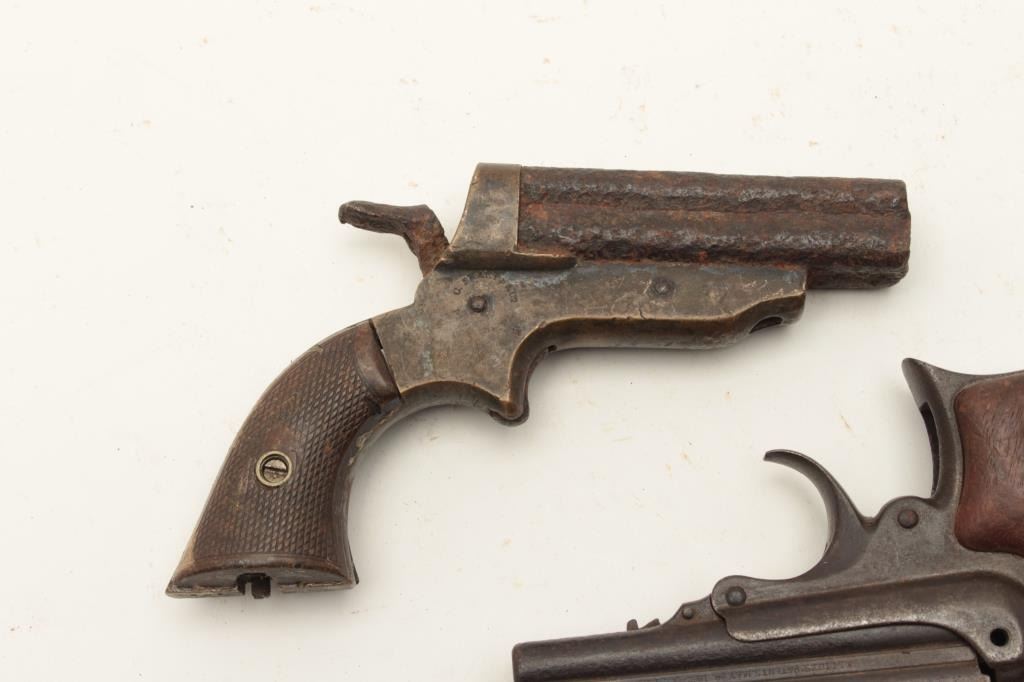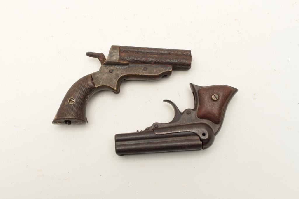 Lot of 2 rusty relic derringers including a Sharps 4-shot with brass frame and checkered hard rubber partial grips and a Remington Elliot Model 4-shot derringer with wood grips. From the collection of John O. Lot Title Beckwith. Est.: $250-$500.
