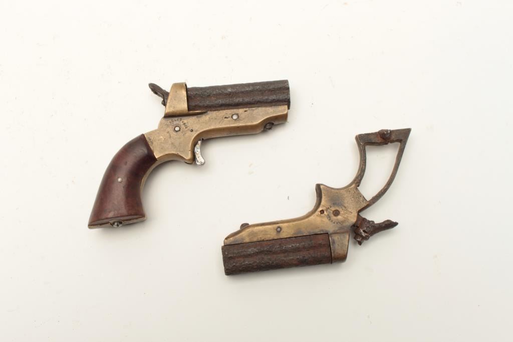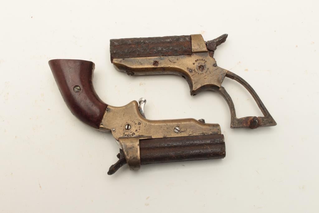 Lot of 2 rusty relic Sharps 4-barrel derringers, both .22RF caliber, one with wood grips/one missing grips. From the collection of John O. Beckwith. Est.: $300-$600.