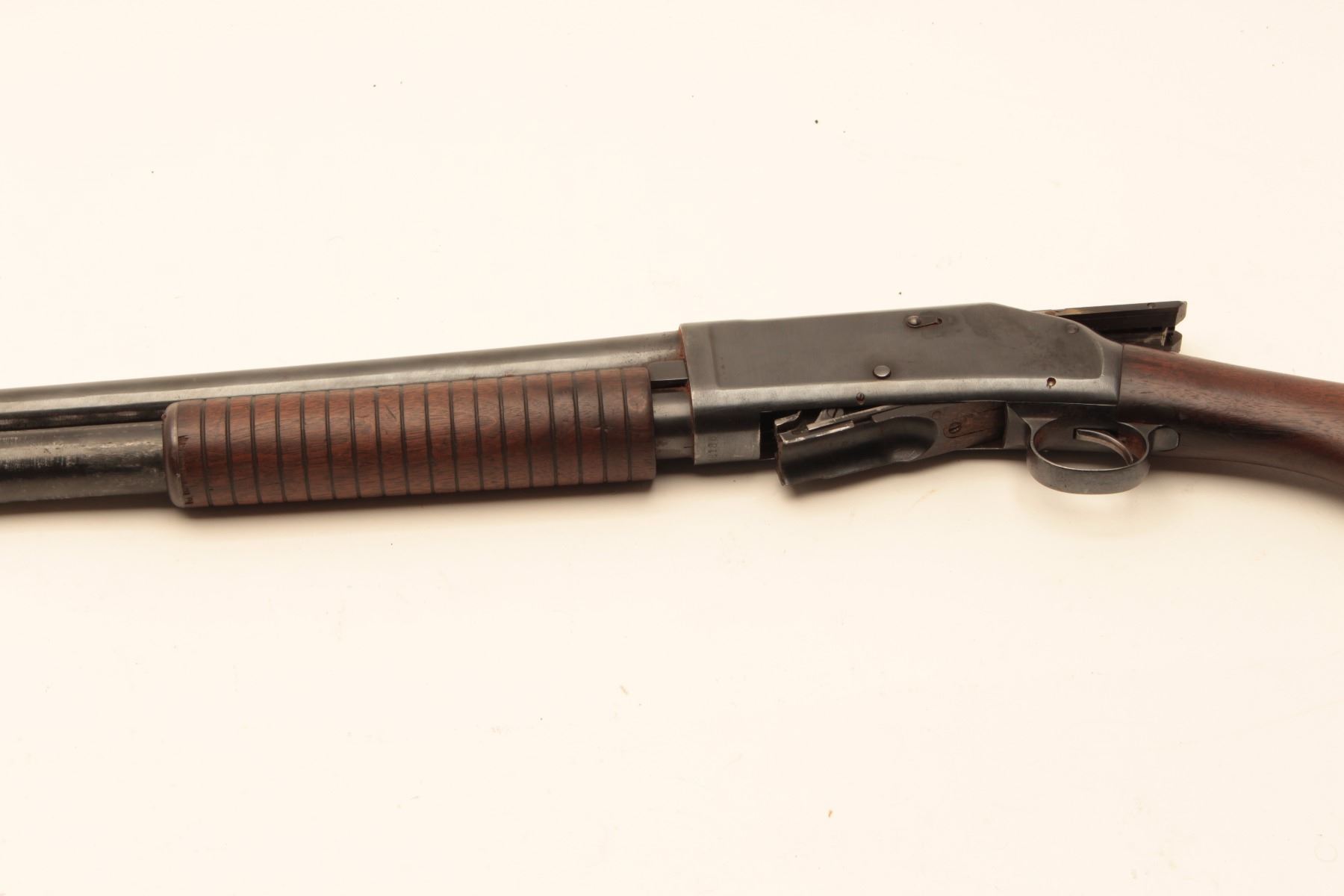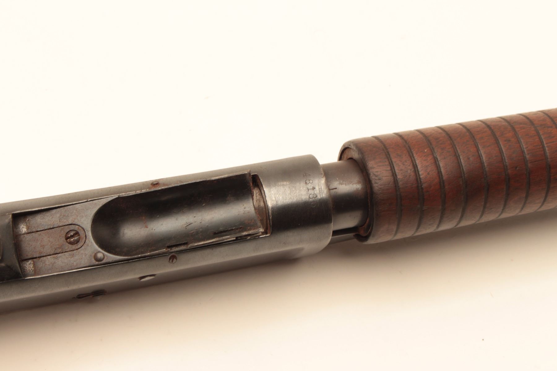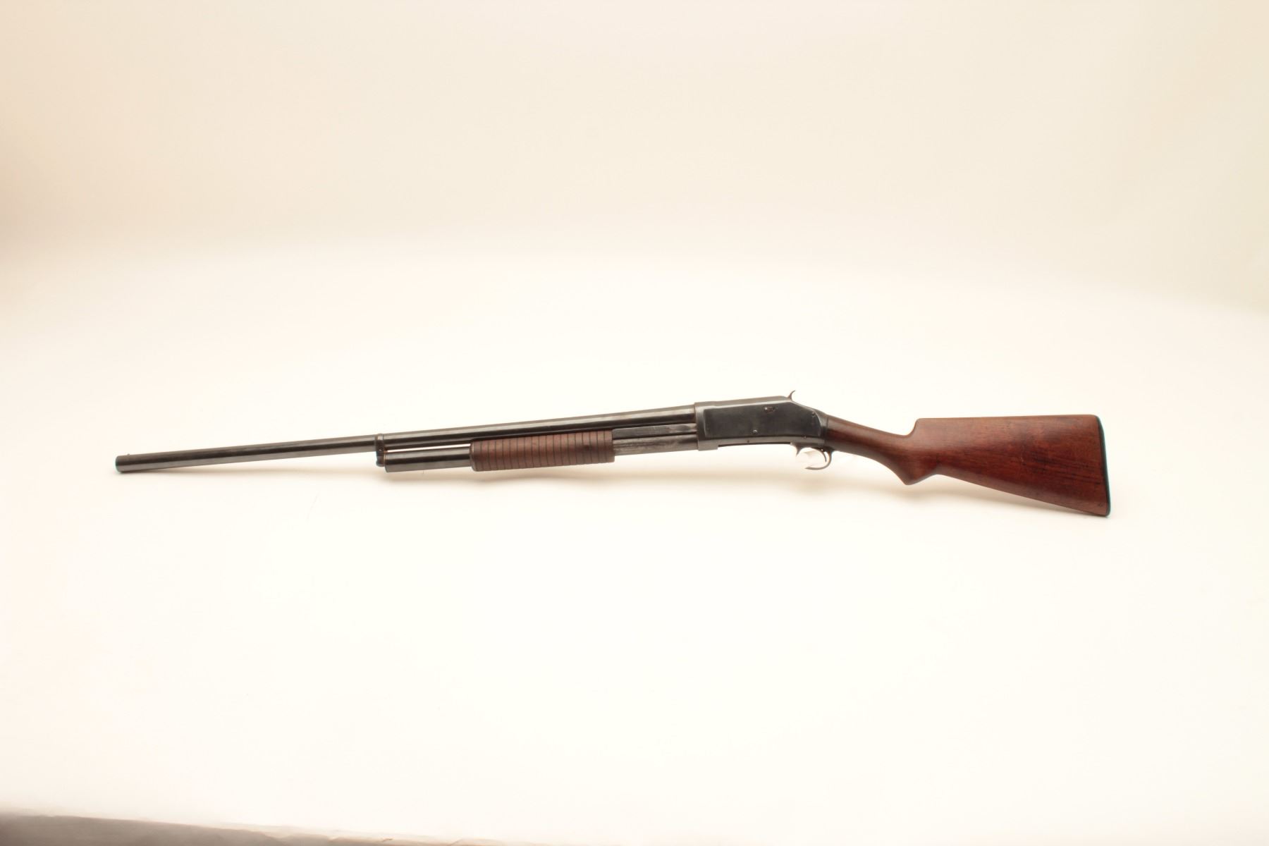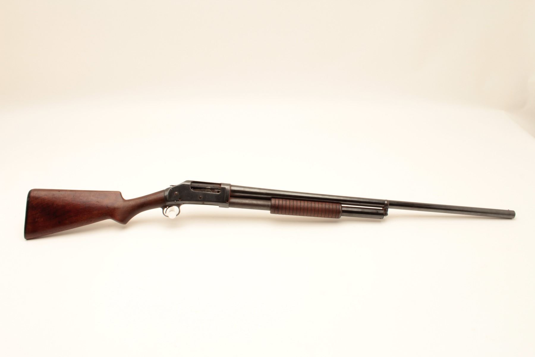 Winchester 1897 pump shotgun, #481864, 12Ga., 30" full choke barrel, reblued finish, in good condition as restored. (C&R / PPT) Est. $150-300