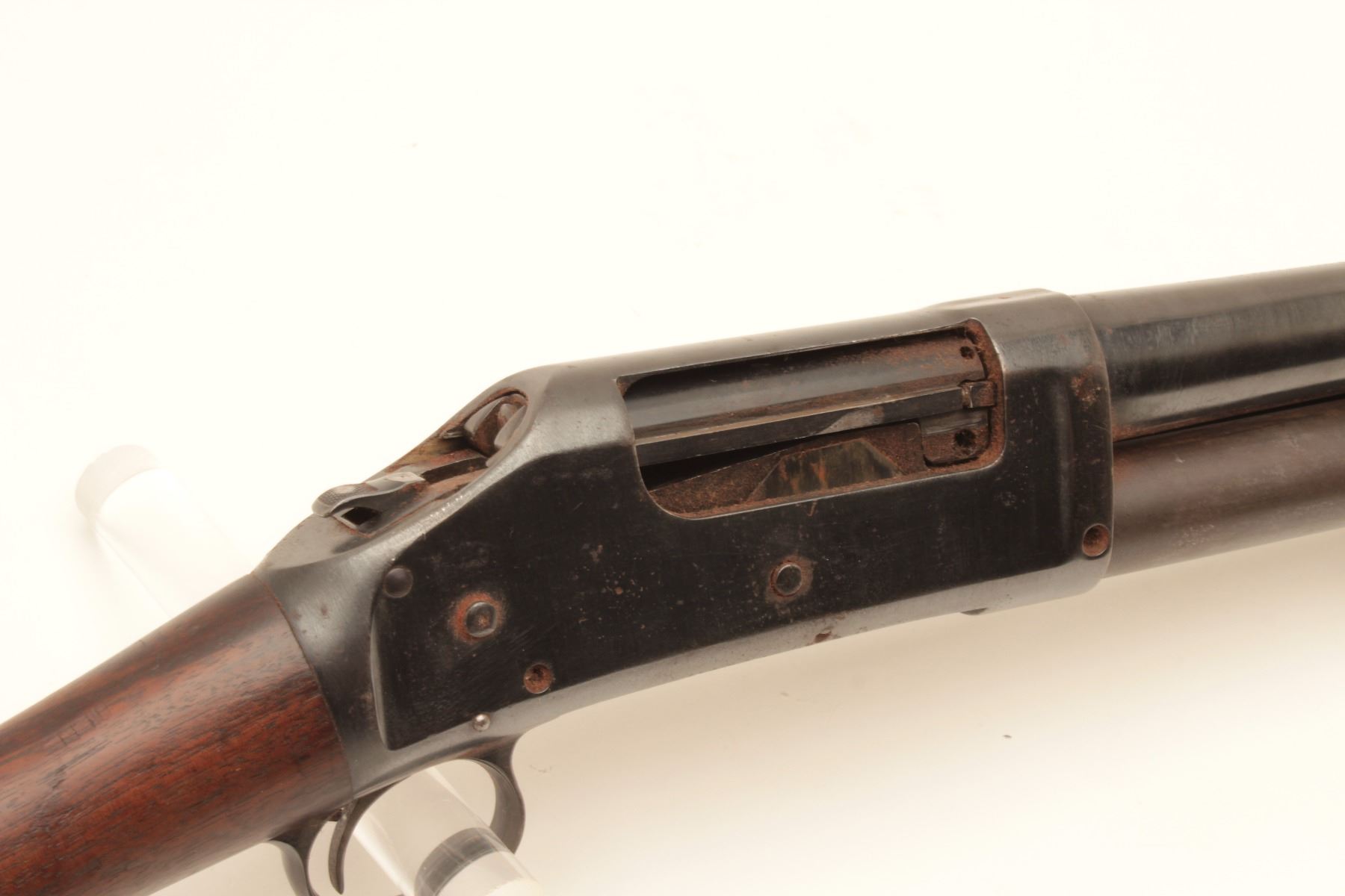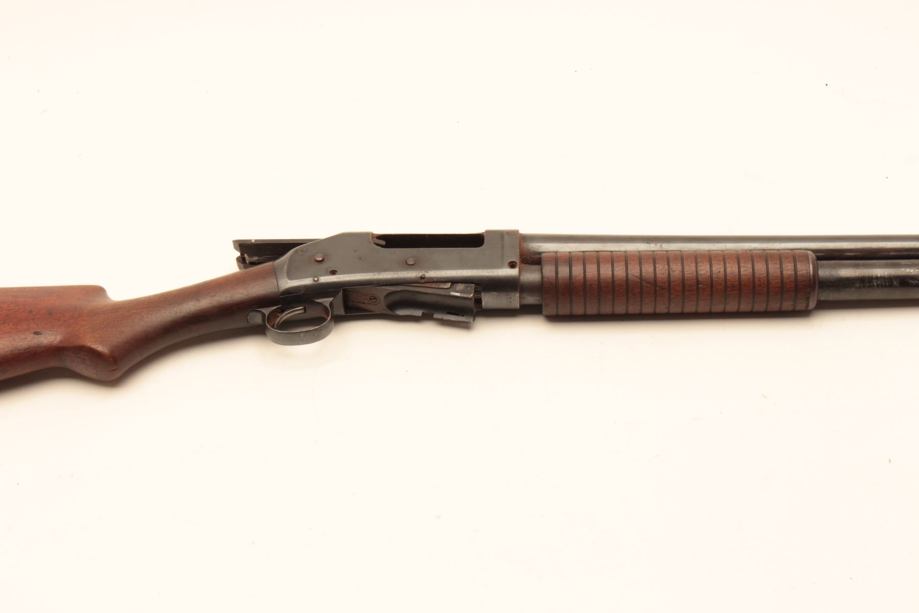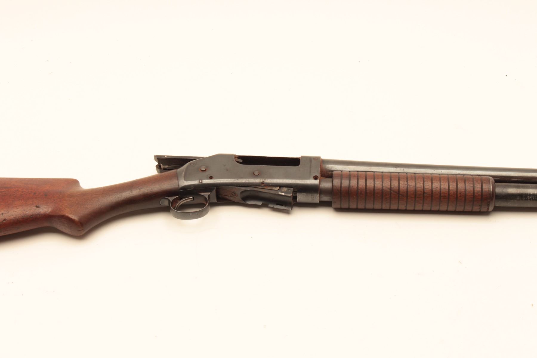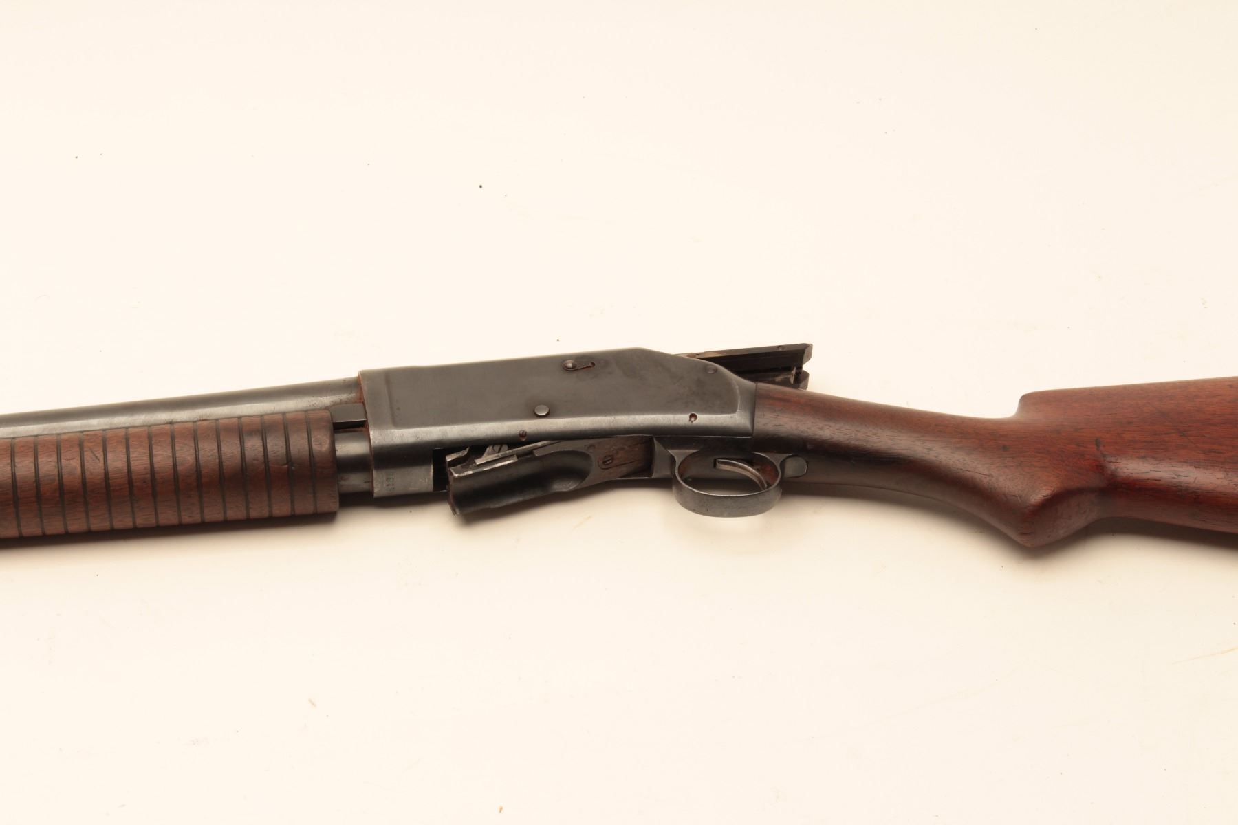 Winchester 1897 pump shotgun, #481864, 12Ga., 30" full choke barrel, reblued finish, in good condition as restored. (C&R / PPT) Est. $150-300