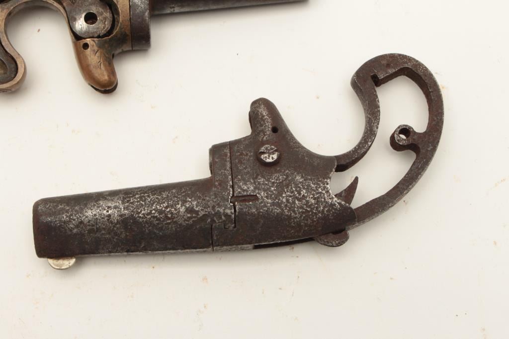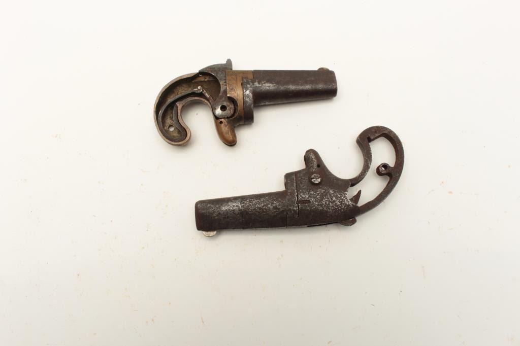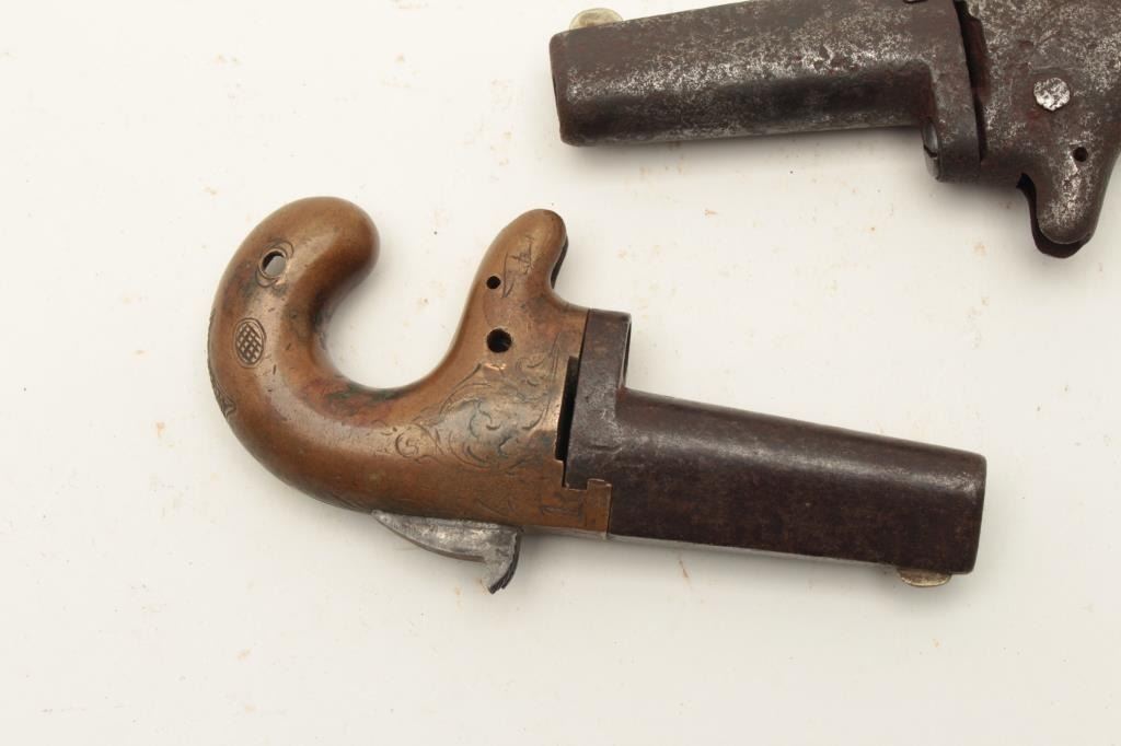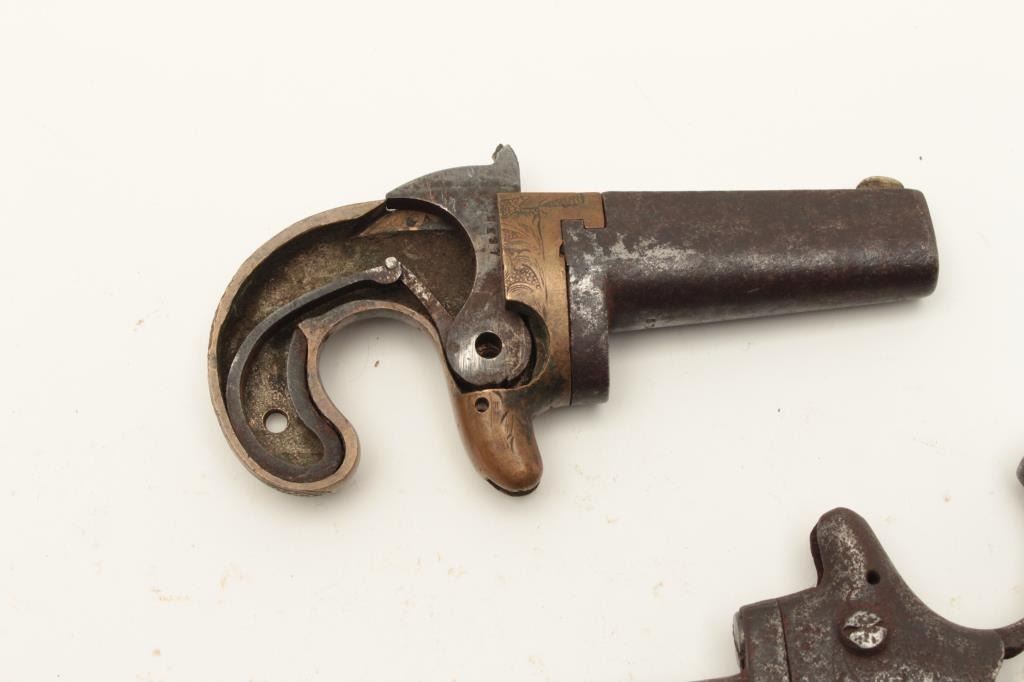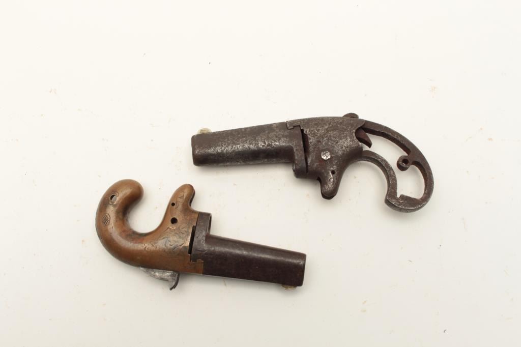 Lot of 2 rusty relic single shot derringers including a Colt No. 2 .41RF caliber, S/N 7078, missing grips and small parts; also a National Arms engraved brass frame, .41RF caliber, missing side plate and other small Lot Title parts, no grips. From the collection of John O. Beckwith. Est.: $300-$600.