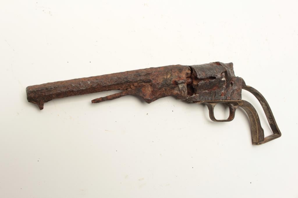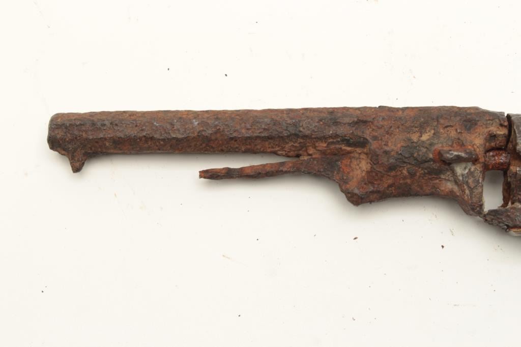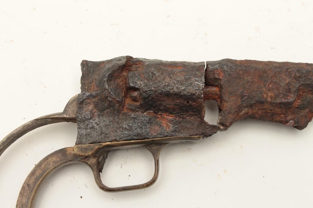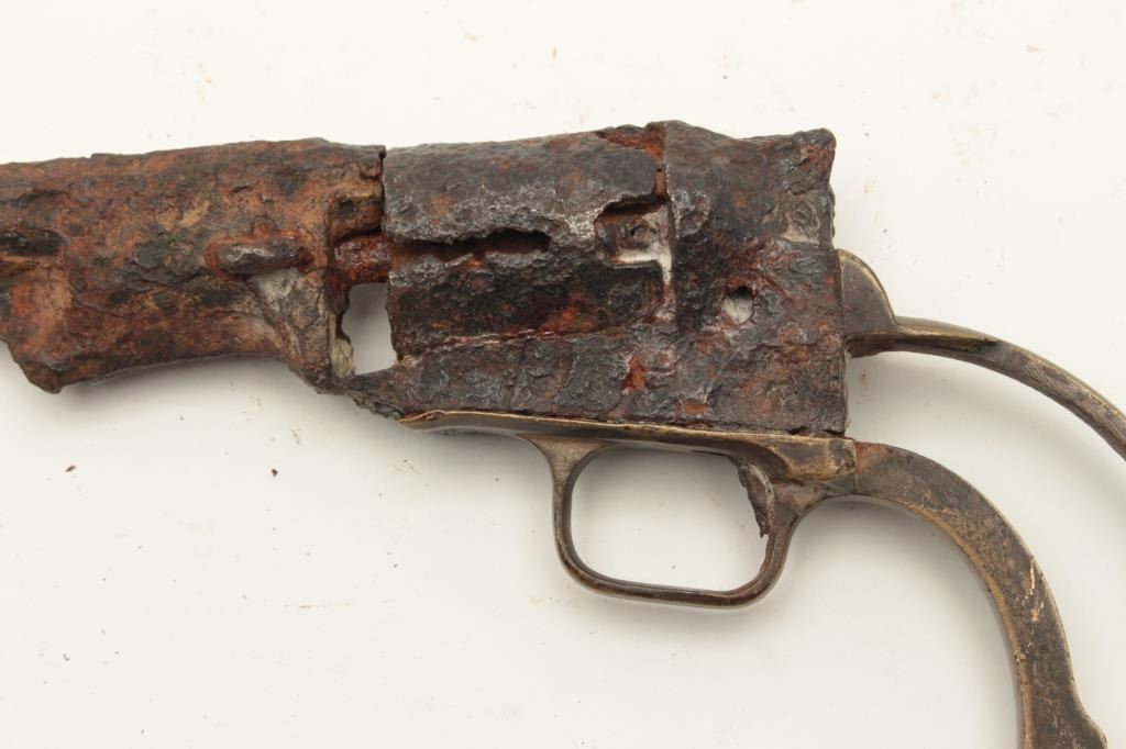 Rusty relic Colt Model 1849 Pocket percussion revolver, S/N 22536; no grips, heavily rusted as if in water for a long period of time. From the collection of John O. Beckwith. Est.: $150-$250.