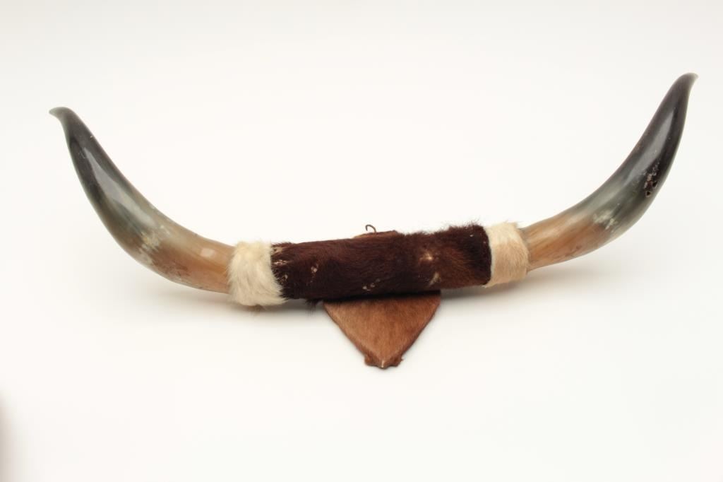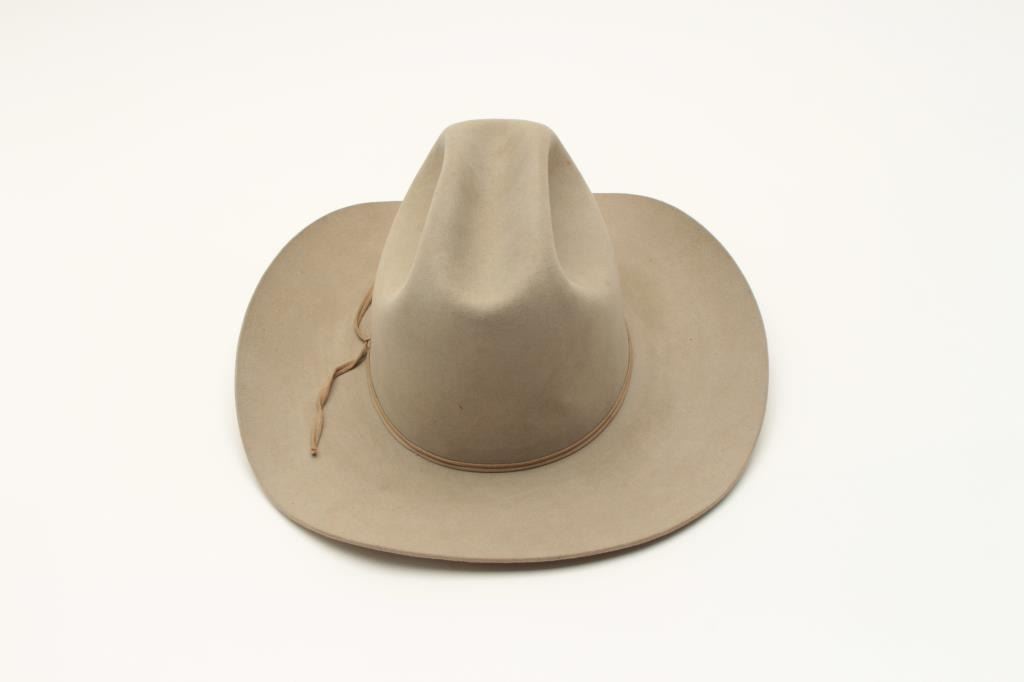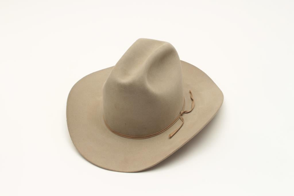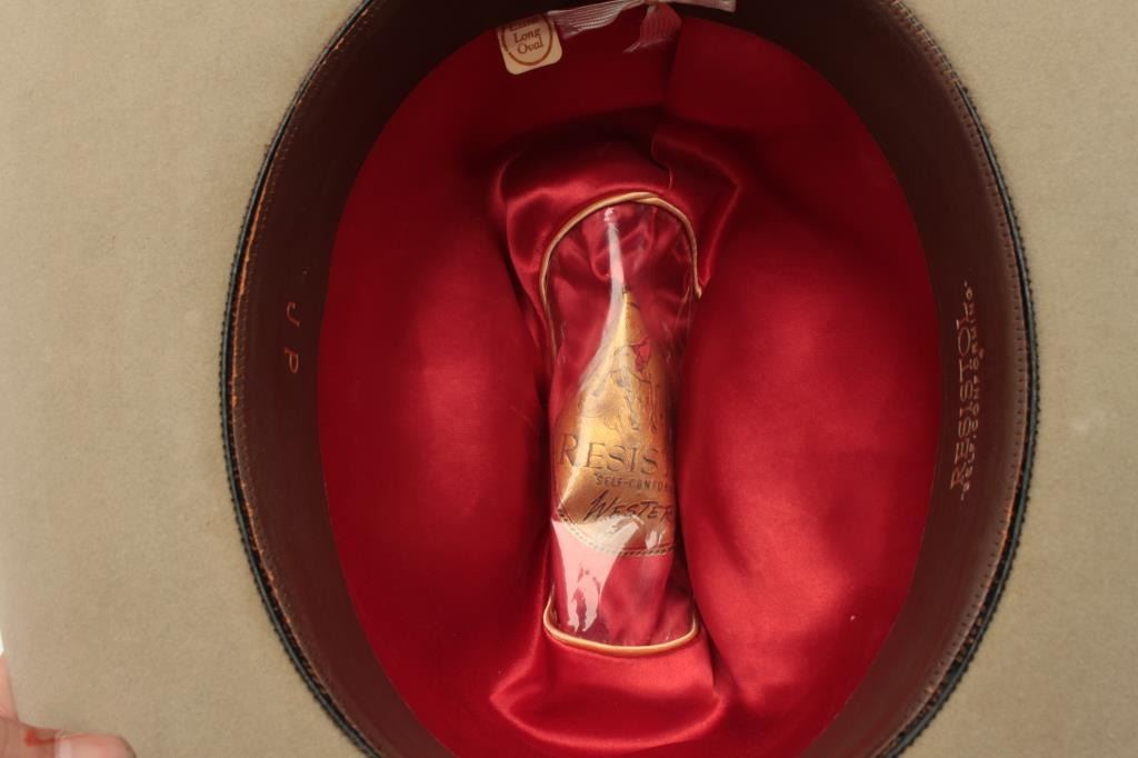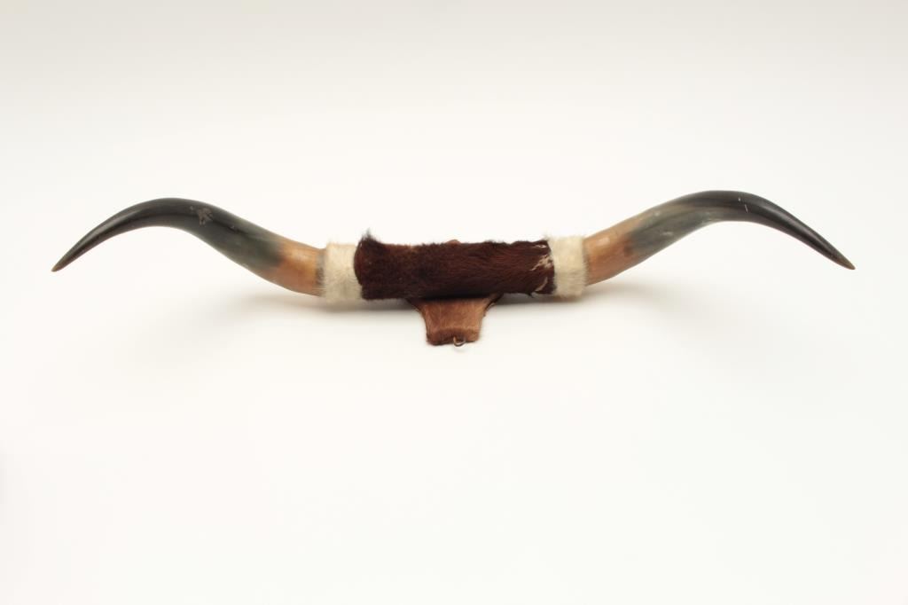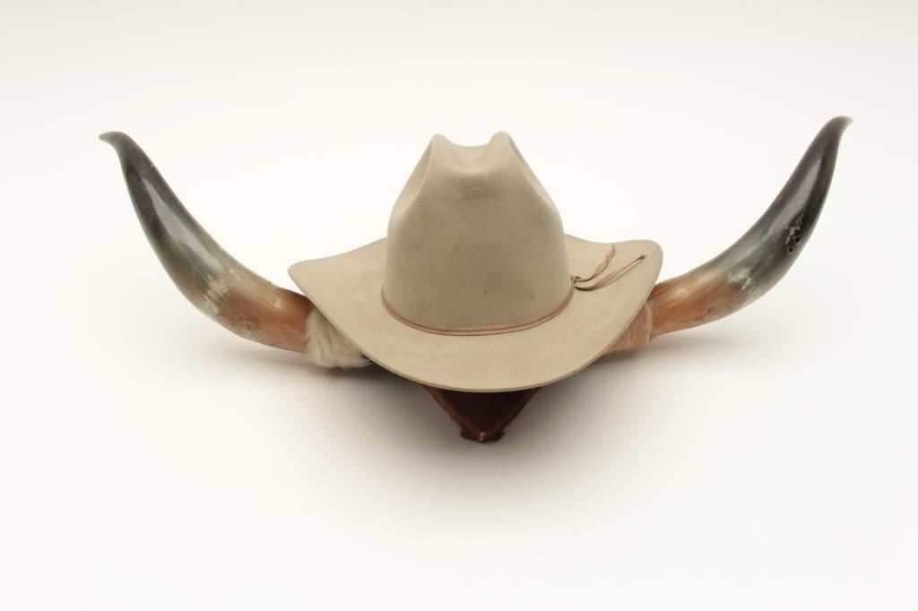 Lot consisting of a Resistol 3X Beaver tan cowboy hat in cardboard box and a pair of mounted steer horns, approximately 29” overall width on small hanging plaque. From the collection of John O. Beckwith. Lot Title Est.: $75-$125.