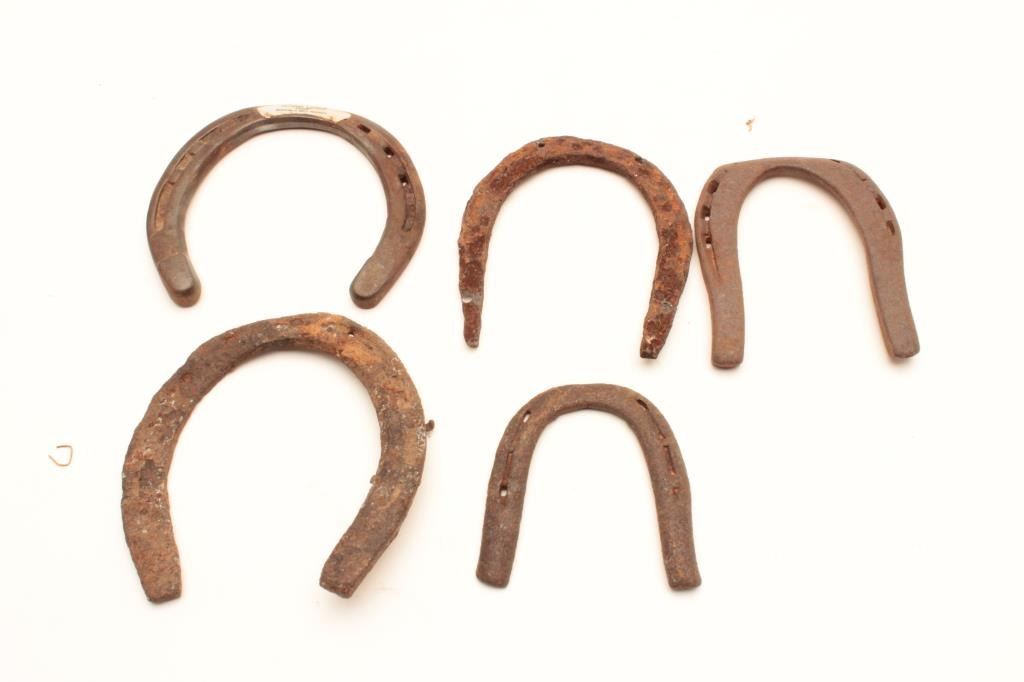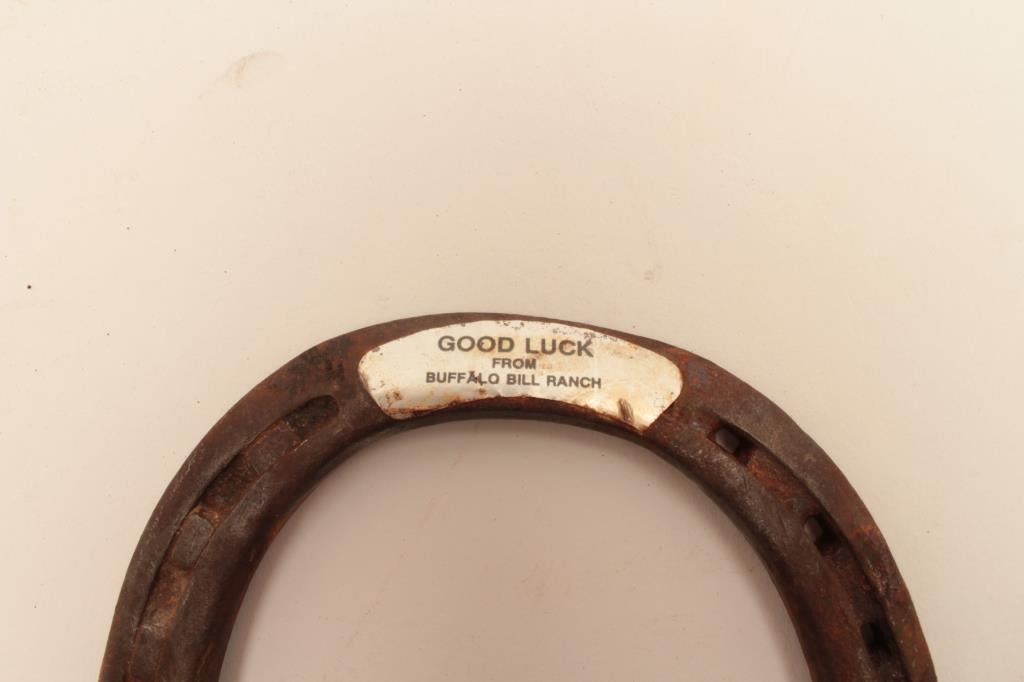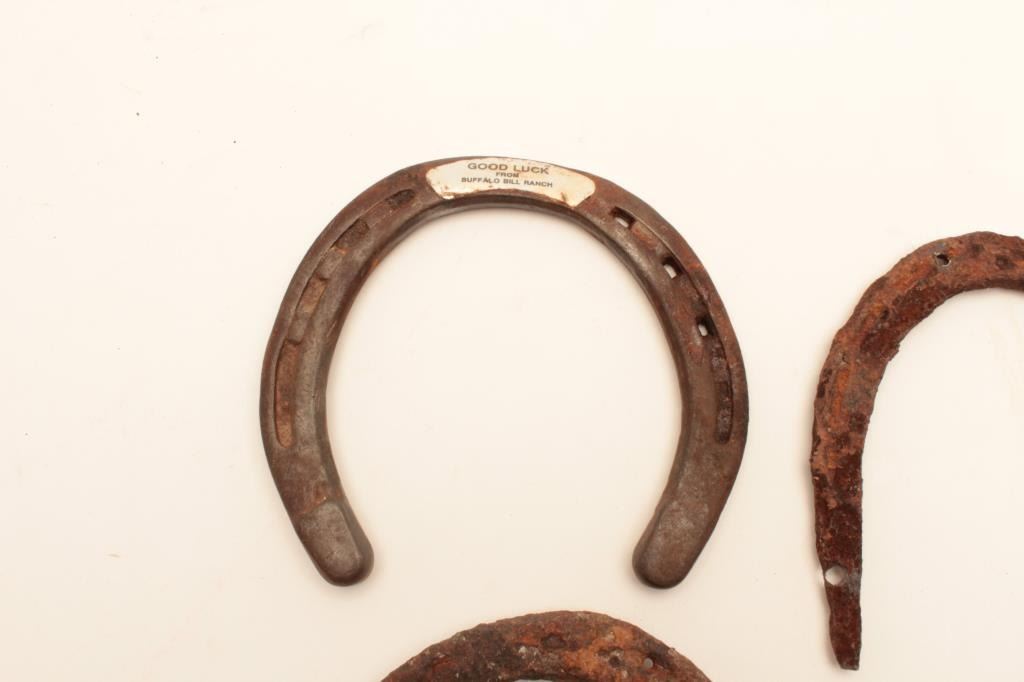 Lot of rusty relic horse and mule iron shoes with another horse shoe marked “St. Croix Forge” from the Buffalo Bill Ranch. From the collection of John O. Beckwith. Est.: $125-$175.