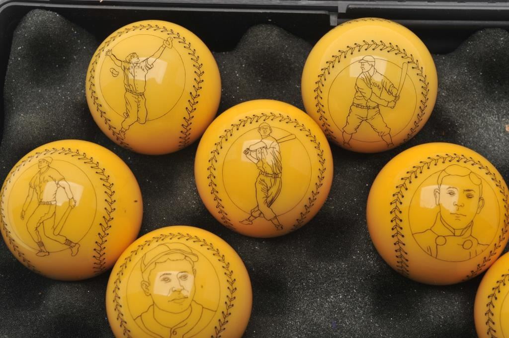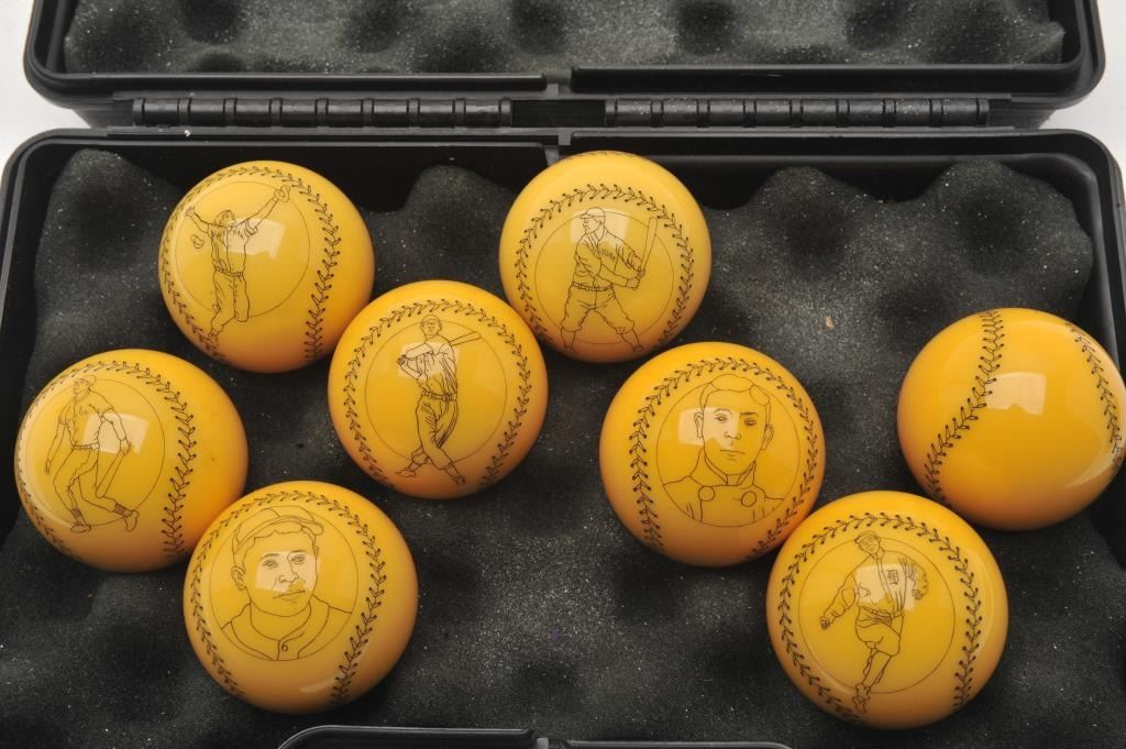 Lot of 9 hand carved and inked snooker balls by Dennis Tupper. Made to resemble baseballs with portriats of famous players and various positions, batting, catching and running. Babe Ruth?, Mickey Mantle?, Honus Wagner?, Lot Title Ted Williams? And other. Dennis charged $350 each on commission in 1980s. Est.: $300-$600