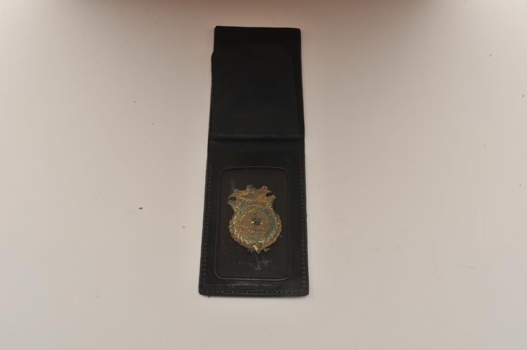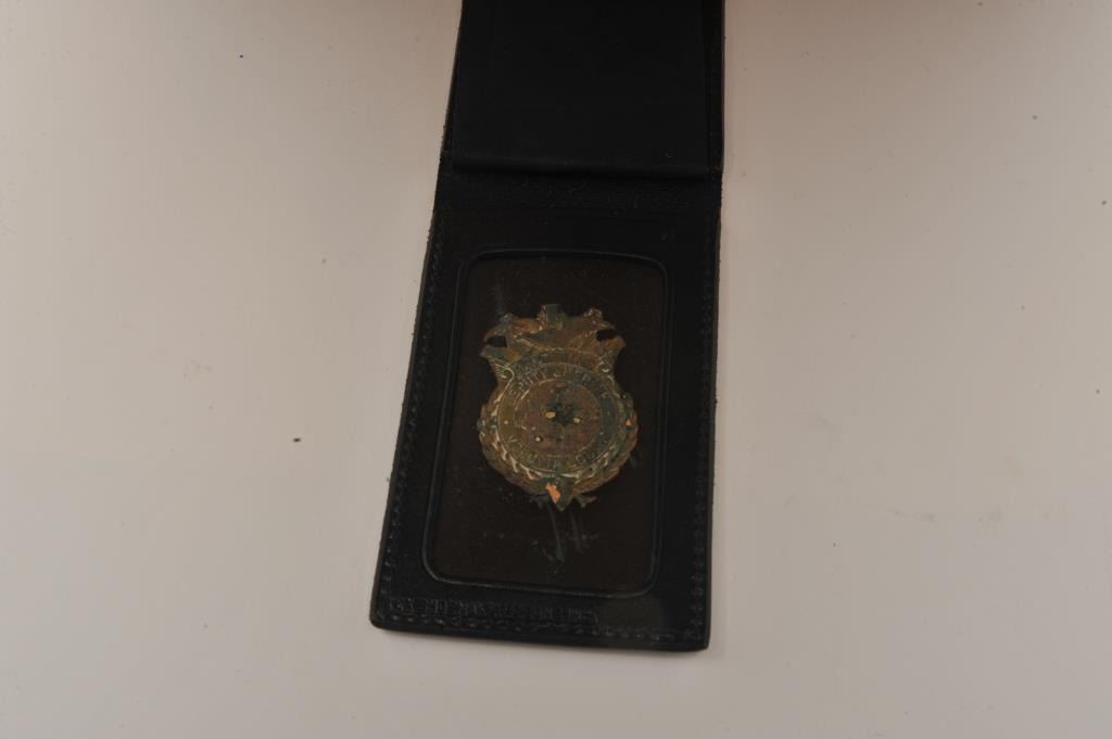 Deputy Sheriff Volusia County, FLA shield badge with “B.U. Thomas” top ribbon (no hallmark) in newer leather badge case. Est.: $150-$300.