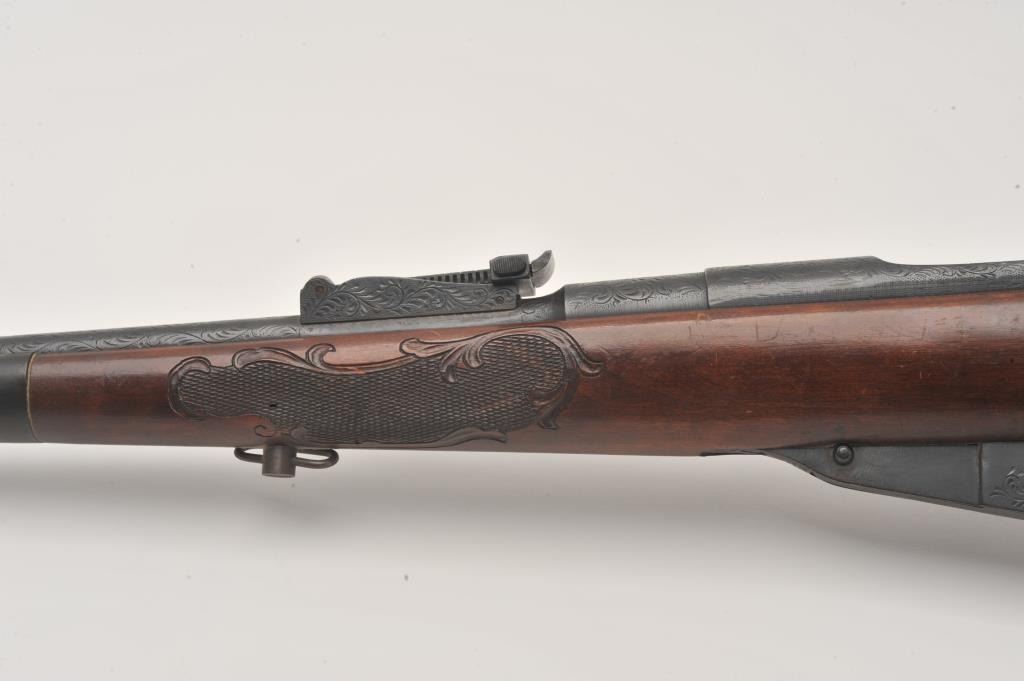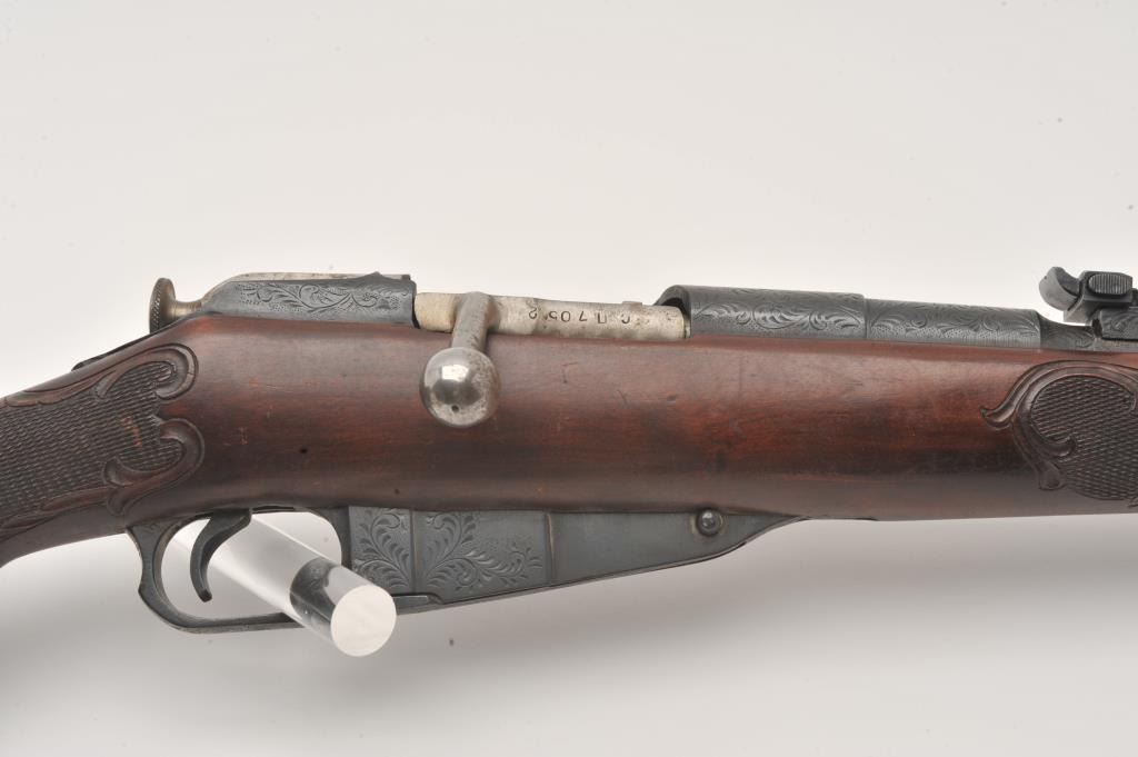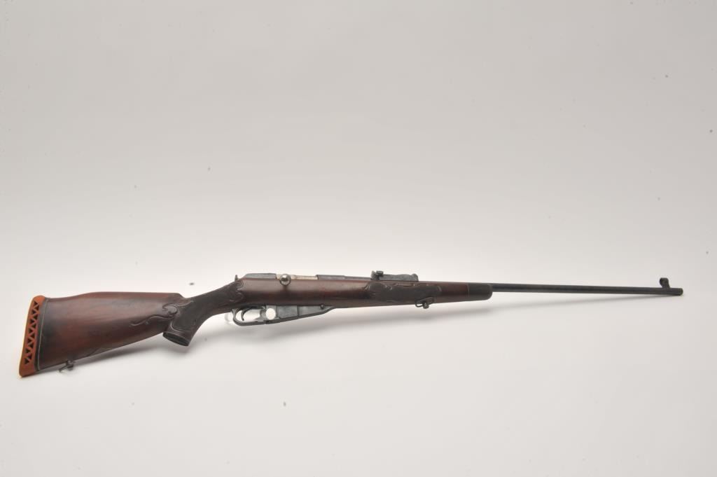 Sporterized Mosin Nagant 91/30, #CN7052, 7.62x54R, fully engraved in a scroll motif with a checkered and carved Monte Carlo style stock. Near fine, as sporterized and restored. (C&R / PPT) Est. $50-100