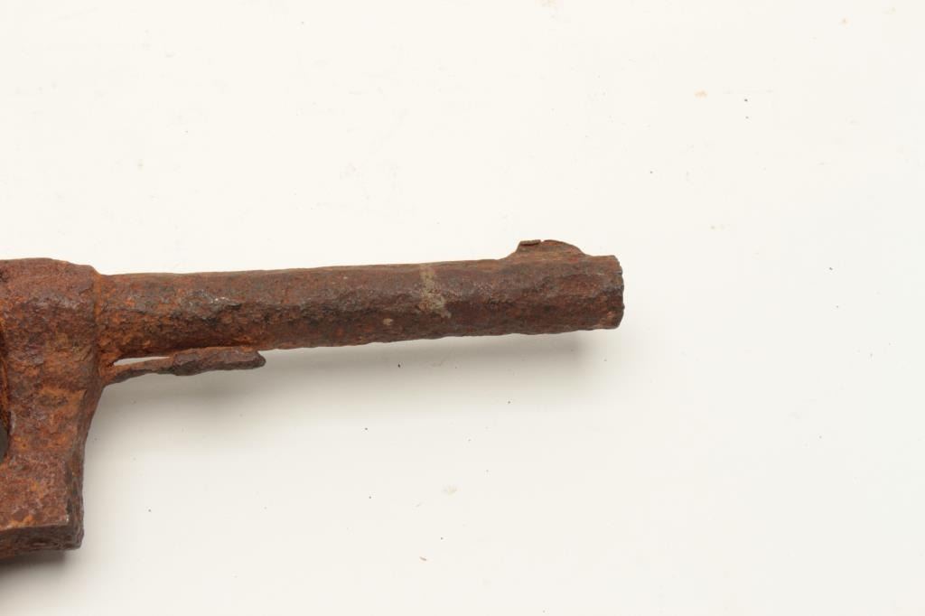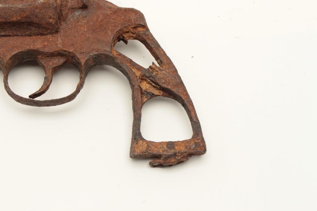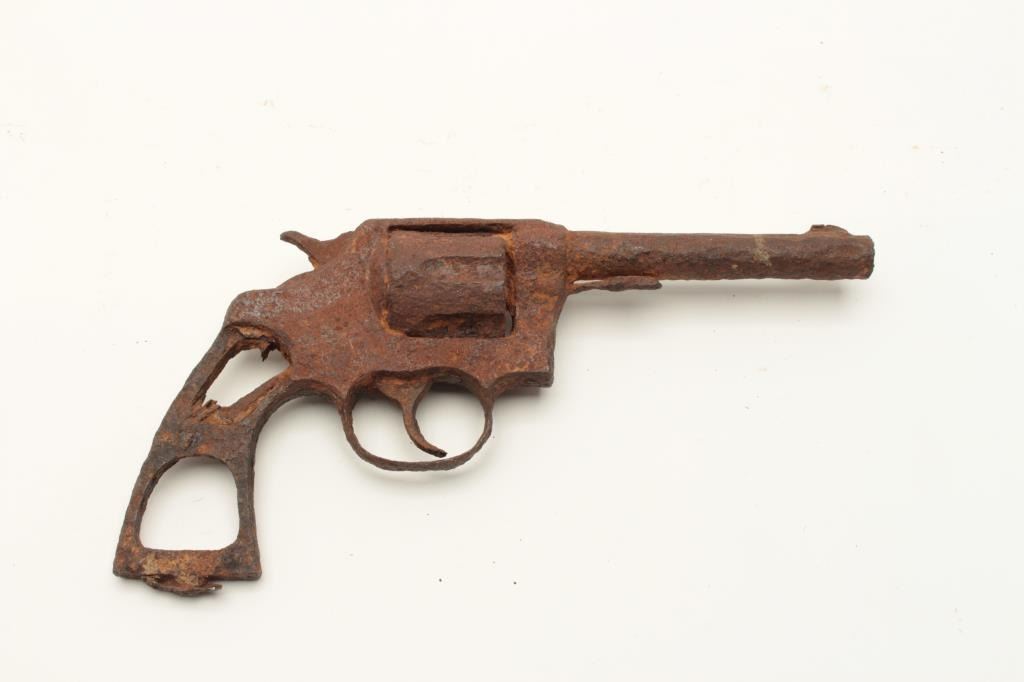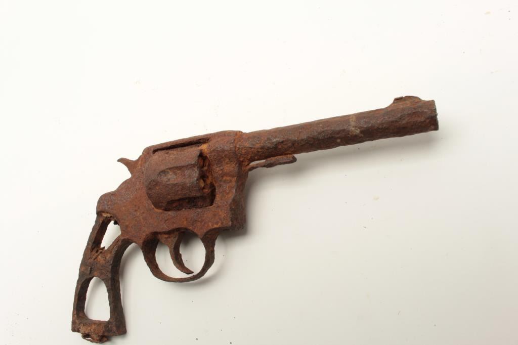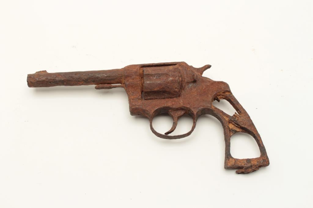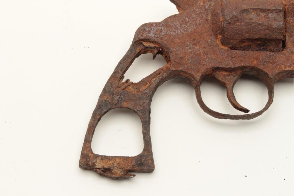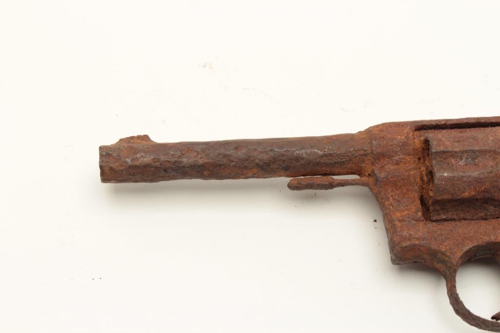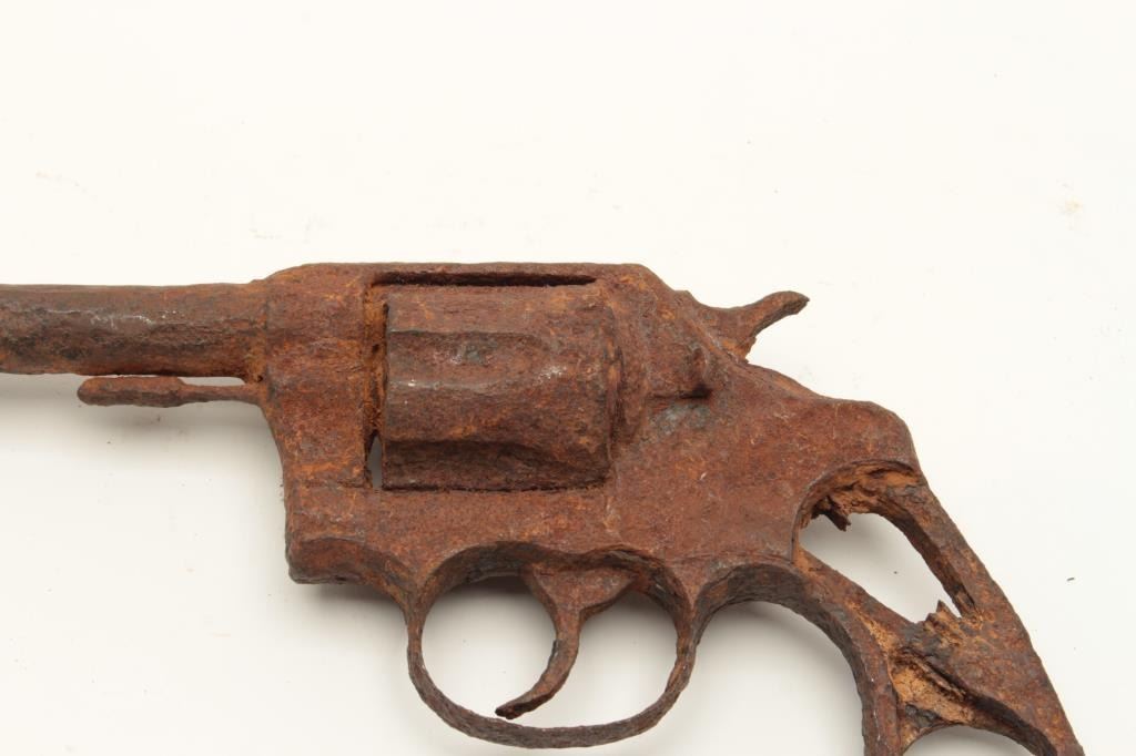 Rusty relic Colt Model 1917 DA revolver, heavily rusted, 4 chambers of cylinder still loaded! No grips. From the collection of John O. Beckwith. Est.: $150-$300.
