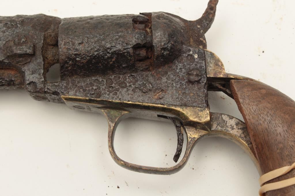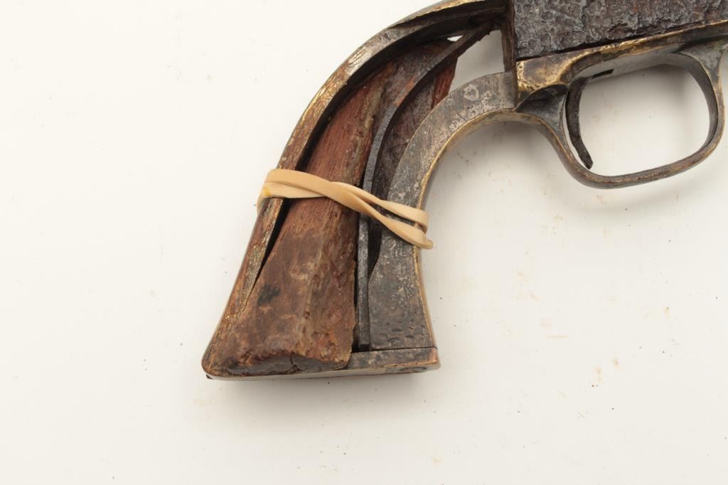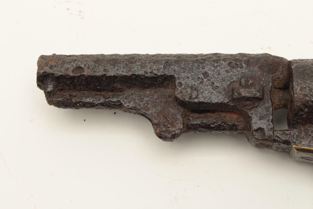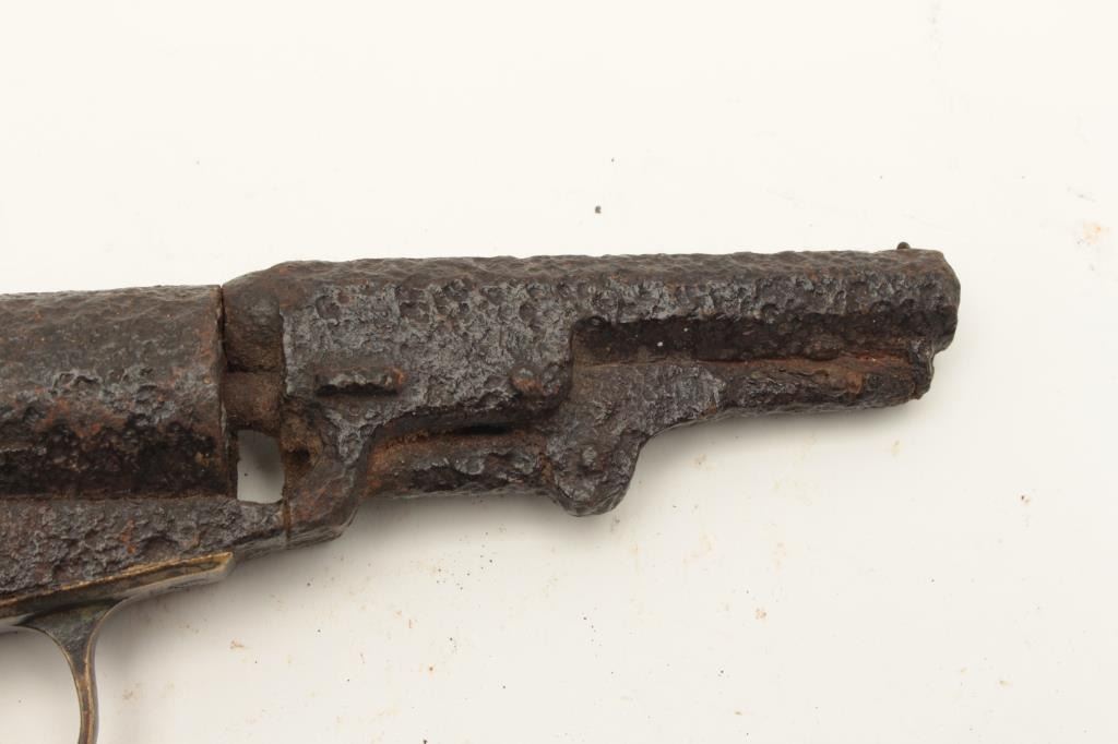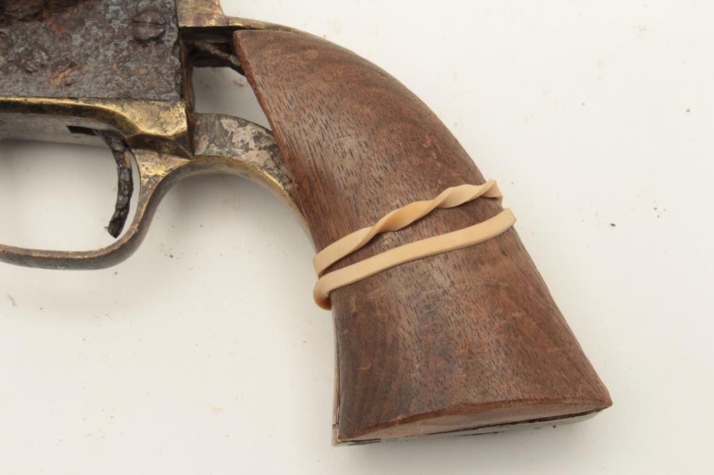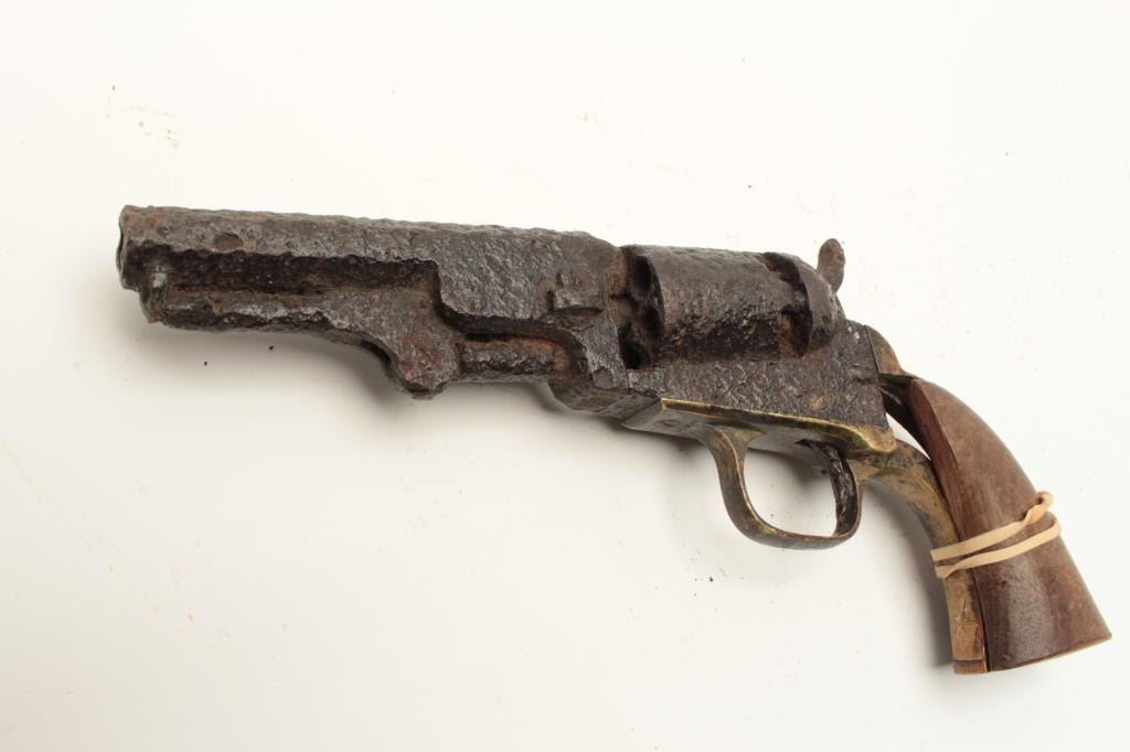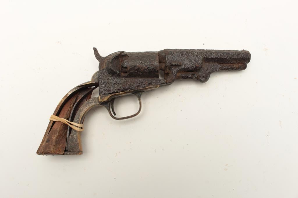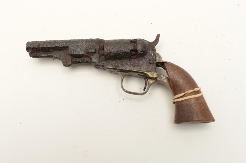 Rusty relic Colt Model 1849 Pocket percussion revolver, heavily rusted, partial wood grips, S/N 192708; 3 chambers of cylinder still loaded! From the collection of John O. Beckwith. Est.: $250-$450.