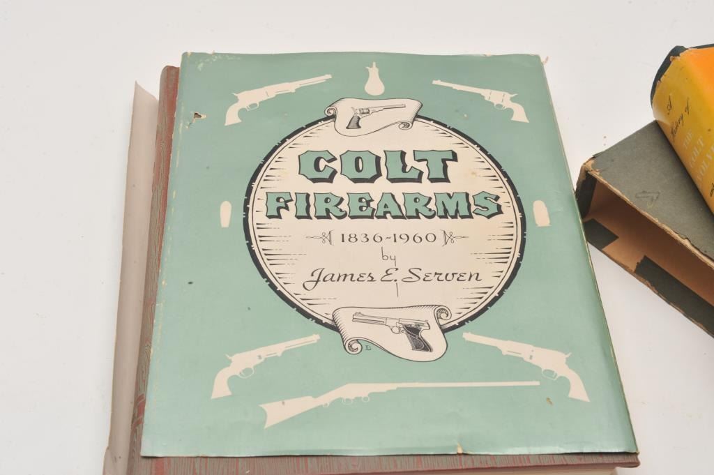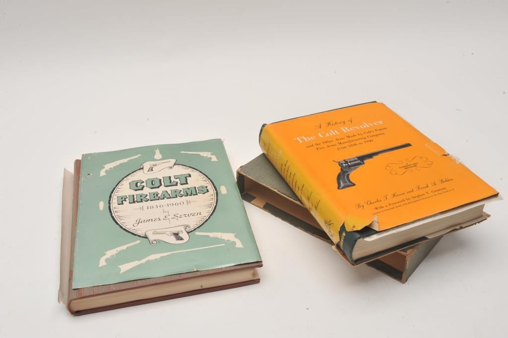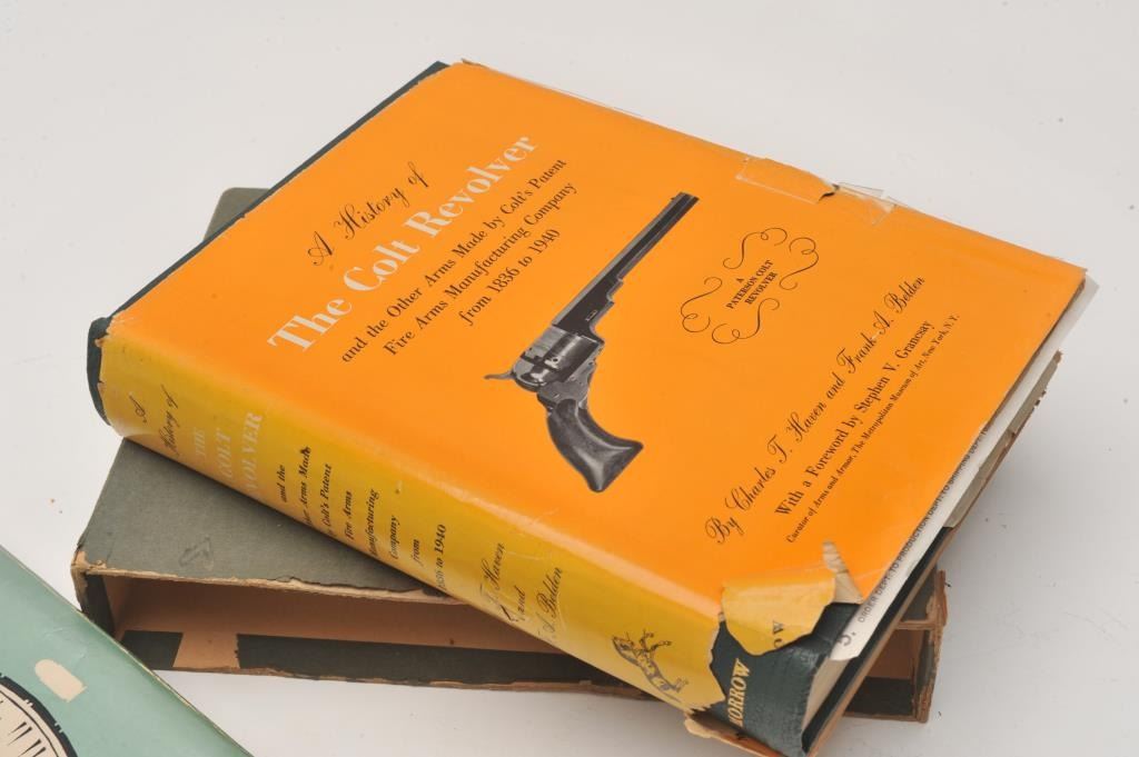 Colt Collector’s book lot of 2 early text; 1. “A History of the Colt Revolver” by Haven & Beldan. 1943 dated receipt from Colt Firearms. 1940 dated edition. Excellent with dust jacket ripped and slip cover. Lot Title 2. “Colt Firearms” by Serven. 1954 edition. Dust jacket ripped but fine. 1963 dated receipt from O.C. Gun Room. Est.: $200-$400
