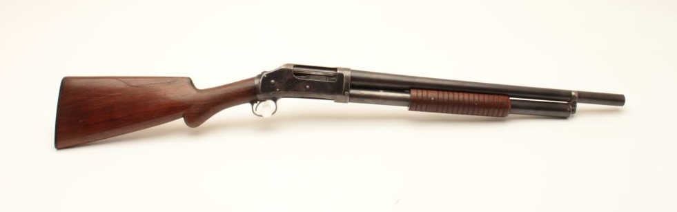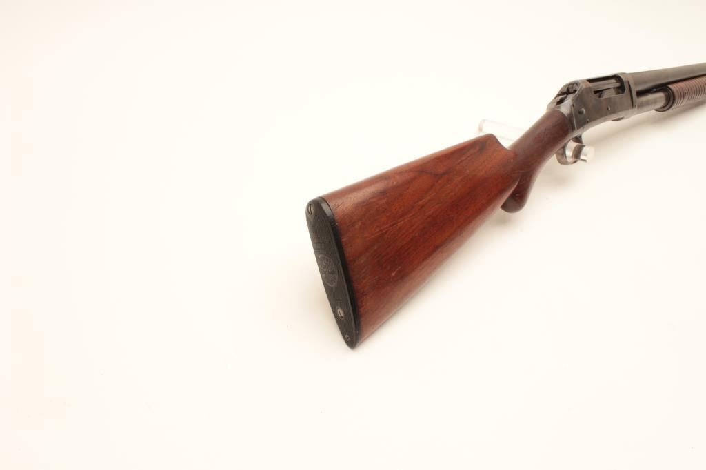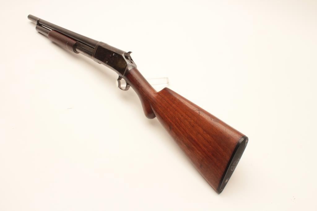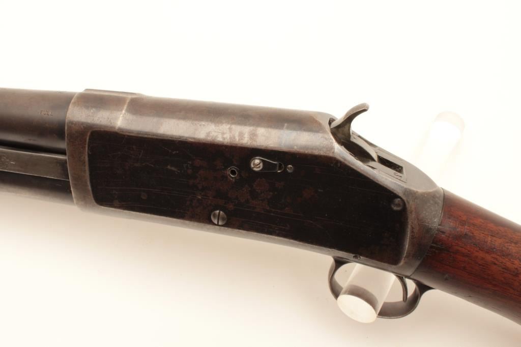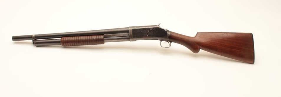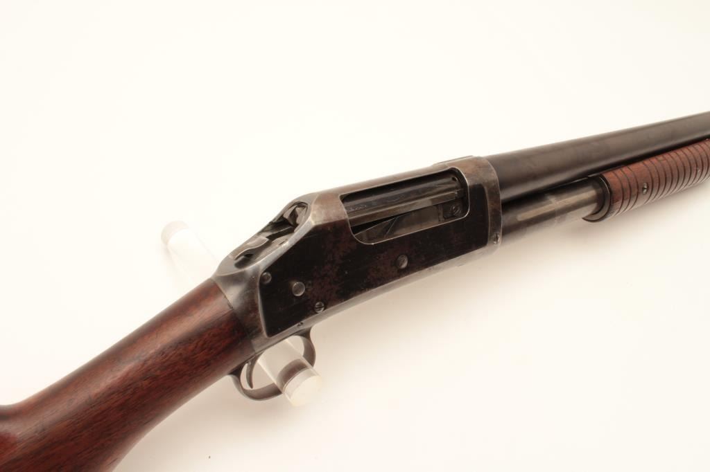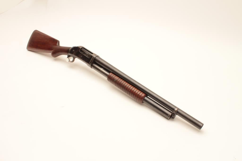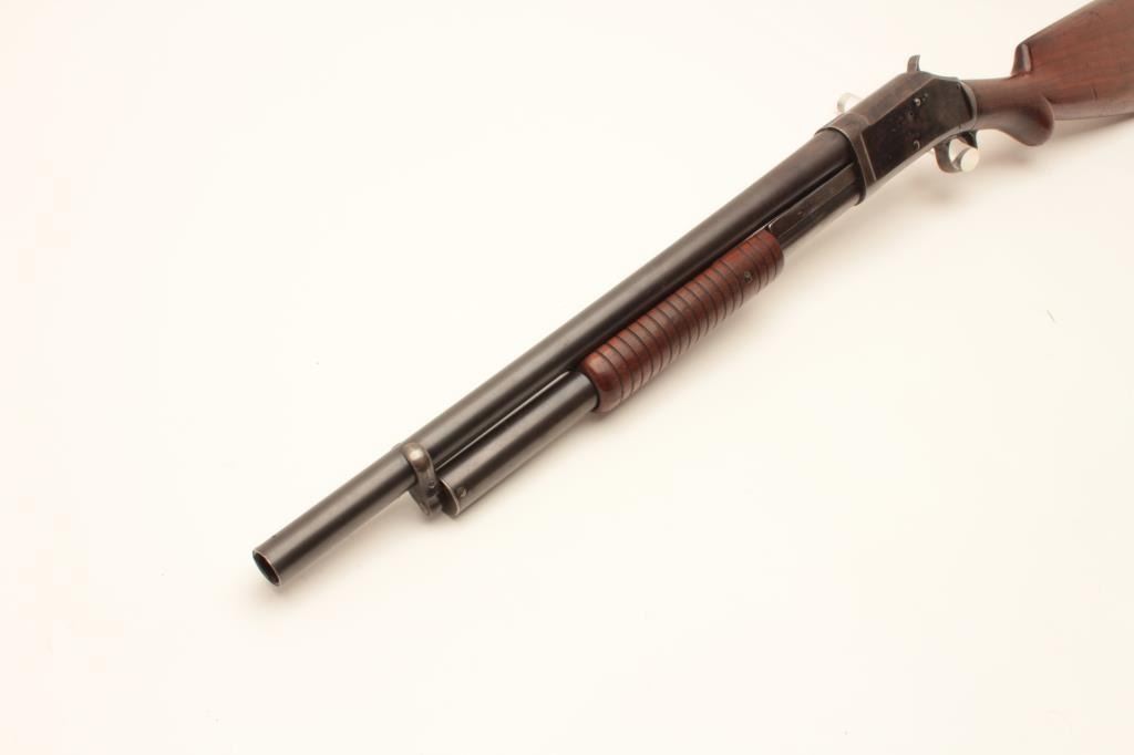 Winchester Model 1897 pump shotgun, 12 gauge, Serial #209068. The shotgun is in good overall condition with a barrel that has been shortened to 20” in length. The metal surfaces retain a considerable amount of Lot Title their muted blue finish with areas of flaking finish and light surface rust on the receiver. The smooth wood stocks are in good condition with mars and compressions consistent with carry and use. The butt Lot Title stock features a round knob pistol grip and ends with a hard rubber, Winchester marked butt plate. The bore is good, the action crisp and markings are sharp on this desirable Model 1897 which had its barrel Lot Title shortened to riot length during the period of use. Est.: $250-$500. (C+R).