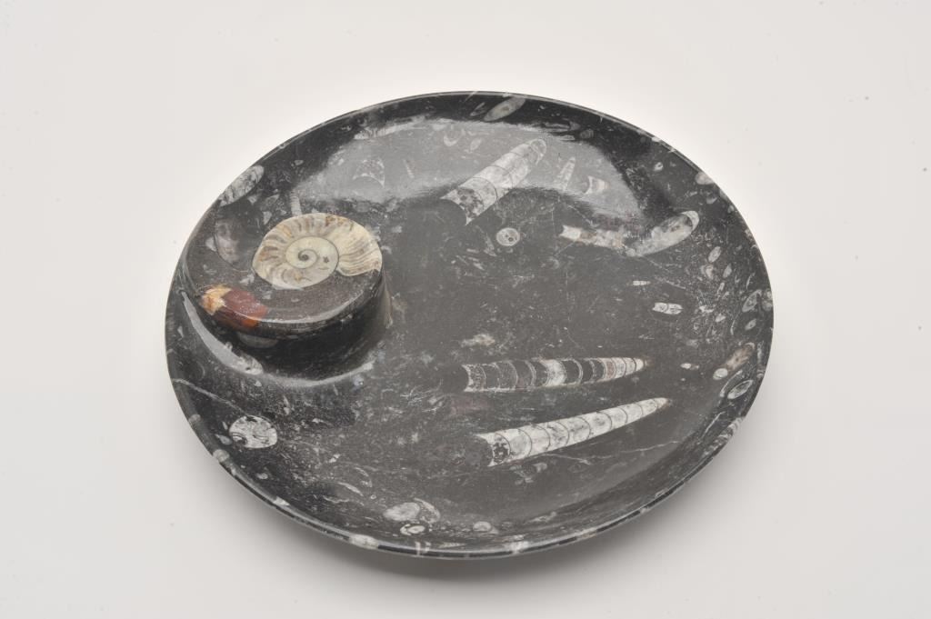 Rare large Orthoceras & Ammonite fossil polished and crafted into a bowl; approximately 10” in diameter. Est.: $50-$75.