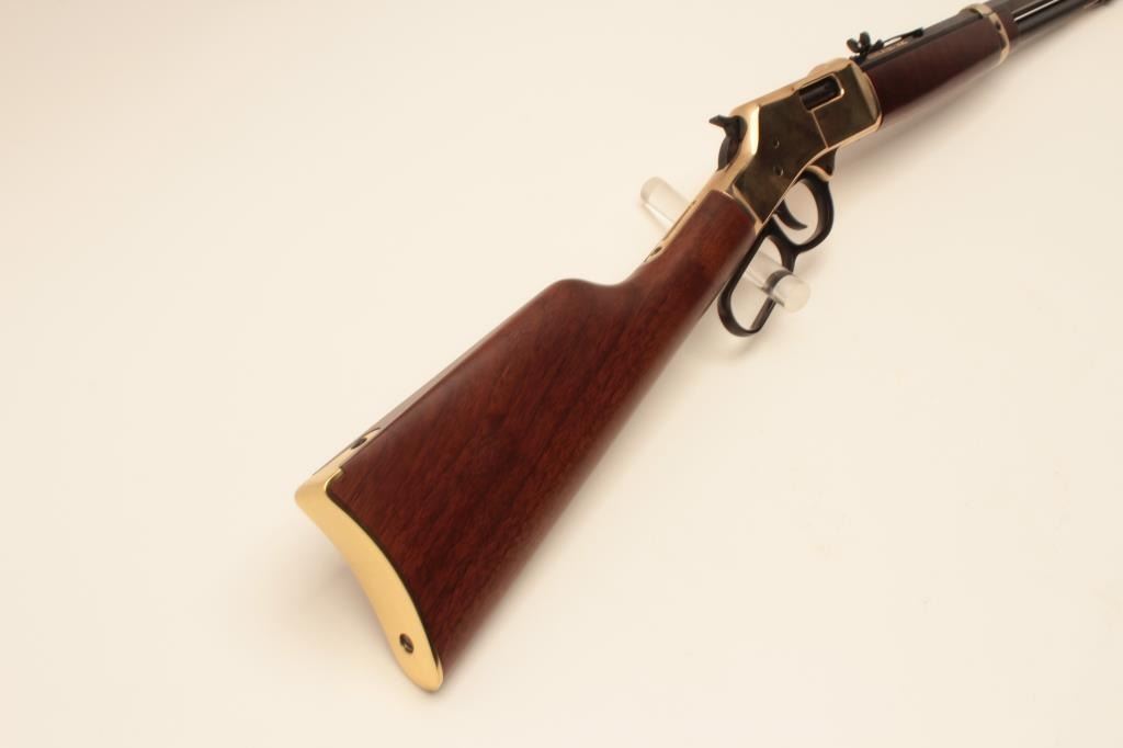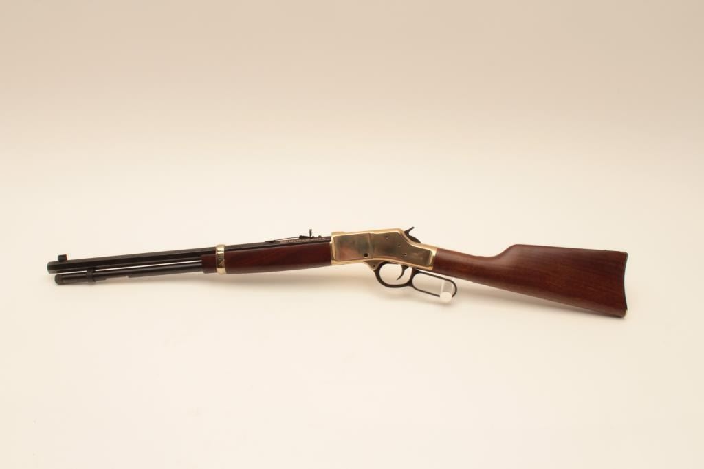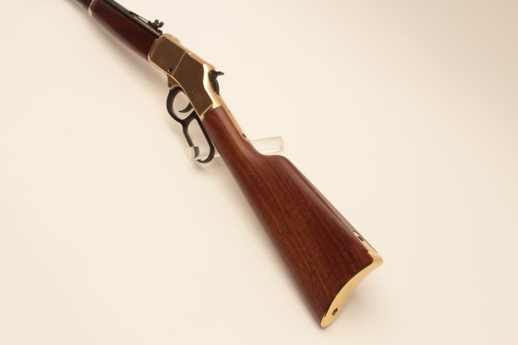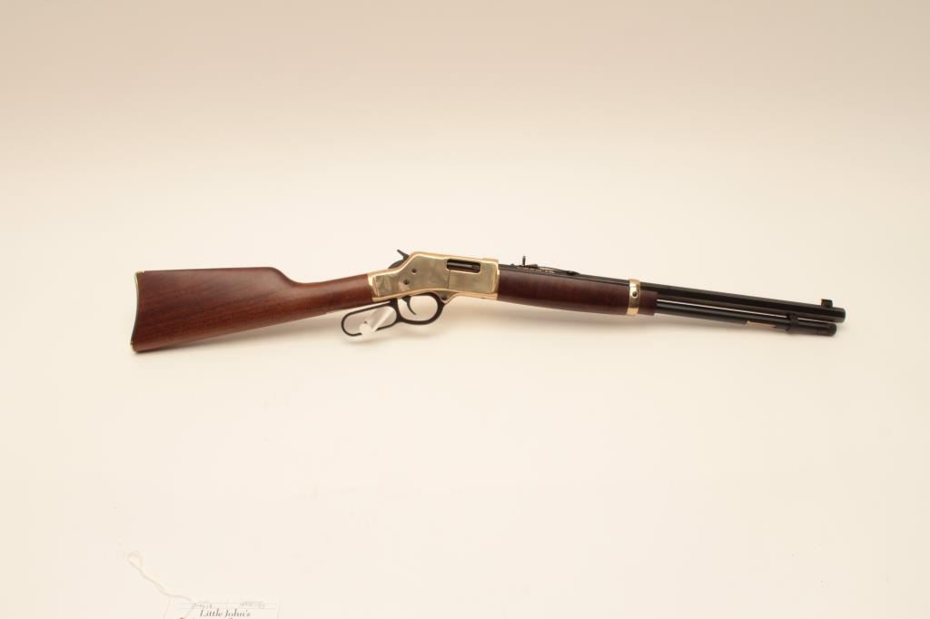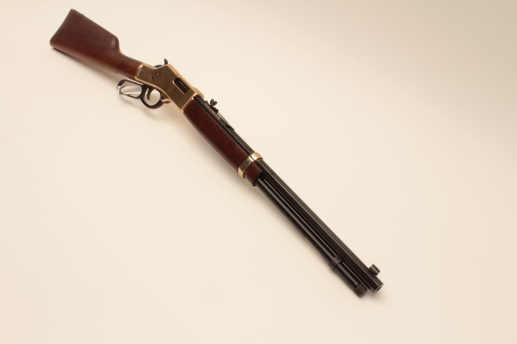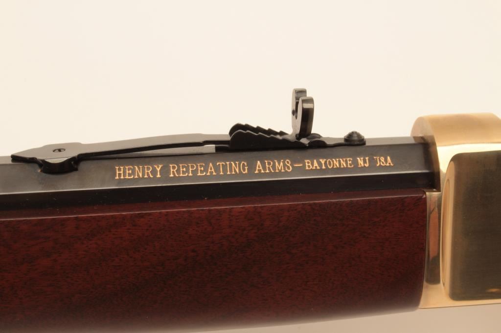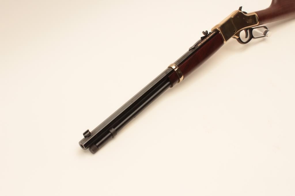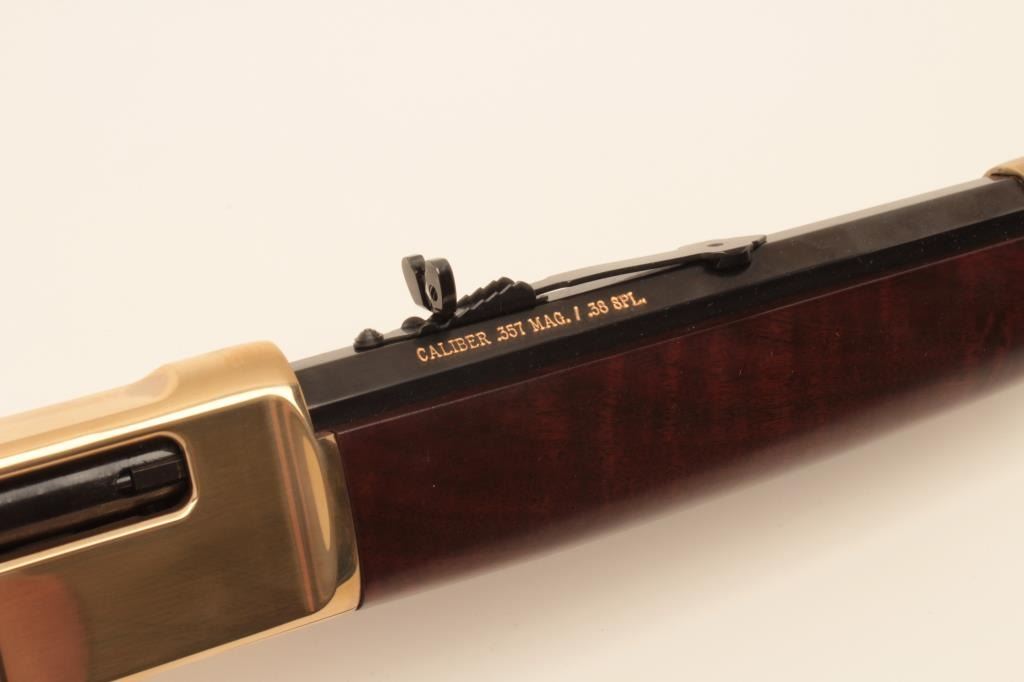 Henry Repeating Arms Big Boy Model lever action rifle, .357 Magnum caliber, Serial #BB0014949M. The rifle is as new in the factory box with a 20” octagon barrel. The barrel and full-length magazine retain nearly Lot Title all of their blue finish while the receiver is completed in polished brass. The butt plate and barrel band are also polished brass. The smooth wood stocks show nice figure and grain. The rifle is as new in the Lot Title factory box with all associated packaging materials and paperwork. Est.: $400-$800. (Modern).
