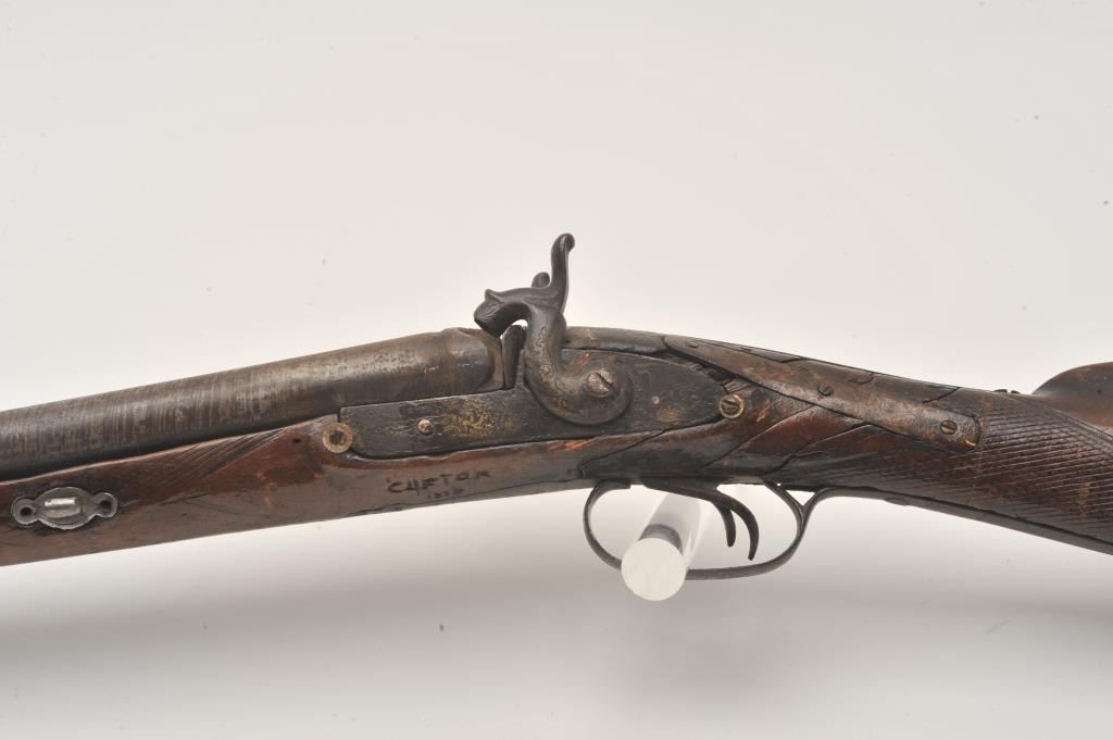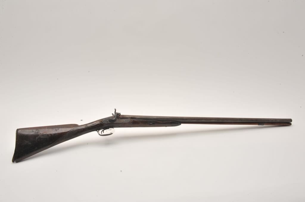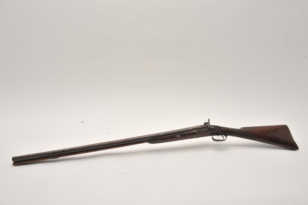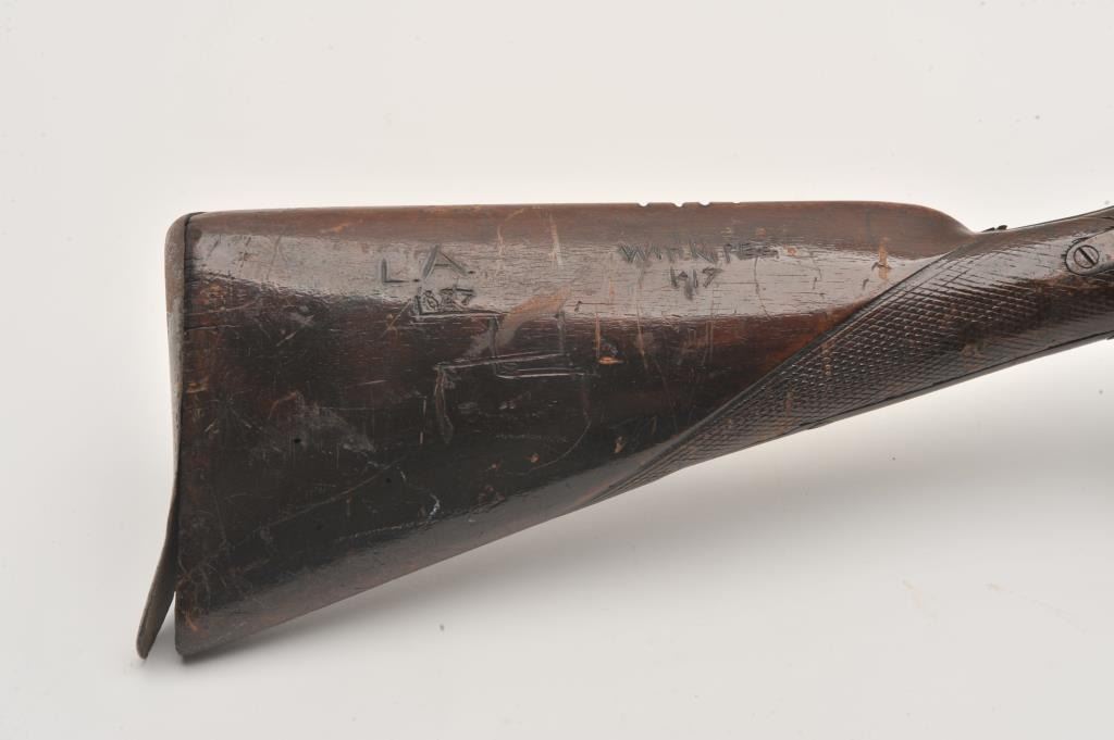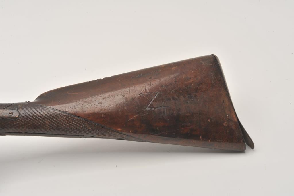Percussion side by side 12 Ga shotgun, damascus barrels. Stock has several interesting hand inscriptions including Carson City 1887, LA 1887, and Winnepeg 1917 with 4 notches along the top cheek piece. Lot Title Fair to poor condition, old repair in stock, action not working, missing parts. A wall hanger. (Antique) Est $100-200