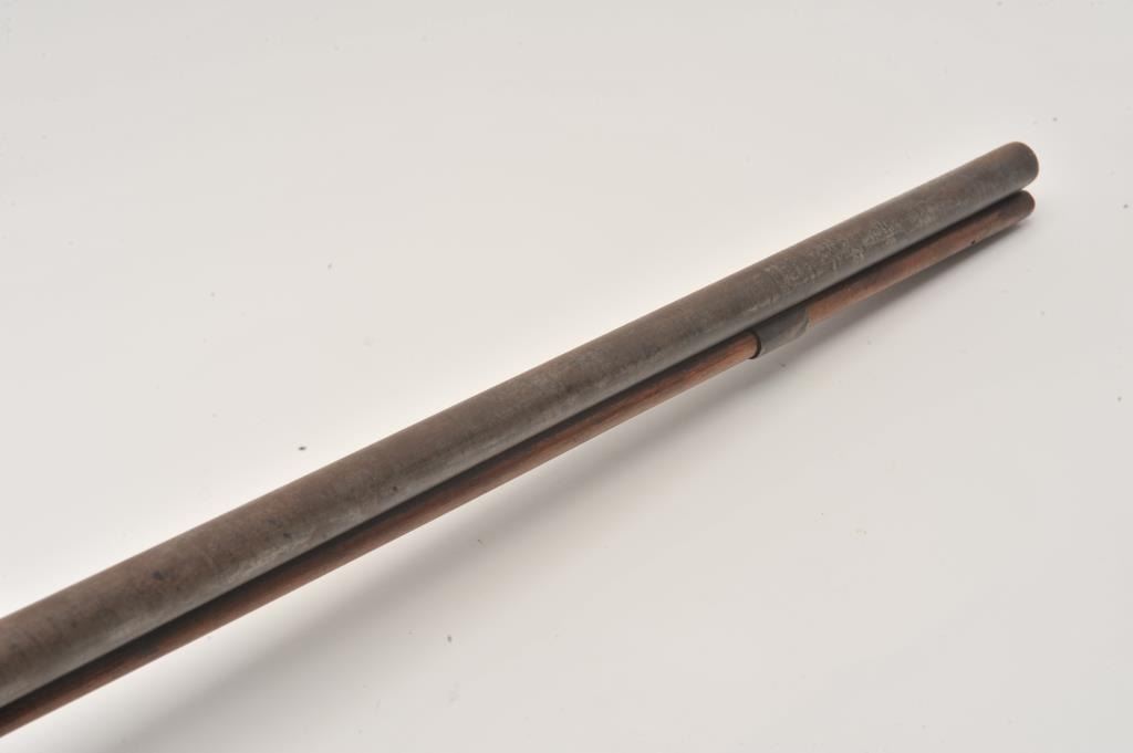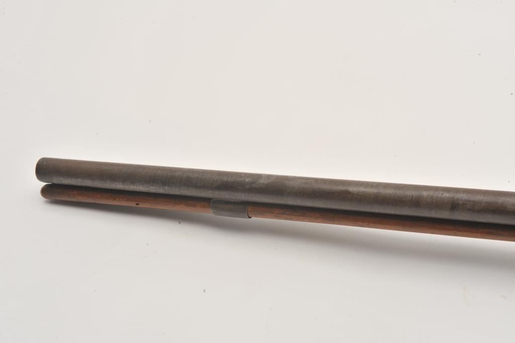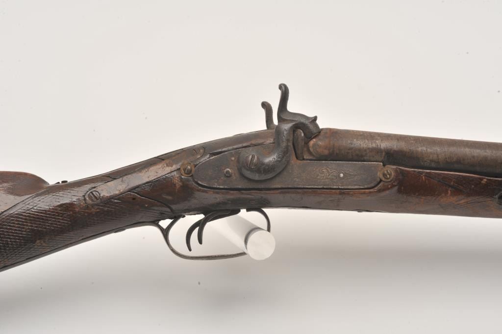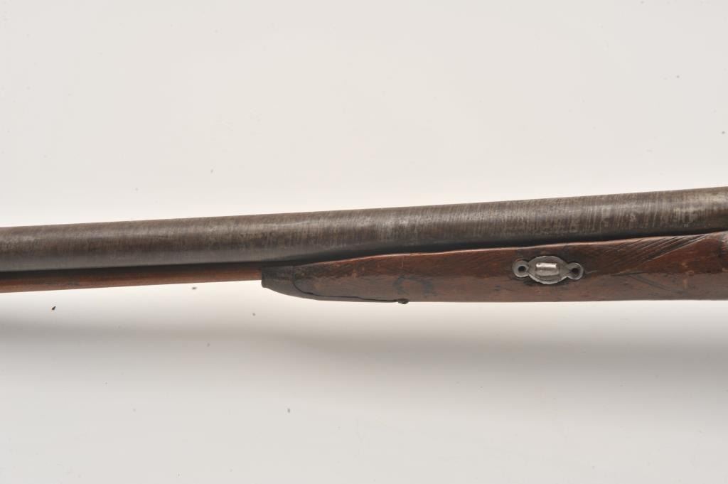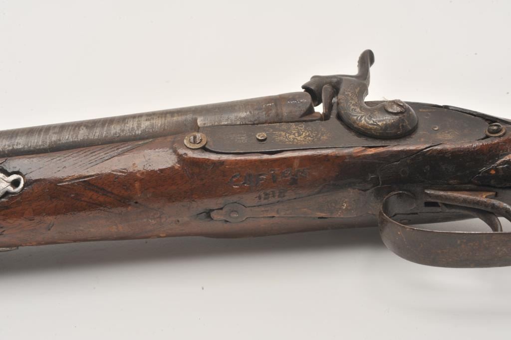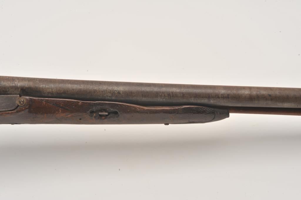 Percussion side by side 12 Ga shotgun, damascus barrels. Stock has several interesting hand inscriptions including Carson City 1887, LA 1887, and Winnepeg 1917 with 4 notches along the top cheek piece. Lot Title Fair to poor condition, old repair in stock, action not working, missing parts. A wall hanger. (Antique) Est $100-200