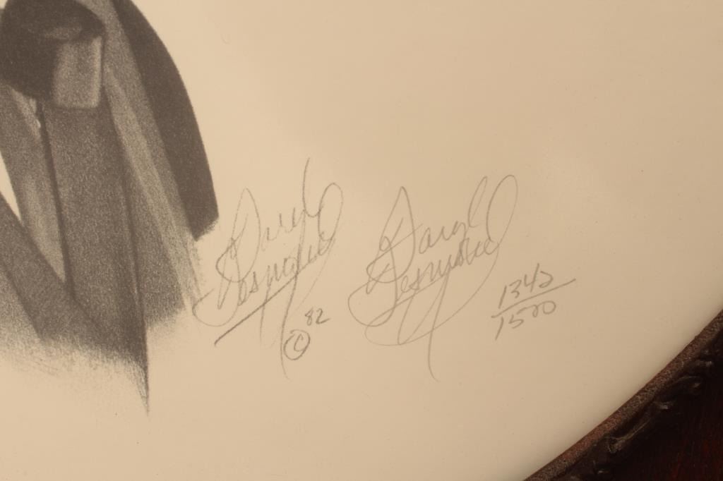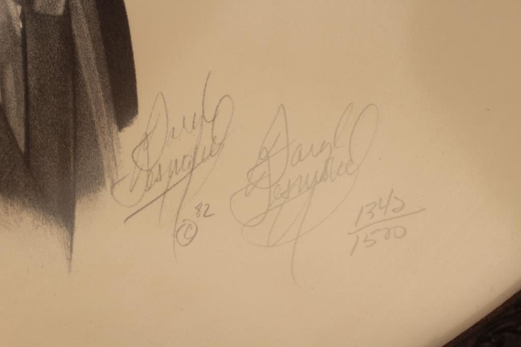 Beautiful signed print of John Wayne as the, “The Shootist”. The lithograph is marked, “82” and is double signed by the artist, Daryl Desmond. The lithograph is in very good overall condition and is number 1342 of Lot Title 1500 produced. The piece is nicely framed in a 22 x 26 period frame in good overall condition. Est.: $150-$300.