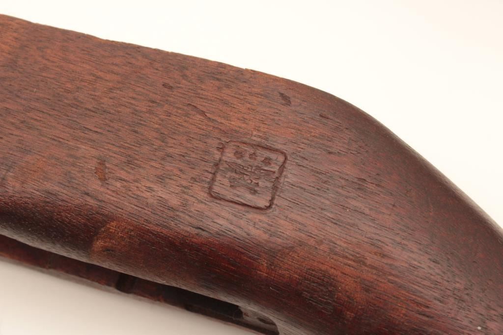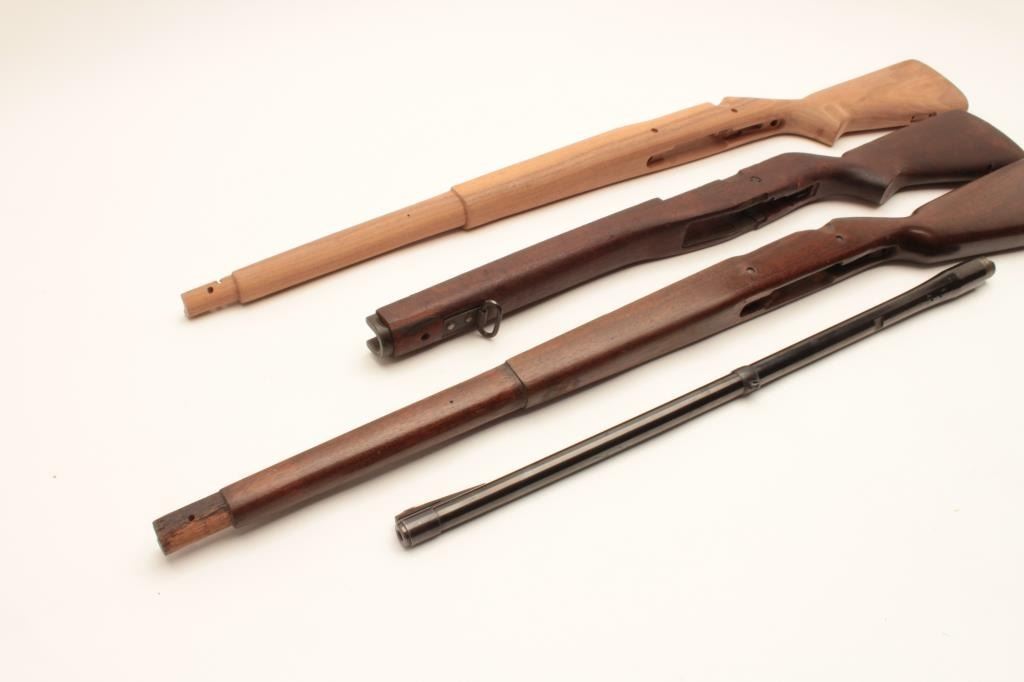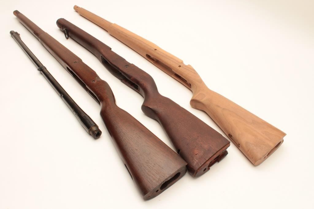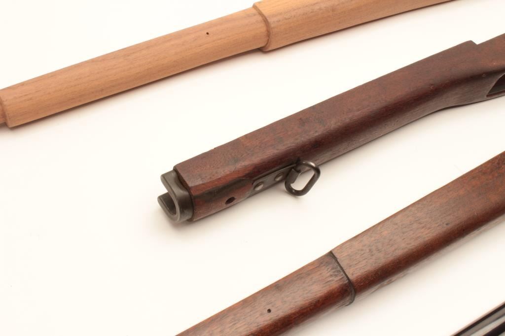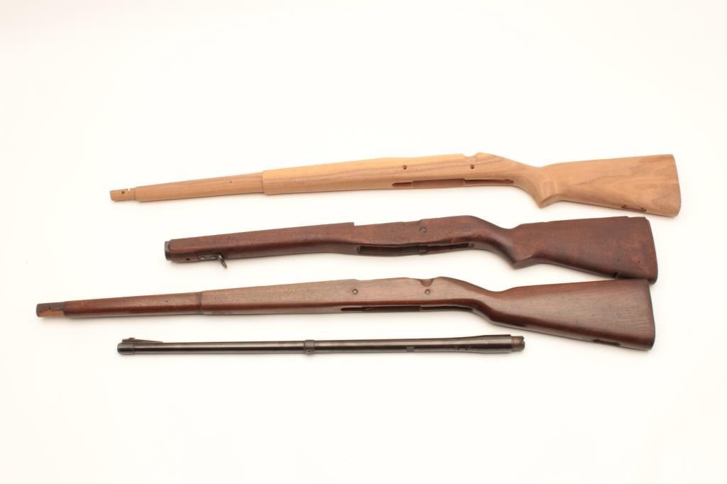 Parts lot with three military stocks and a barrel. The barrel is approximately 25” in length, .30 caliber in diameter with a banded ramp front sight and barrel band added. The bore is good and the majority of the blue Lot Title finished is retained. The stocks are two military styles one of which is newer and unfinished, the other older and having been finished. Both are in good condition. The third stock is a military M-14 issue with Lot Title nice cartouches in good condition with small mars and compressions from service use. Est.: $150-$300.