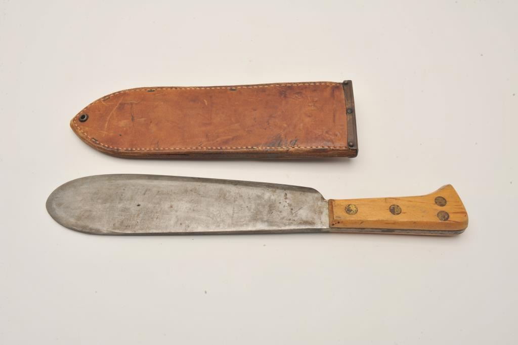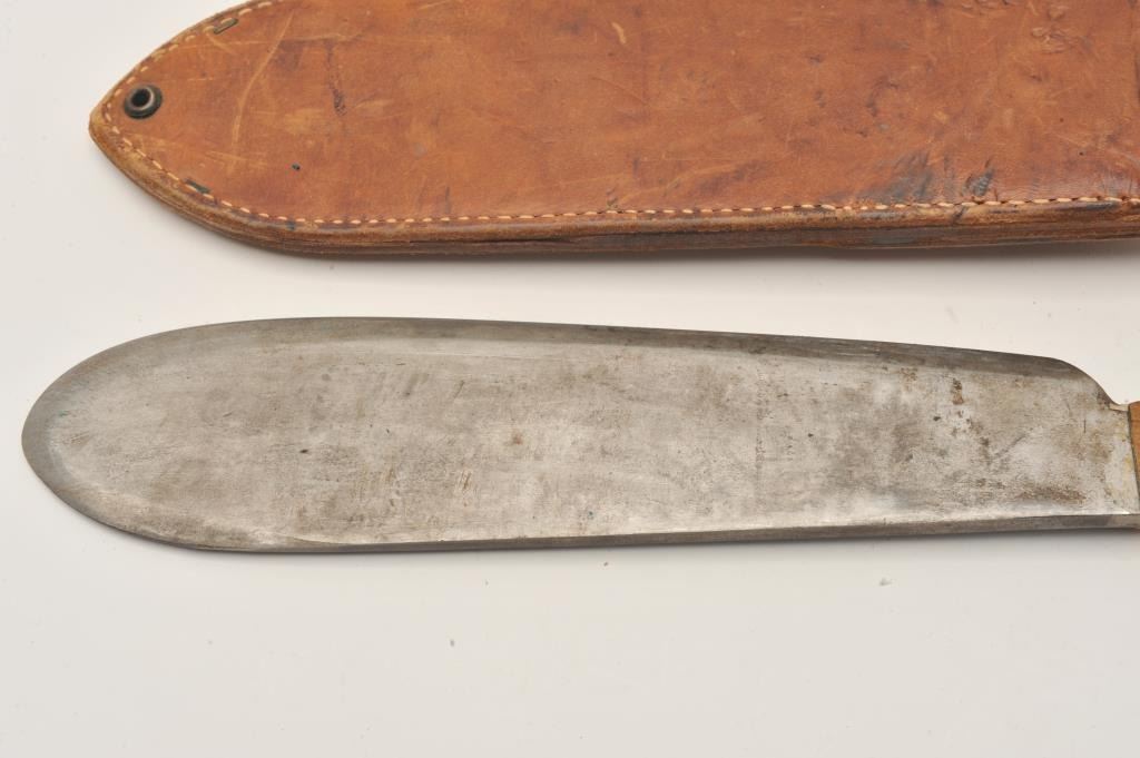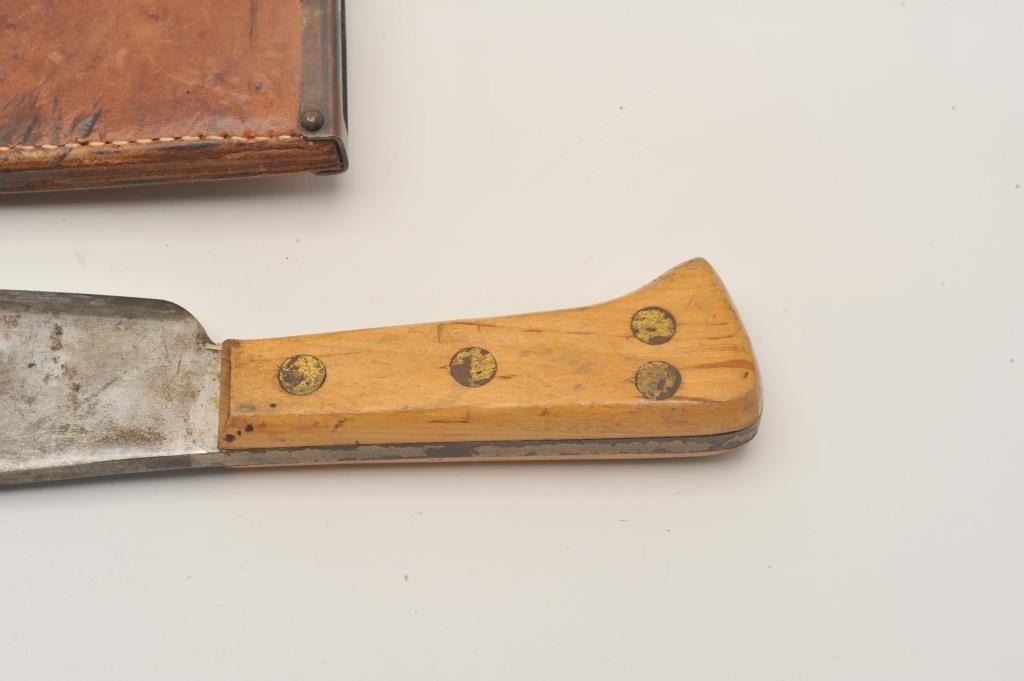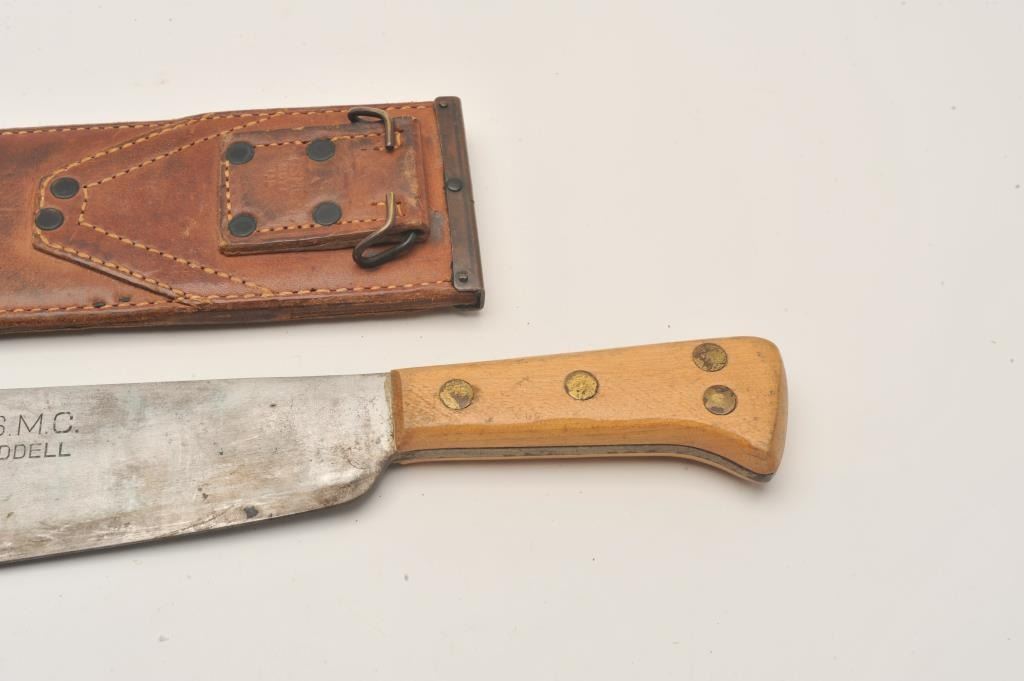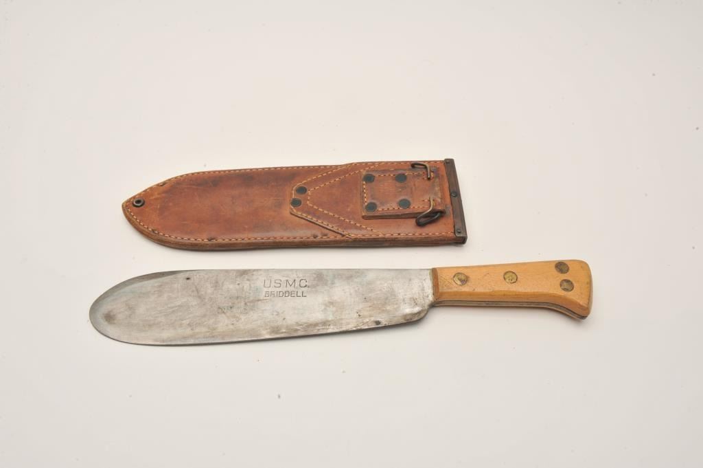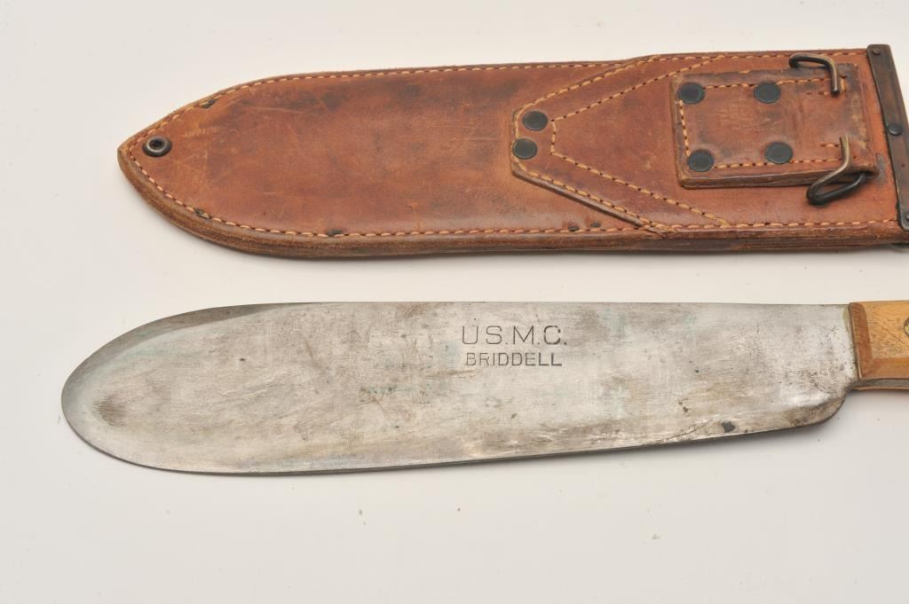 USMC Bolo knife marked, “BRIDDELL” with leather Boyt scabbard dated 1945. The knife and scabbard are both in very good condition. The knife is 16 ¼” in total length with an 11 ¼” blade. The blade shows sharpening and Lot Title some light surface rust while the wood handle is in good condition four brass pins showing light rust. The leather Boyt marked scabbard is in very good condition with small marks and scrapes with a brass frame at the Lot Title mouth and brass hanger intact. Est.: $100-$200.