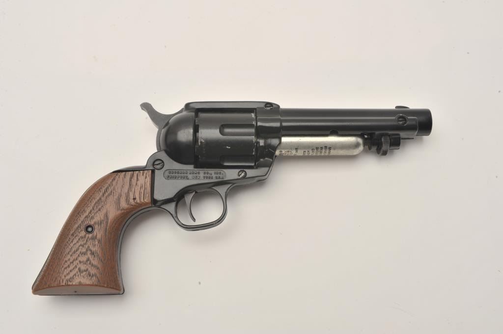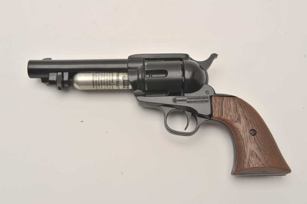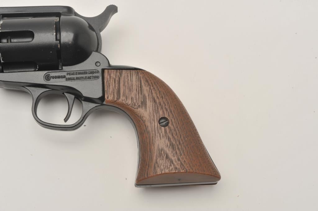 Crosman Peacemaker “44” CO2 pellet gun revolver, .22 caliber, Serial #NSNV. The pistol is in very good overall condition with a 4 ¾” barrel, black finish and plastic wood grain grips. The pistol is in the factory Lot Title cardboard box. Est.: $50-$100.