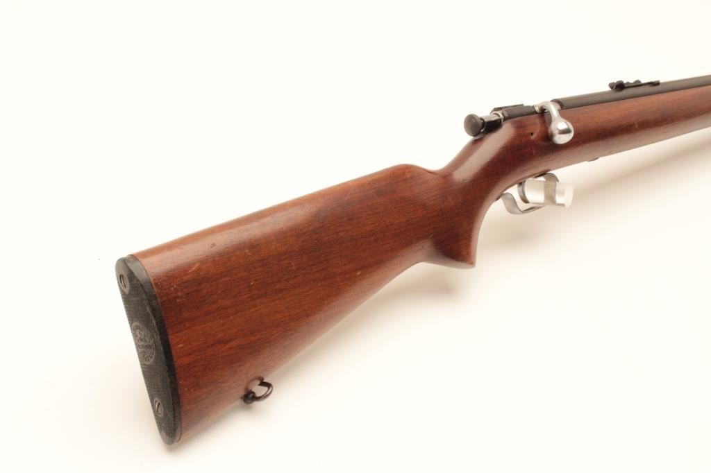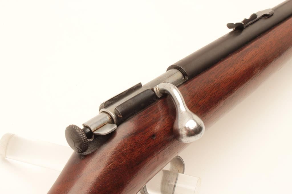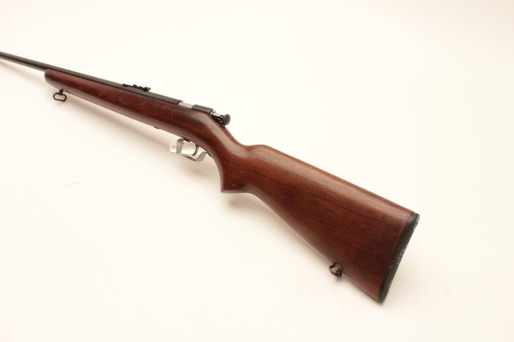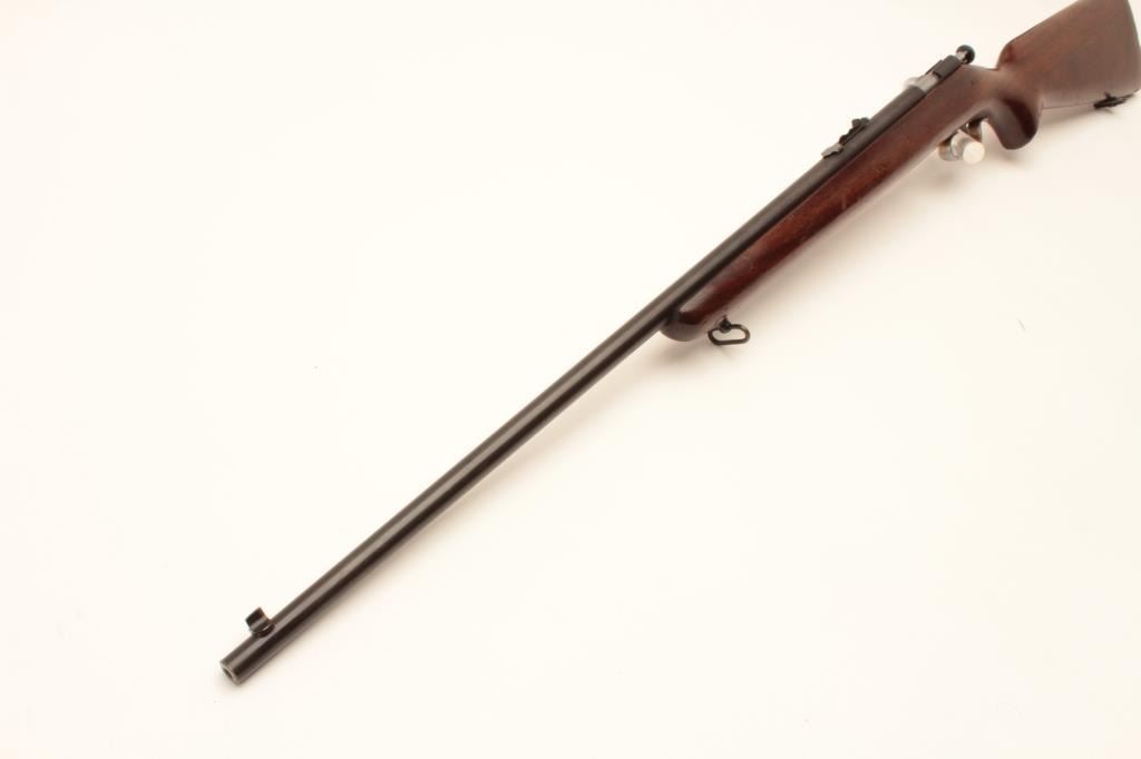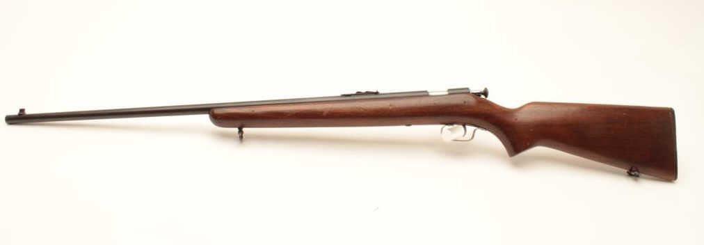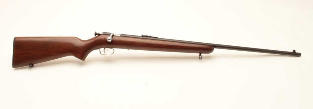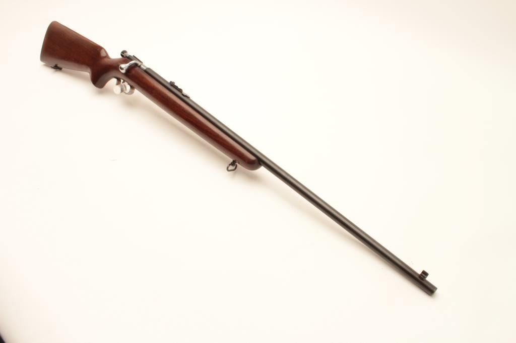 Winchester Model 67A single shot rifle, .22 caliber, Serial # NSNV. The rifle is in good overall condition with a 27” barrel. The metal surfaces retain the majority of their blue finish with small mars from carry and Lot Title use. The smooth wood stock is in good condition with small mars and compressions consistent with field use. The butt stock ends with a plastic, Winchester marked butt plate. The bore is good, the action is crisp Lot Title and markings are sharp. Est.: $100-$200. (C+R).