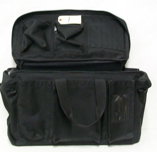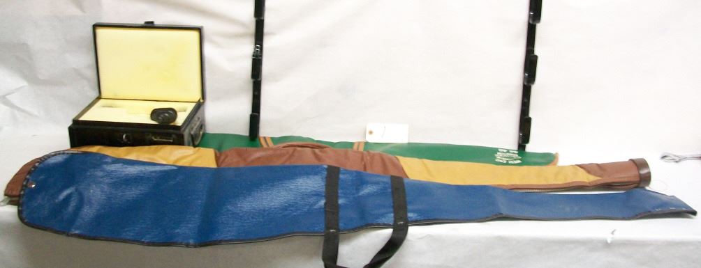 3 OLDER SOFT GUN CASES, METAL PISTOL LOCK BOX, BLACK WITH SCRATCHES AND PAINT FADING, MASTER TRIGGER LOCK WITH KEY, UNCLE MIKES RANGE BAG IN GOOD SHAPE