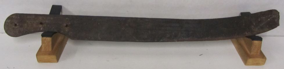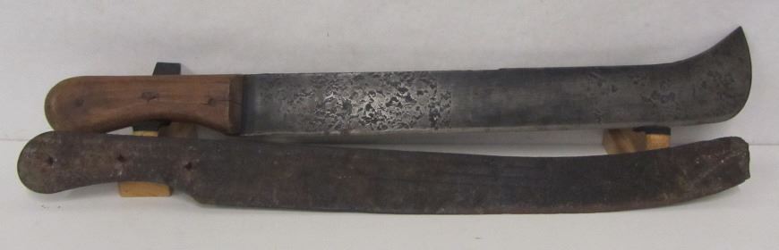 TWO VERY OLD MACHETTES, BOTH RUSTED BADLY. ONE MACHETTE STILL HAS SHARP EDGE AND GRIPS ON HANDLE, OTHER MACHETTE HAS DULLED AND IS MISSING GRIPS ON THE HANDLE.