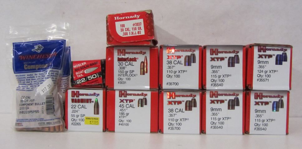 4 BOXES OF 100 HORNADY XTP 9MM 115GR BULLETS, 2 BOXES OF 100 HORNADY XTP 38CAL 110GR BULLETS, ONE BOX OF 100 HORNADY INTERLOCK 30CAL 150GR BULLETS, ONE BOX OF 100 HORNADY 45CAL 185GR BULLETS, ONE BOX OF 100 HORNADY