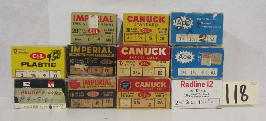 ONE BOX C-I-L PLASTIC 12GA 2 3/4" #9, ONE BOX FEDERAL CHAMPION 12GA #4, ONE BOX IMPERIAL SPECIAL LONG RANGE 20GA 2 3/4" #4, ONE BOX IMPERIAL SPECIAL LONG RANGE 16GA SMOKELESS #4, ONE BOX IMPERIAL SPECIAL LONG RANGE 16GA HAS RELOADED SHOTSHELLS INSIDE, ONE BOX REDLINE 12GA 2 3/4" #4.