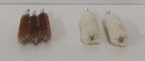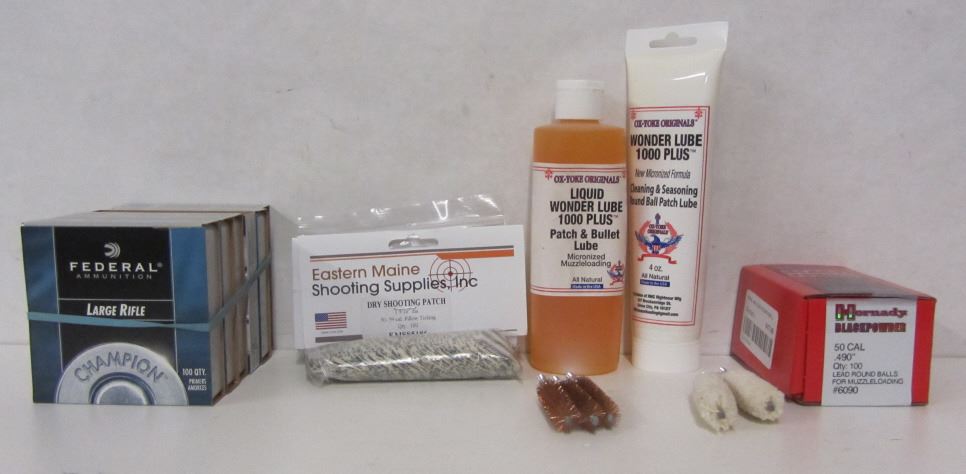 SIX BOXES OF FEDERAL CHAMPION LARGE RIFLE PRIMERS, THREE BAGS OF EASTERN MAINE 50CAL DRY SHOOTING PATCHES, ONE BOX OF HORNADY 50CAL LEAD ROUND BALLS, THREE CLEAING ROD BRUSH ENDS AND TWO CLEANING ROD BORE SWABS,