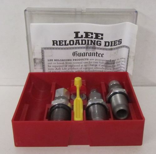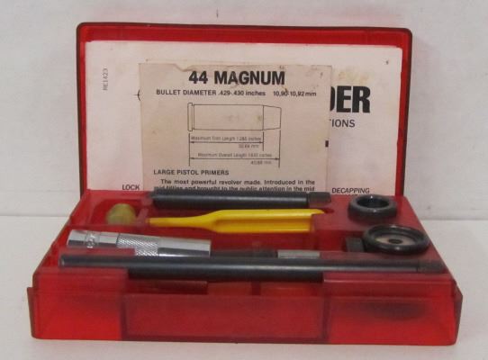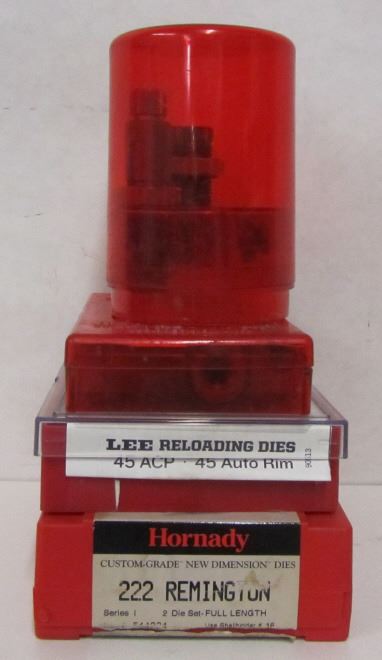 HORNADY 222REM TWO FULL SIZE DIE SET, LEE 45ACP THREE DIE SET, LEE 44MAG RELOADING KIT, LEE 30-30 RELOADING DIE SET, 9MM LASER BORE SIGHTER, POWDER MEASURE, WRENCH, ANTIQUE SHOTGUN CLEANING ROD, BOX OF 40S&W BRASS IN