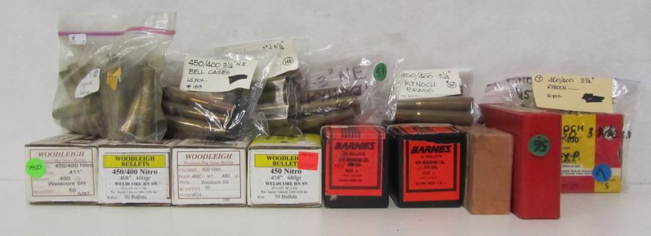 TWO BOXES OF WOODLEIGH 450NITRO .458" DIAM 480GR BULLETS, ONE BOX OF WOODLEIGH 450/400NITRO .411"DIAM 400GR BULLETS, ONE BOX OF WOODLEIGH 450/400NITRO .408"DIAM 400GR BULLETS, TWO BOXES OF BARNES 458MAG .455"DIAM KYNOCH, BAG OF 450/400 BELL BRASS, BAG OF 20 PIECES 450 #1 EXPRESS BRASS, BAG OF 5 PIECES 400 KYNOCH BRASS, BAG WITH TWO BOXES OF 5 PIECES 450/400 KYNOCH BRASS.