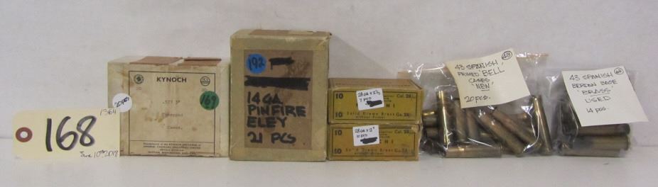 ONE BOX OF .577 3" KYNOCH BRASS 20 PIECES, ONE BOX OF 14GA PINFIRE ELEY SHELLS 21 PIECES, TWO BOXES GIULIO FIOCCHI 28GA 2" BRASS SHOTSHELLS ONE BOX 10 PIECES OTHER BOX 7 PIECES 17 PIECES TOTAL, ONE BAG 43 SPANISH