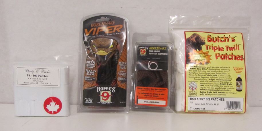 VIPER BORESNAKE IN 270CAL/7MM, BORESNAKE IN 6MM/243CAL, "PLENTY O' PATCHES" BAG OF 500 PATCHES 6 & 7MM R .32CAL B, BUTCH'S TRIPLE TWILL BAG OF 1000 PATCHES (OPENED WITH SOME MISSING) IN 243CAL/6MM 1.5".