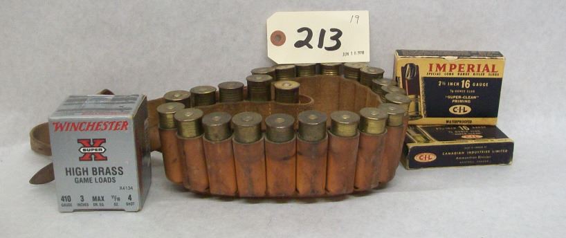 23 ROUNDS OF 12 GA 2 3/4 #5 iMPERIAL LEAD IN AN OLDER LEATHER SHOTGUN BELT WITH NO RIPS OR SERIOUS ROT, 24 ROUNDS WINCHESTER 3 INCH #4 .410, 10 ROUNDS 16 GAUGE IMPERIAL SLUGS.
