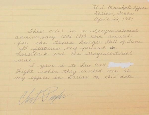 Lot 65 Texas Ranger Captain Clint Peoples Coin & Letter