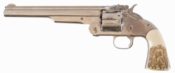 Early gun with oil hole in the barrel. Gun has a later nickel finish that rates at 95%.. Gun is all matching. Nice clear markings. carved Mexican eagle with snake.
