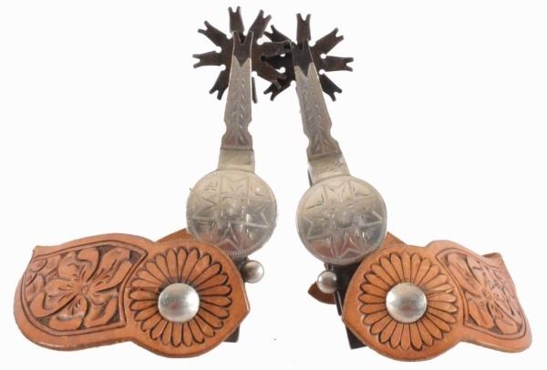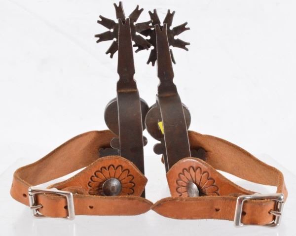 Single mounted. 3/4" Heek bands, 2-1/4" straight shanks, 8 point rowels, floral carved straps by D&D Tucson, AZ, marked L&M on shanks