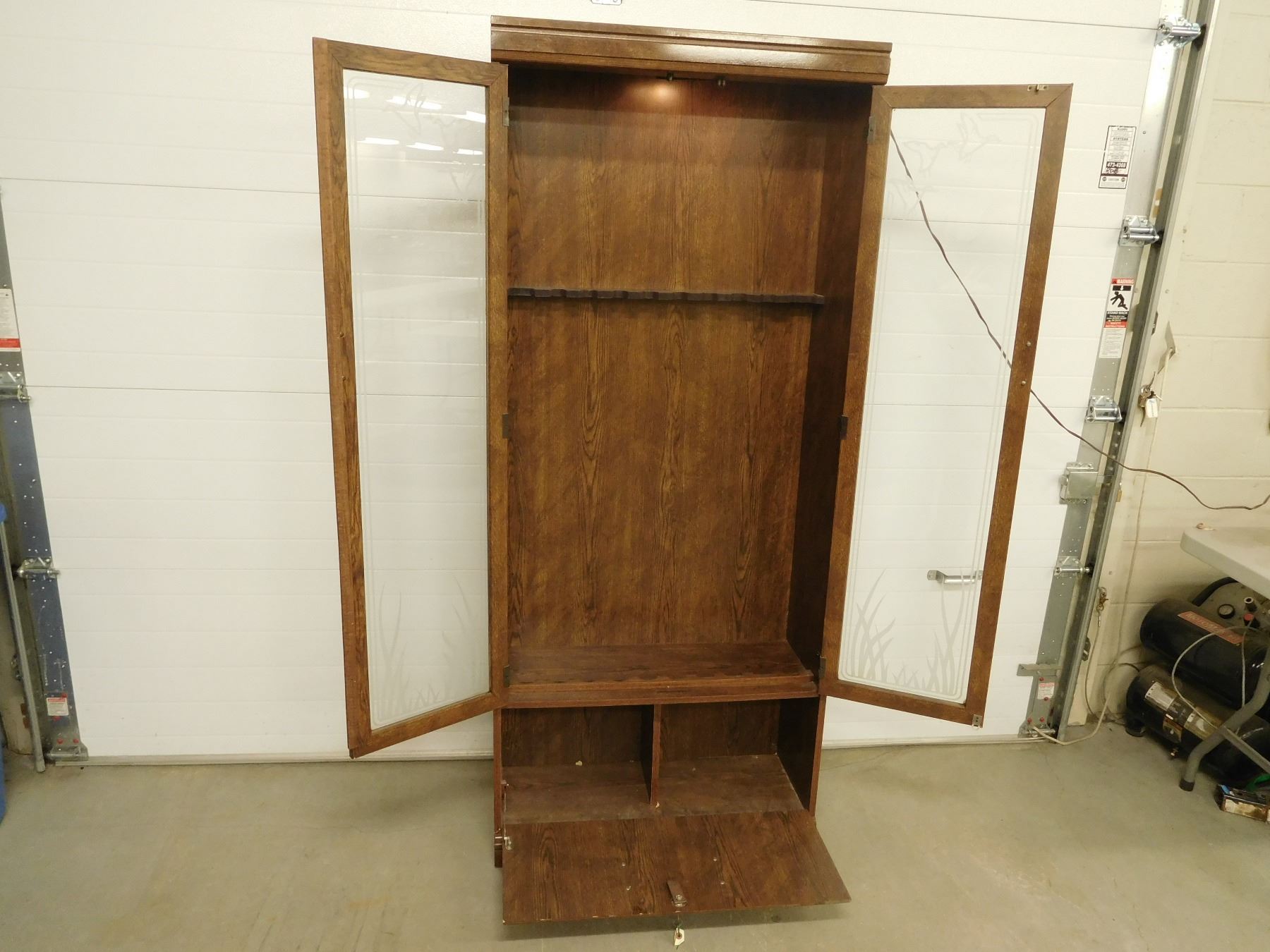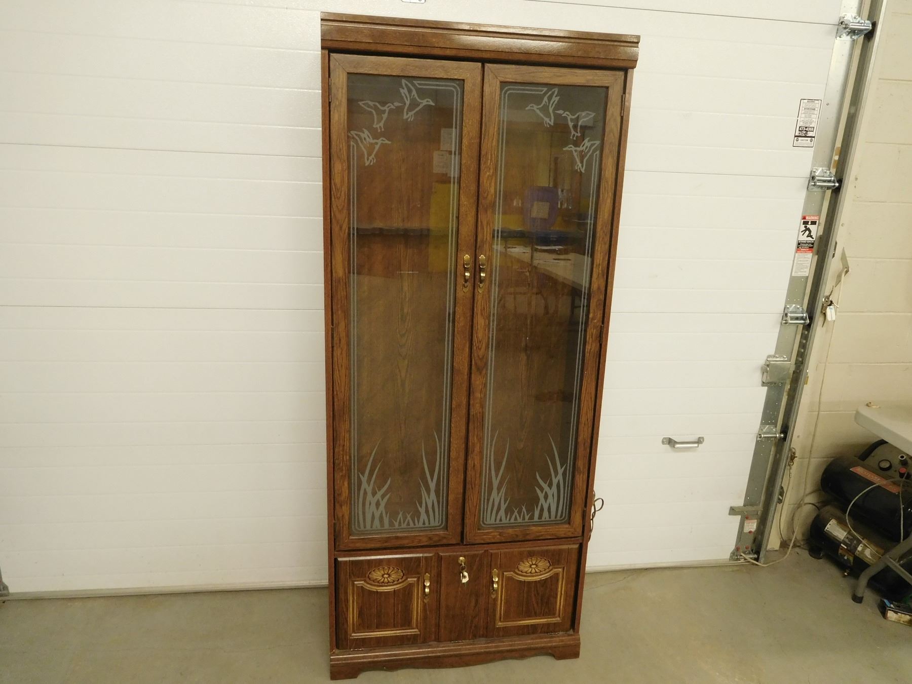 APPROX 71" X 30" X 11" HAS LIGHTS, GLASS HAS DUCK SCENE ON IT, THERE IS A WOODEN SLOTTED BAR FOR FIREARMS, AND LOWER DOORS, NO SHIPPING ON THIS ITEM