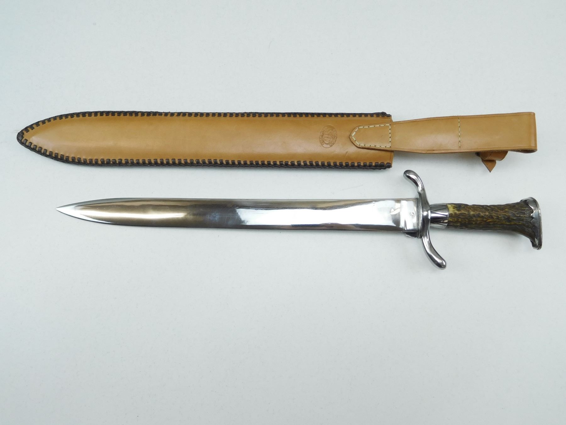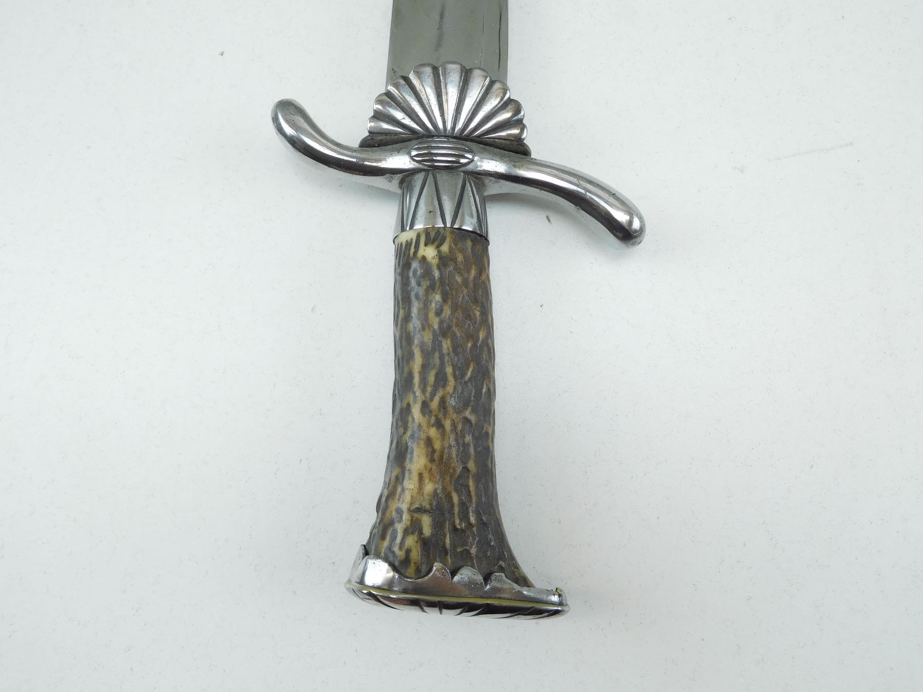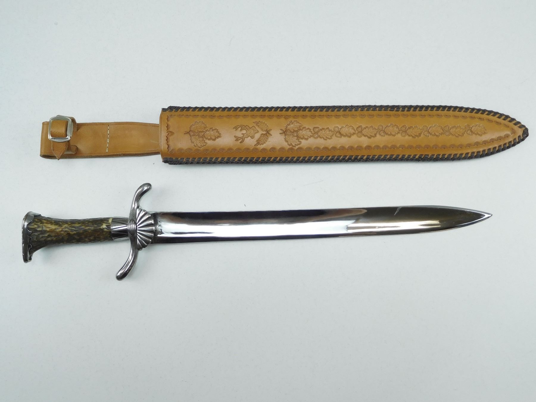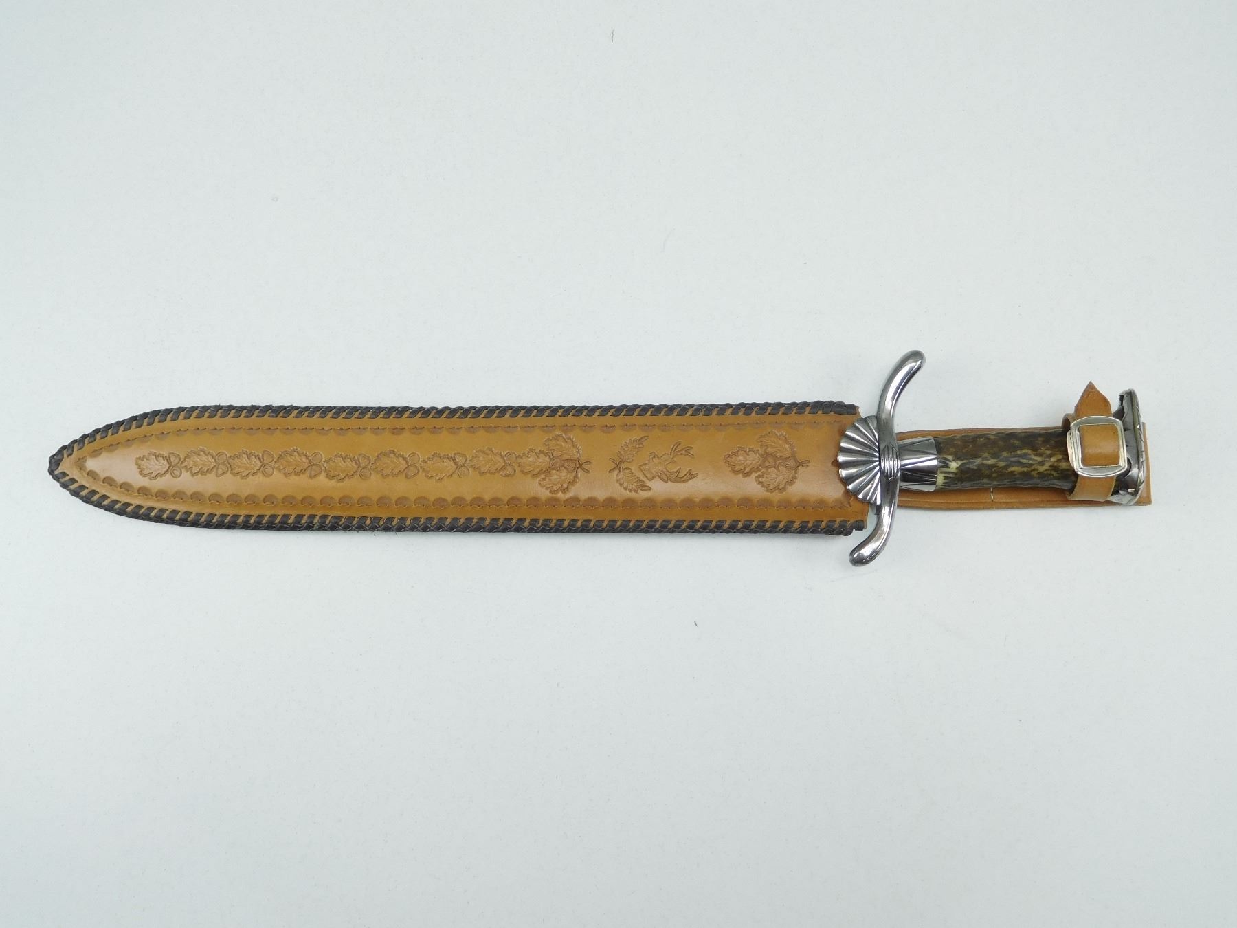 SINGLE SIDE BLADE WITH SHELL SHAPED GUARD & ANTLER GRIP, DECORATIVE HUNTING LEATHER SCABBARD MARKED LEATHER SID HAND MADE