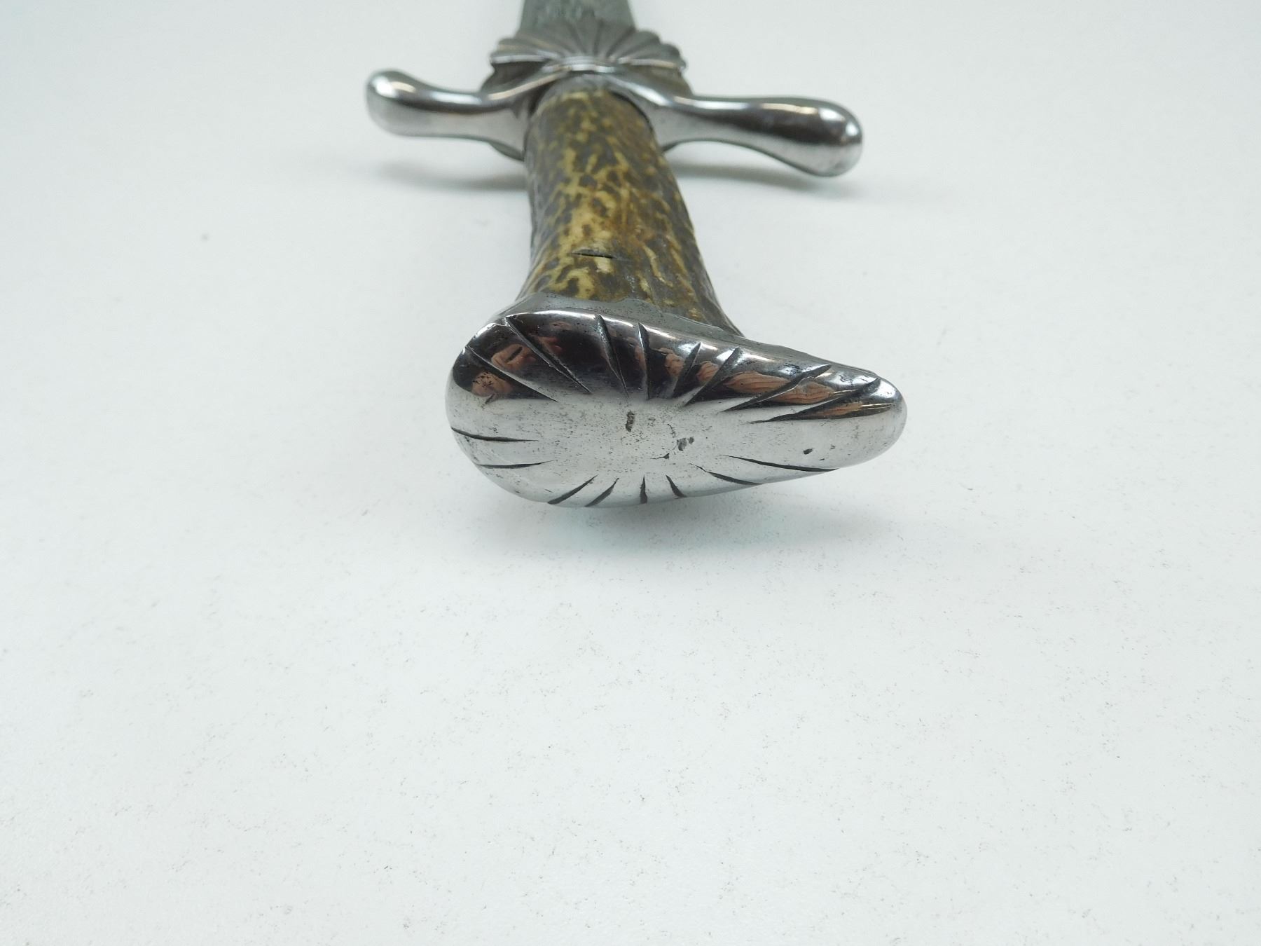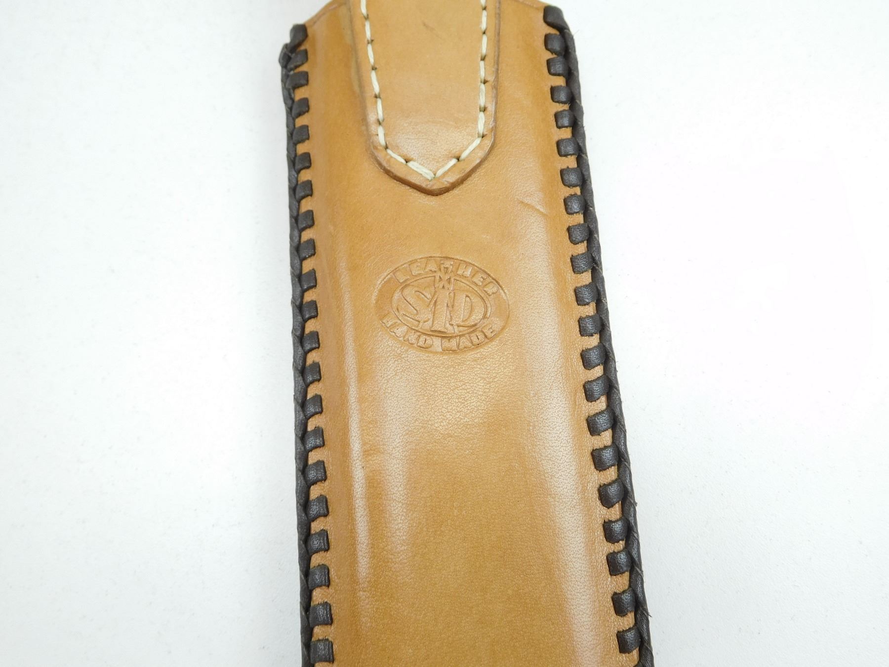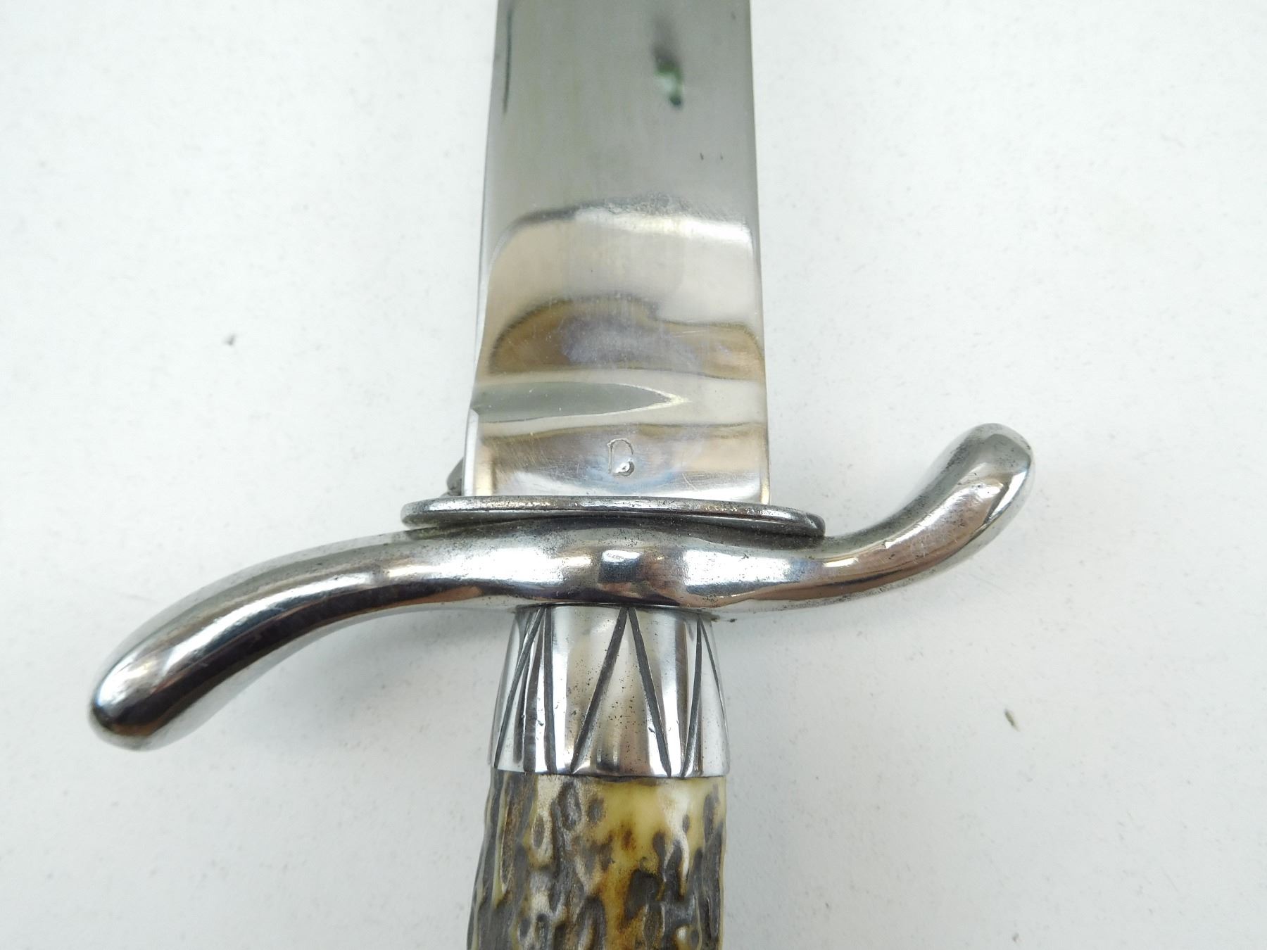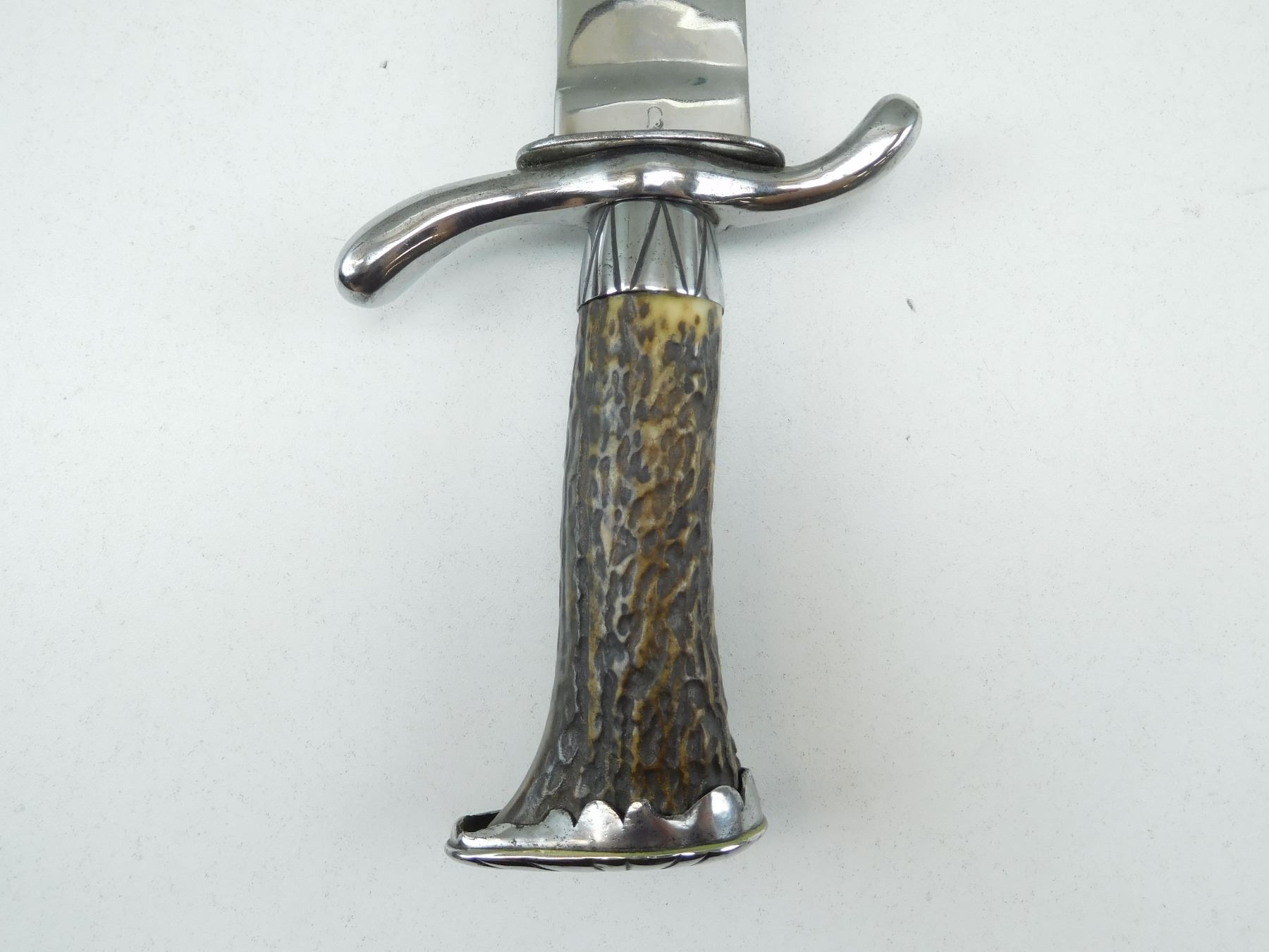 SINGLE SIDE BLADE WITH SHELL SHAPED GUARD & ANTLER GRIP, DECORATIVE HUNTING LEATHER SCABBARD MARKED LEATHER SID HAND MADE